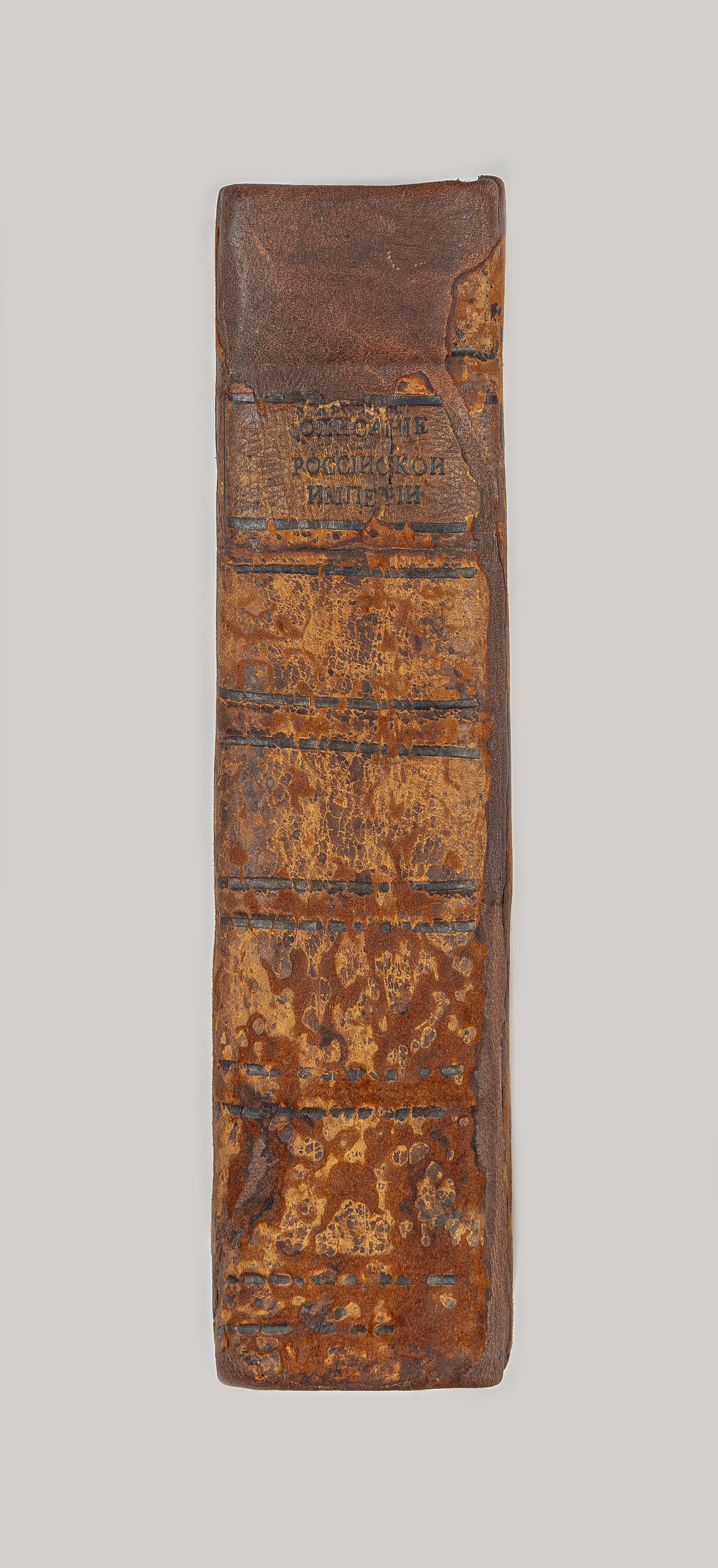 Книга в полукожаном владельческом переплете. Крышки переплета обтянуты бумагой с рисунком «павлинье перо». Обрез тонированный. Бумага верже.