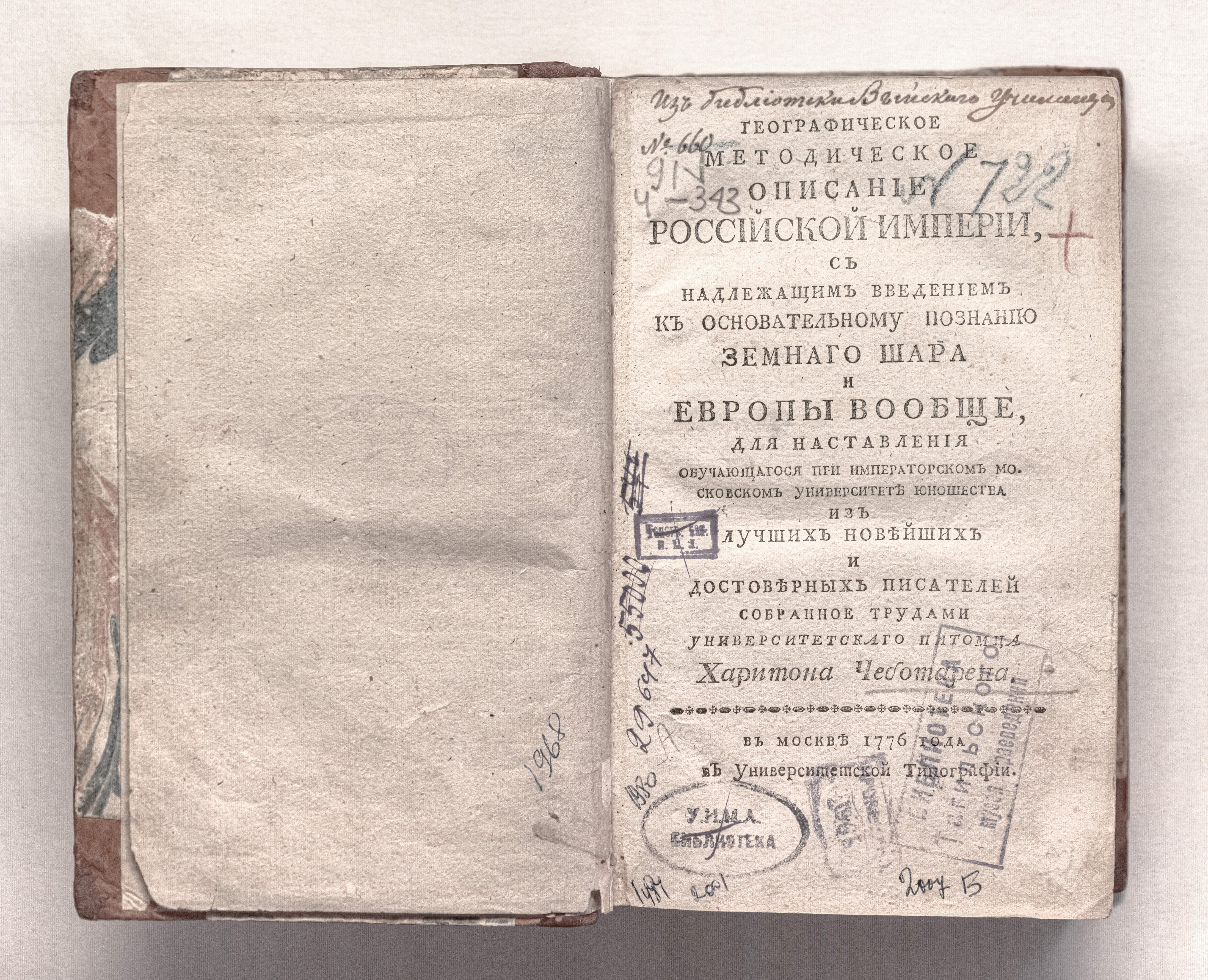 Чеботарев, Харитон Андреевич (1746-1815). Географическое методическое описание Российской империи, с надлежащим введением к основательному познанию земнаго шара и Европы вообще, для наставления обучающегося при Имп. Московском университете юношества… / Харитон Андреевич Чеботарев – Москва : Универ. тип., 1776. – [18], 540 с. ; 20,5х13 см.