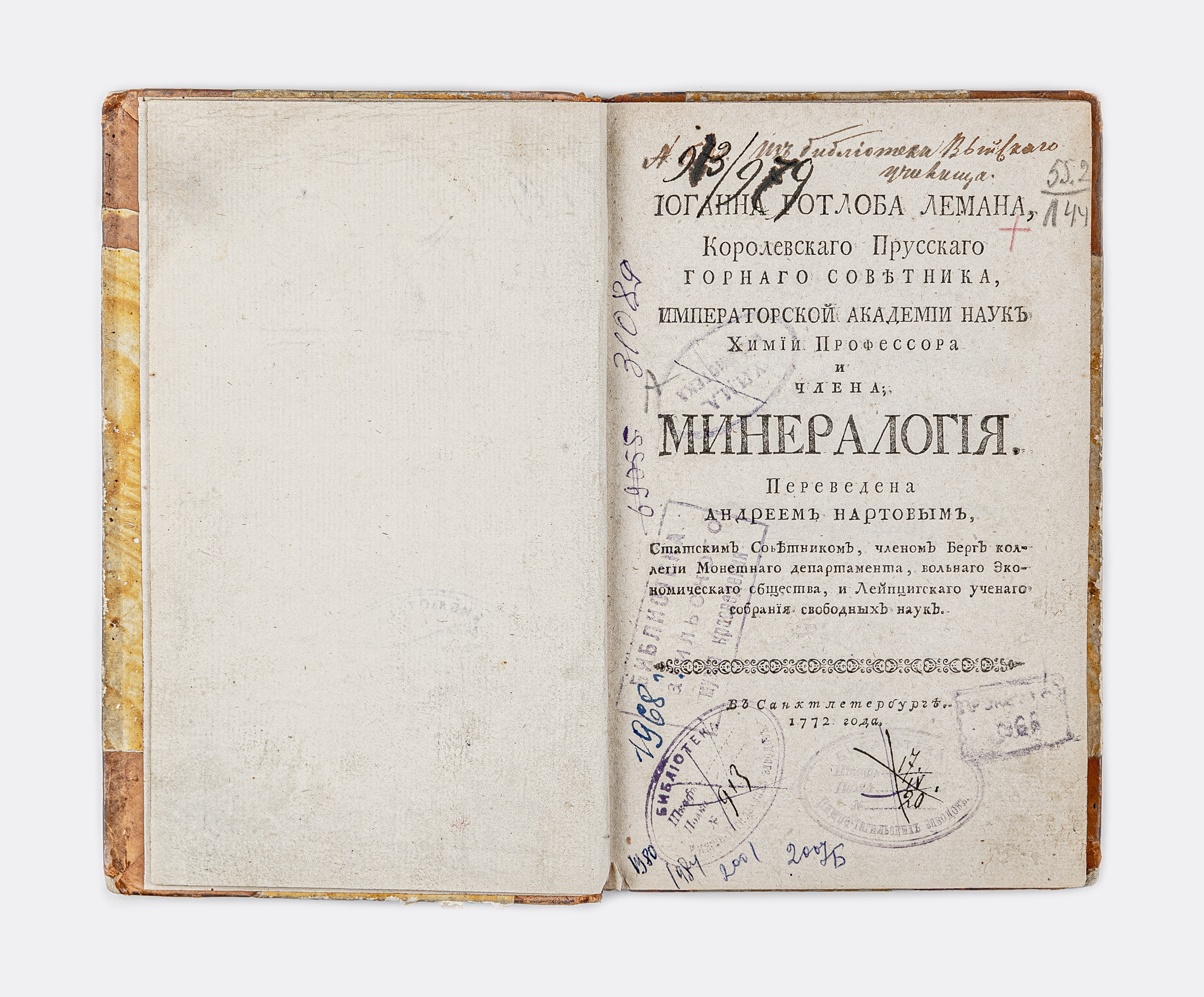 Леман, Иоганн Готлоб (1719-1767). Иоганна Готлоба Лемана, королевскаго прусскаго горного советника, Имп. Академии наук химии профессора и члена Минералогия. Переведена Андреем Нартовым, статским советником, членом Берг-коллегии Монетнаго департамента, Вольнаго экономическаго общества, и Лейципскаго собрания свободных наук / Иоганн Готлоб Леман – Санкт-Петербург : [тип. Акад. наук], 1772. – [8], 141, [1] с. ; 20х12,5 см.