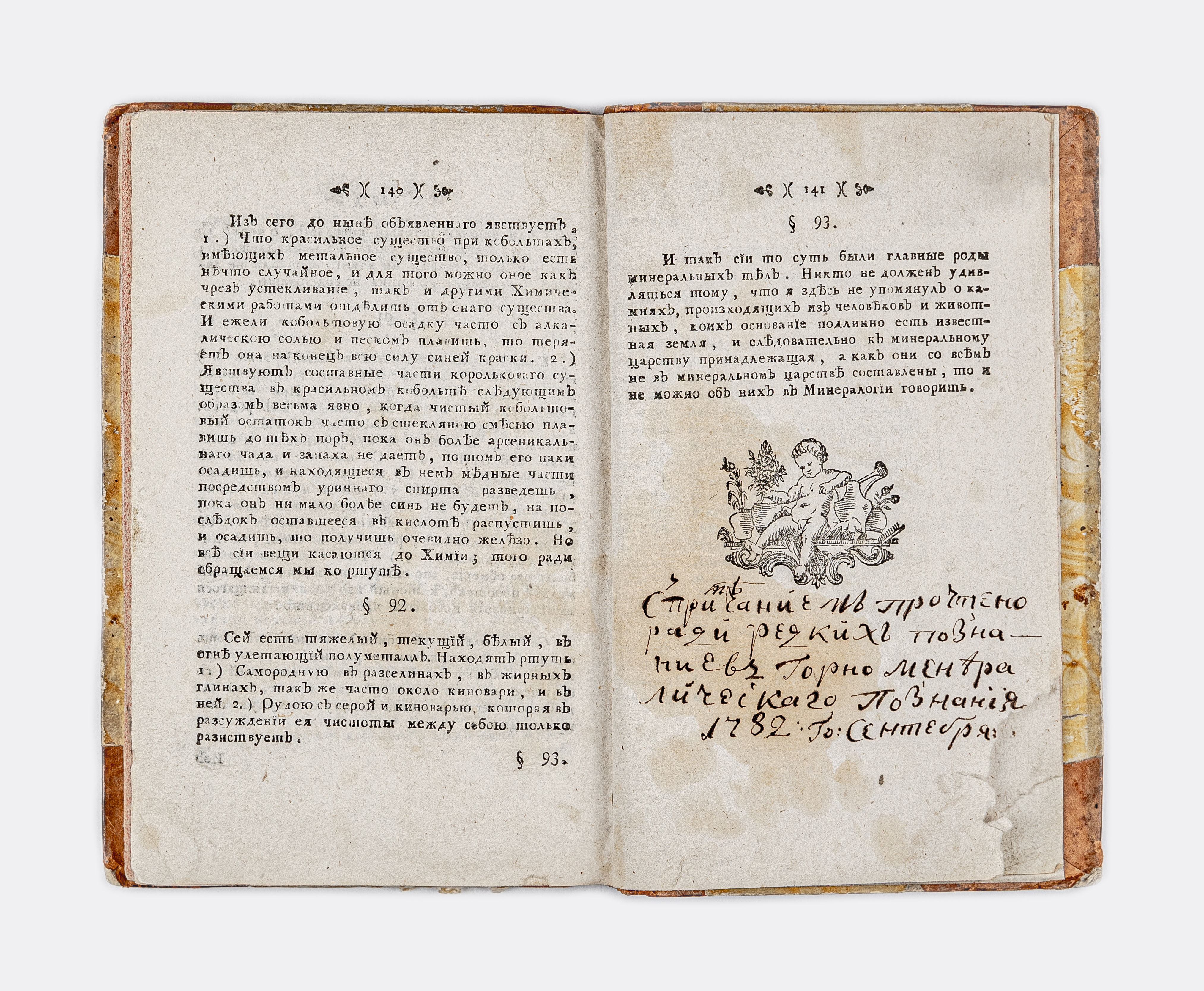 «С примечанием прочтено ради редких познаниев горно менералическаго познания 1782-го сентебря» (почерком Н.А. Демидова, с. 141).