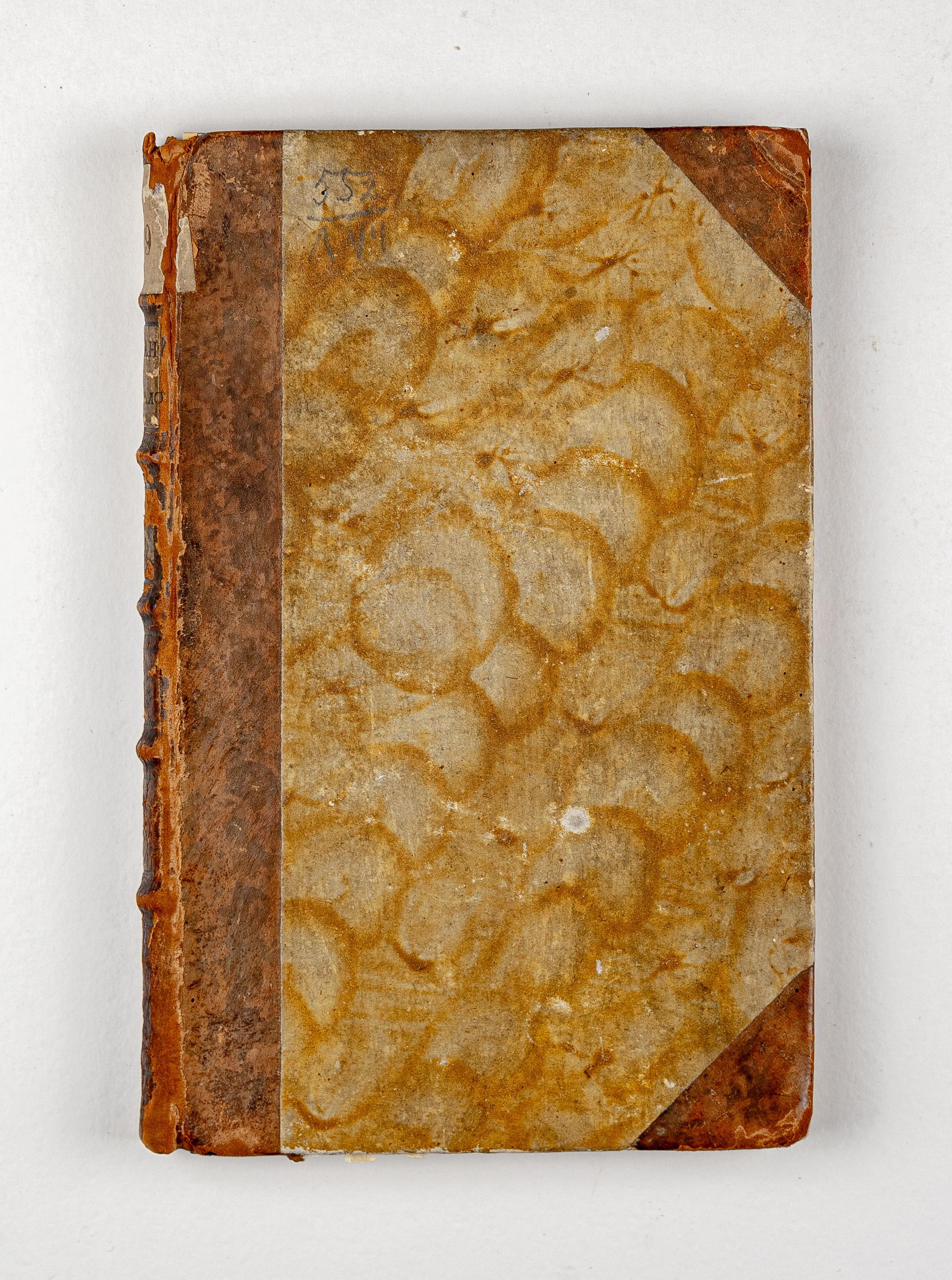 Книга в полукожаном владельческом переплете. Крышки переплета обтянуты бумагой с рисунком «под мрамор». Обрез тонированный. Бумага верже. Водяной знак (форзац).