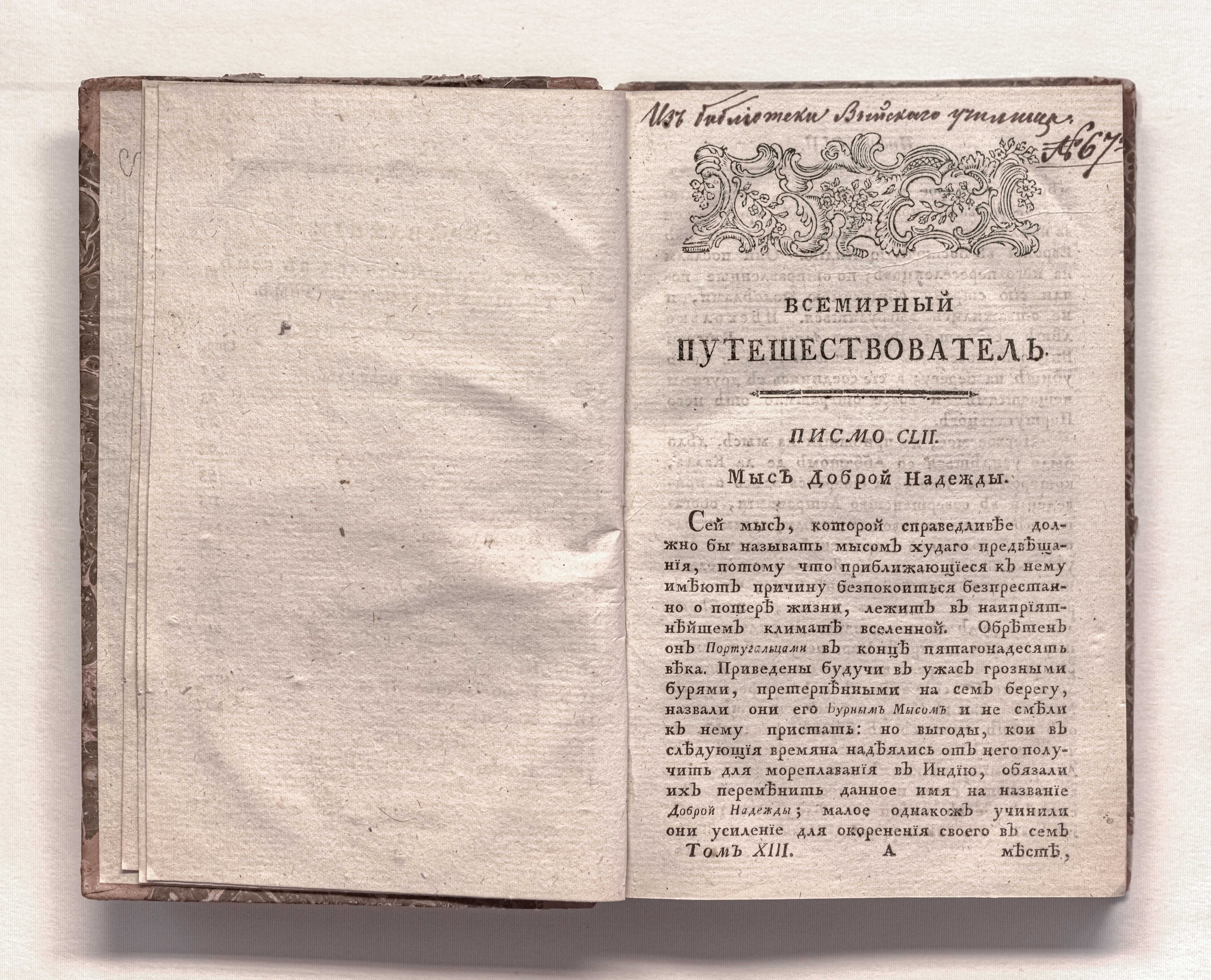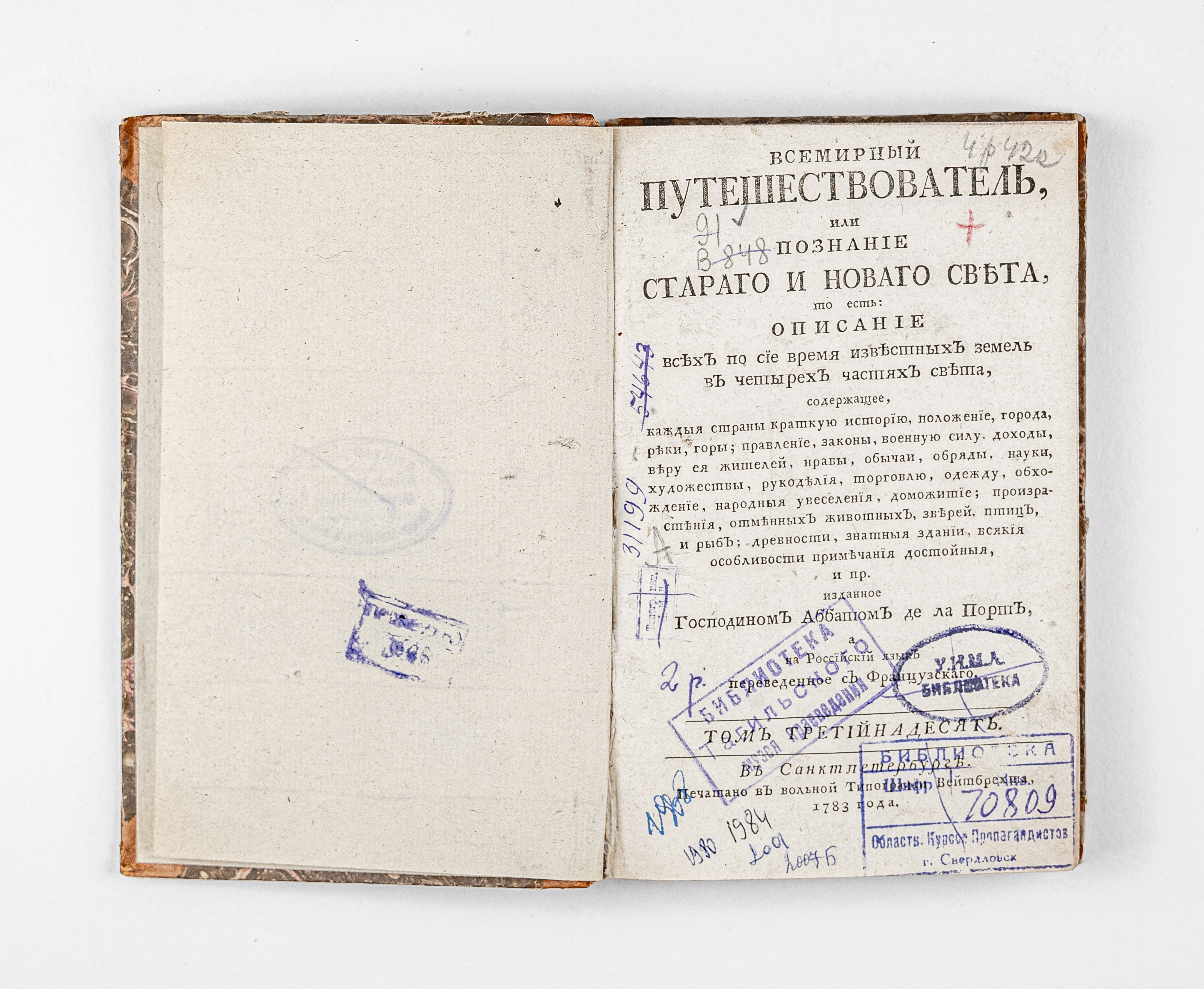 Ла Порт, Жозеф де (1713-1779). Всемирный путешествователь, или Познание Стараго, и Новаго света, то есть : описание по сие время известных земель в четырех честях света… изданное господином аббатом де ла Порт, а на российский язык переведенное с французскаго [Я. И. Булгаковым] / Жозеф де Ла Порт. Т. 1-27. – Санкт-Петербург : тип. Вейтбрехта и Шнора, 1778-1794.