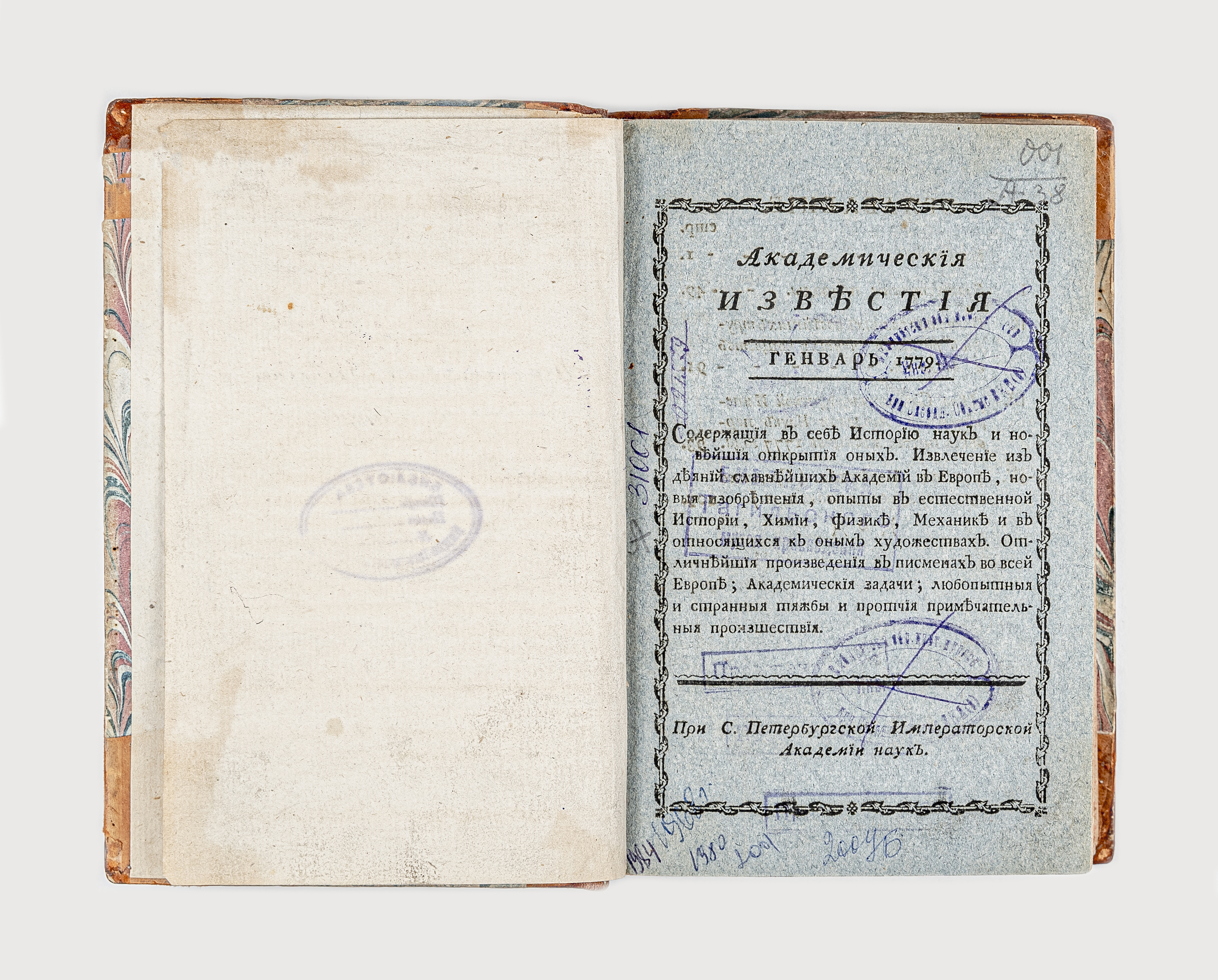 Академические известия на 1779 год [Месяц генварь-апрель], содержащия в себе историю наук и новейшия открытия оных… Ч. 1. – [Санкт-Петербург]. : при С. Петерб. Имп. Акад. Наук. [1779-1781]. – [8], 412 с. ; 20х13 см.