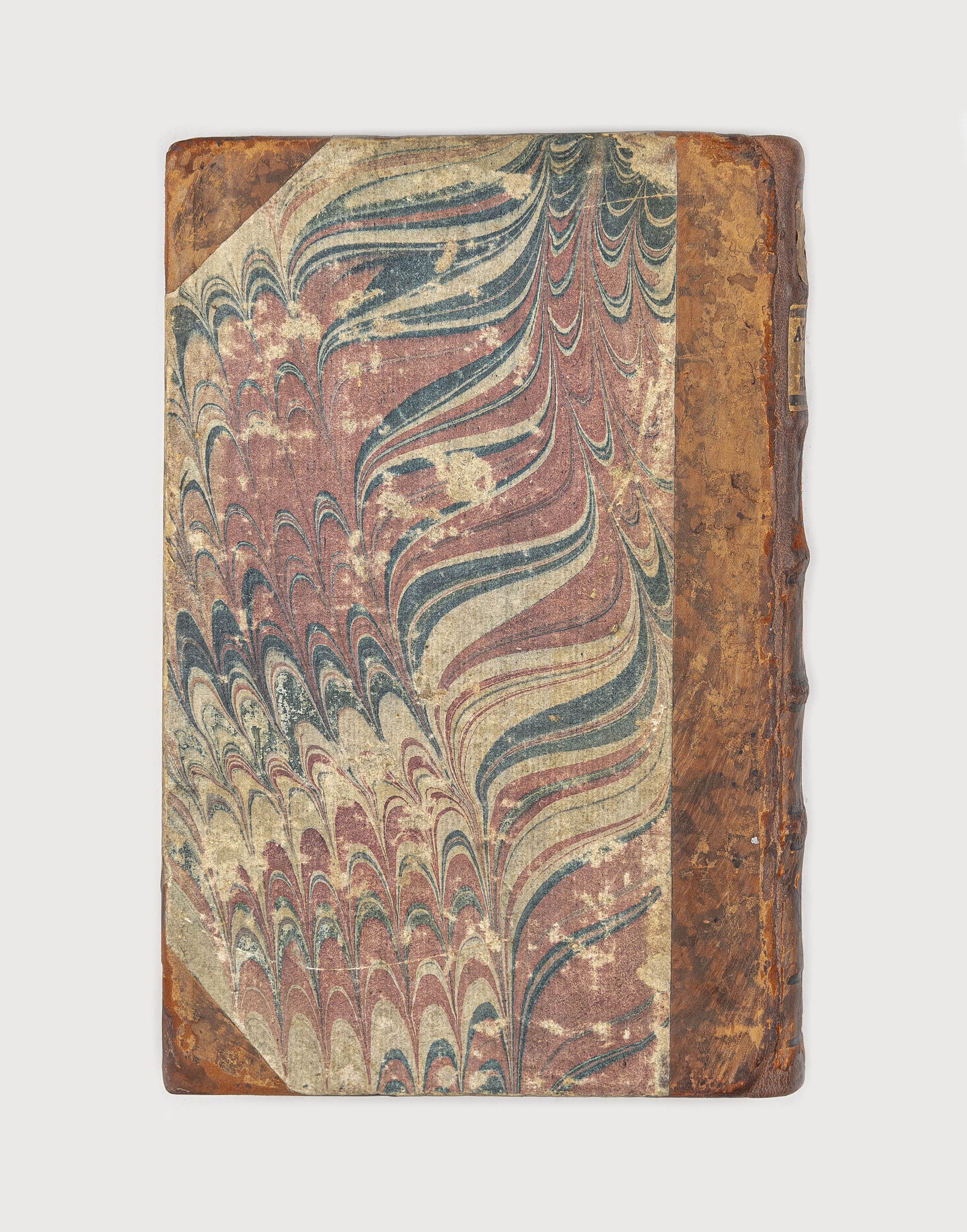 Книга в полукожаном владельческом переплете. Крышки переплета обтянуты бумагой с рисунком «павлинье перо». Обрез тонированный. Бумага верже с водяными знаками (форзац).