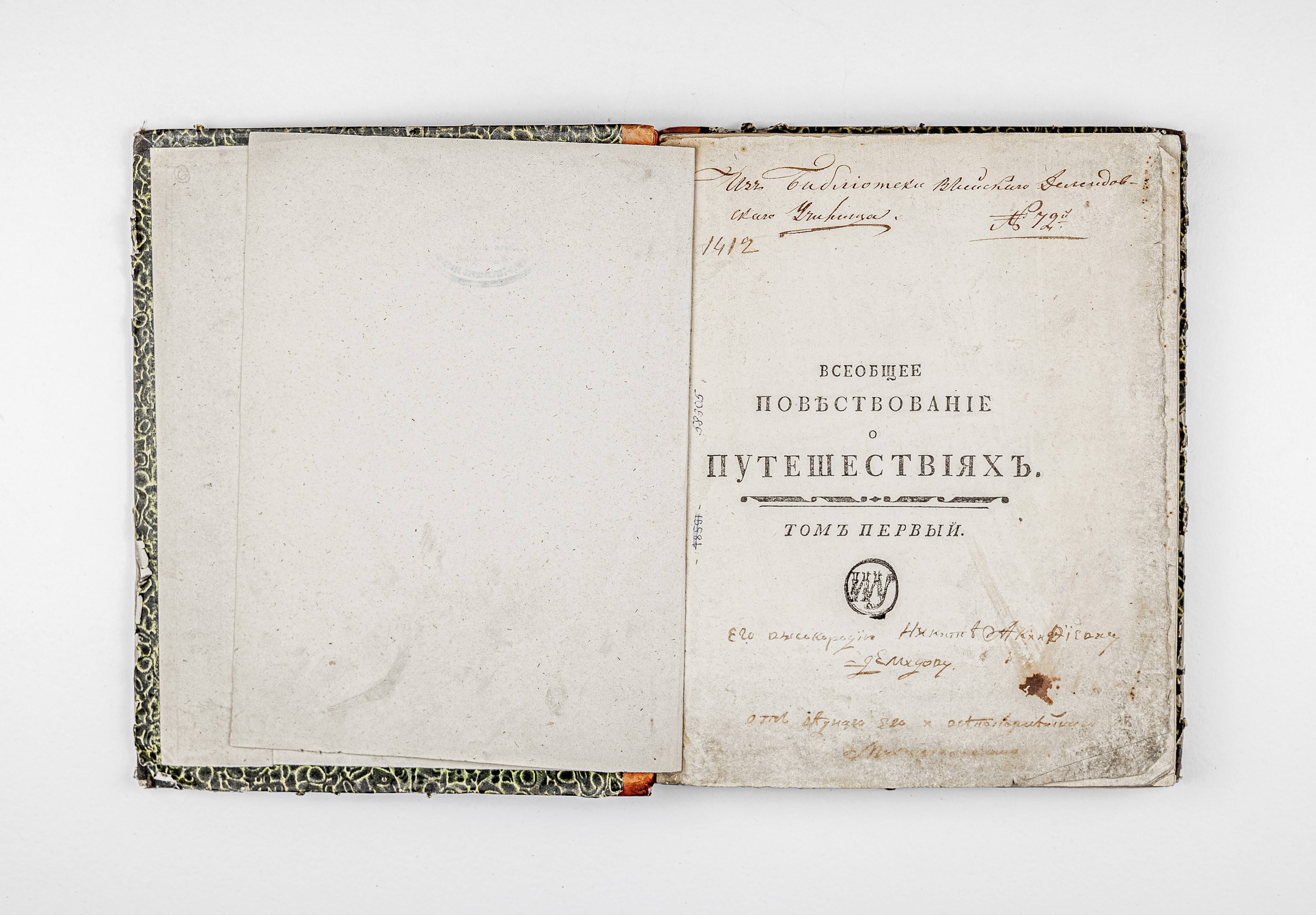 «1412. Всеобщее повеств. путешест.» (на корешке перепл.).
