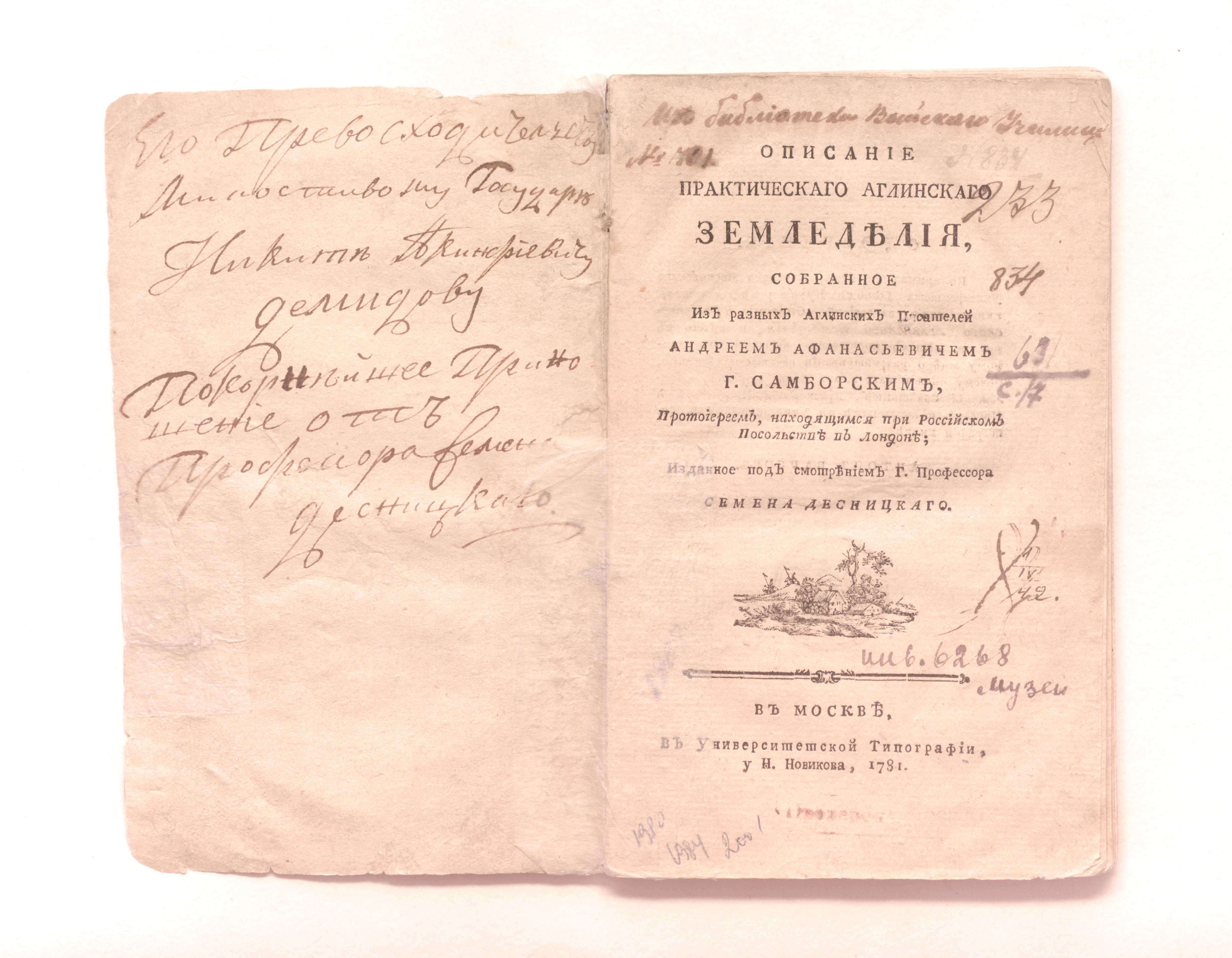 Описание практическаго аглинскаго земледелия / собранное из разных аглинских писателей Андреем Афанасьевичем г. Самборским, протоиереем, находящимся при Российском посольстве в Лондоне ; изданное под смотрением г. профессора Семена Десницкаго. — Москва : Унив. тип., у Н. Новикова, 1781. — 88 с. ; 20х12,5 см.