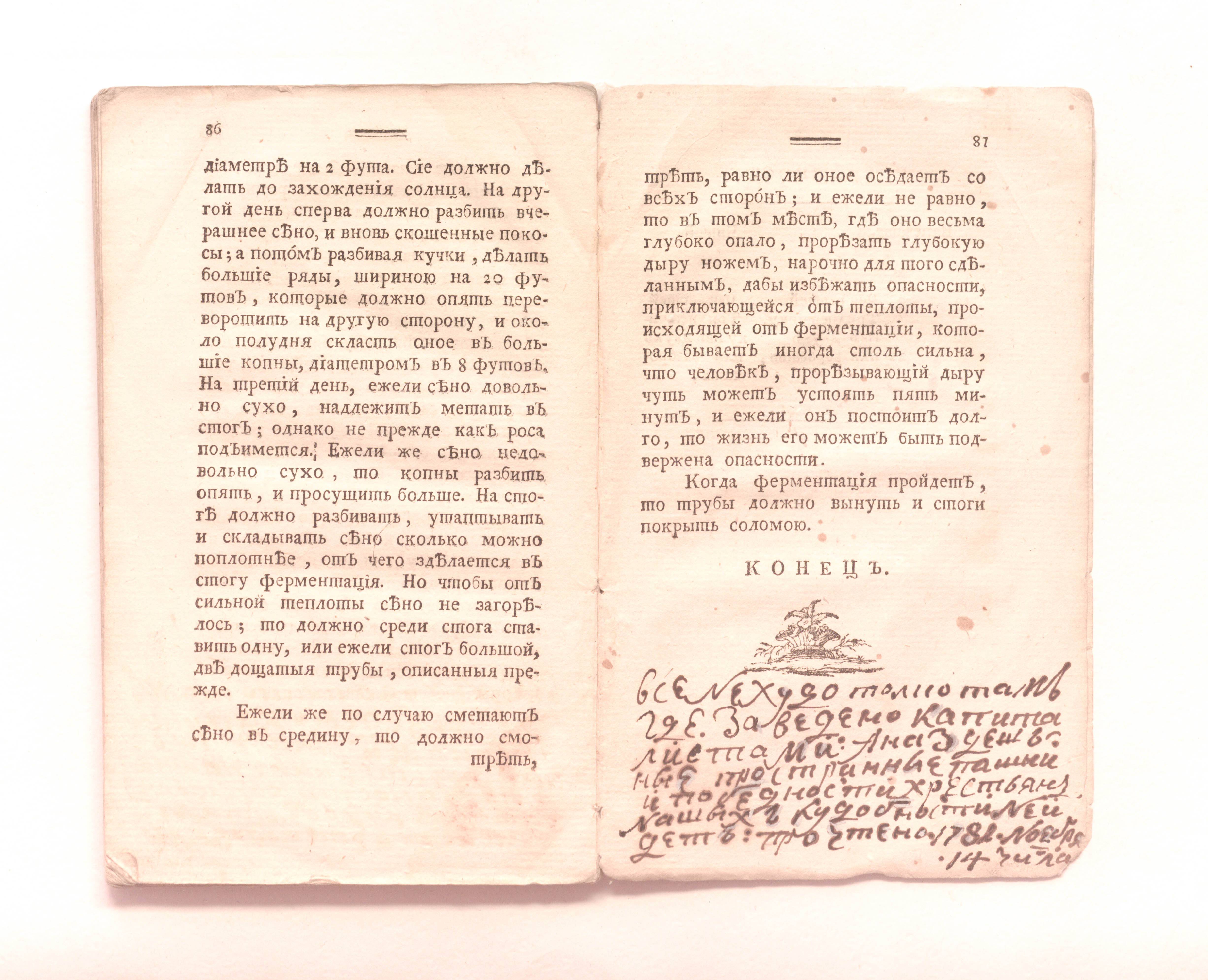 "Все не худо толко там где заведено капиталистами, а на здешные пространные пашни и по бедности хрестьян нашых к удобности неидет. Прочтено 1781 ноебря 14 числа" (почерком Н.А. Демидова, с. 87).