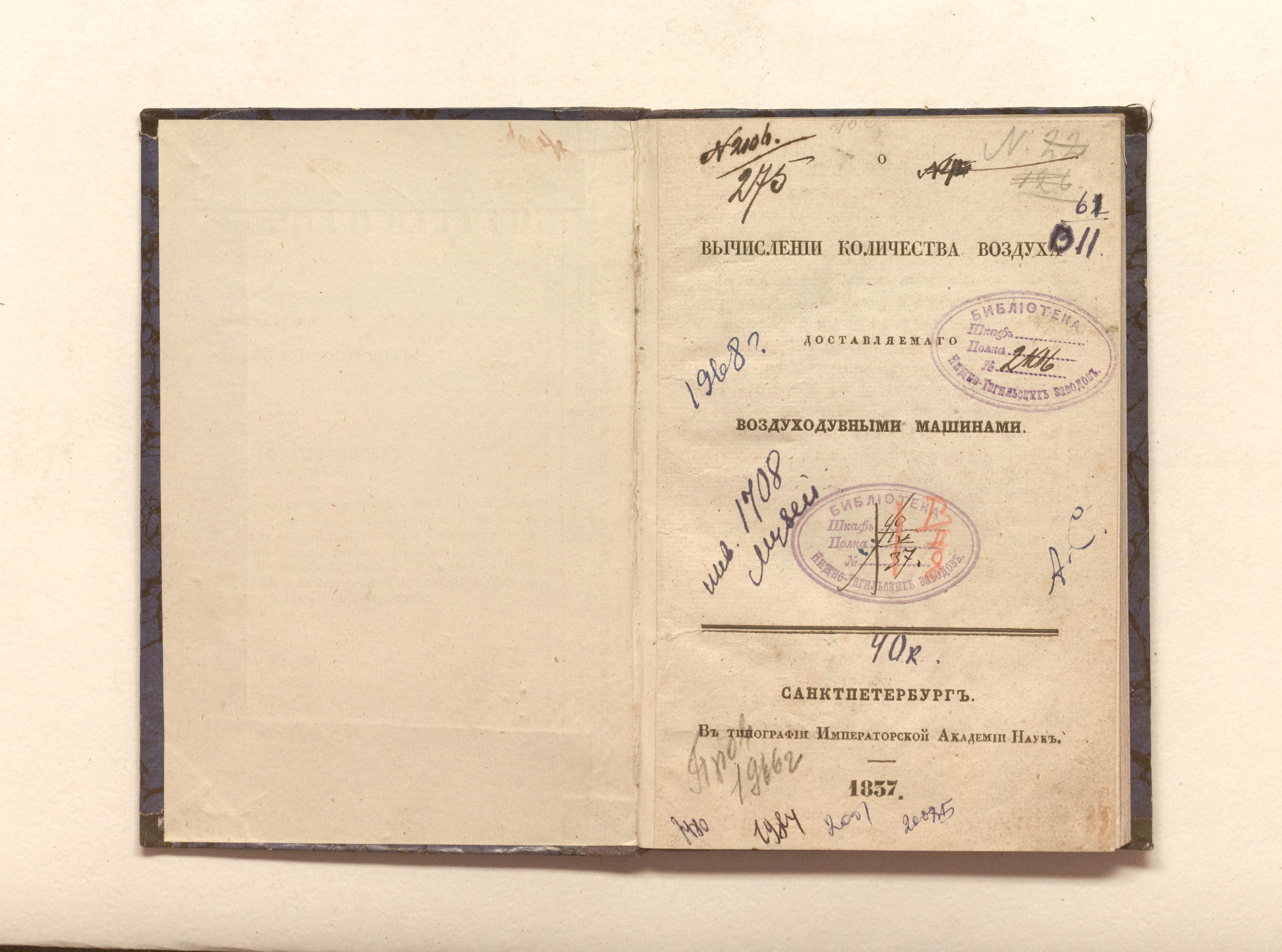 О вычислении количества воздуха, доставляемого воздуходувными машинами. — Санкт-Петербург : тип. Императорской академии наук, 1837. — 64 с. : табл. ; 18,5х12,5 см.