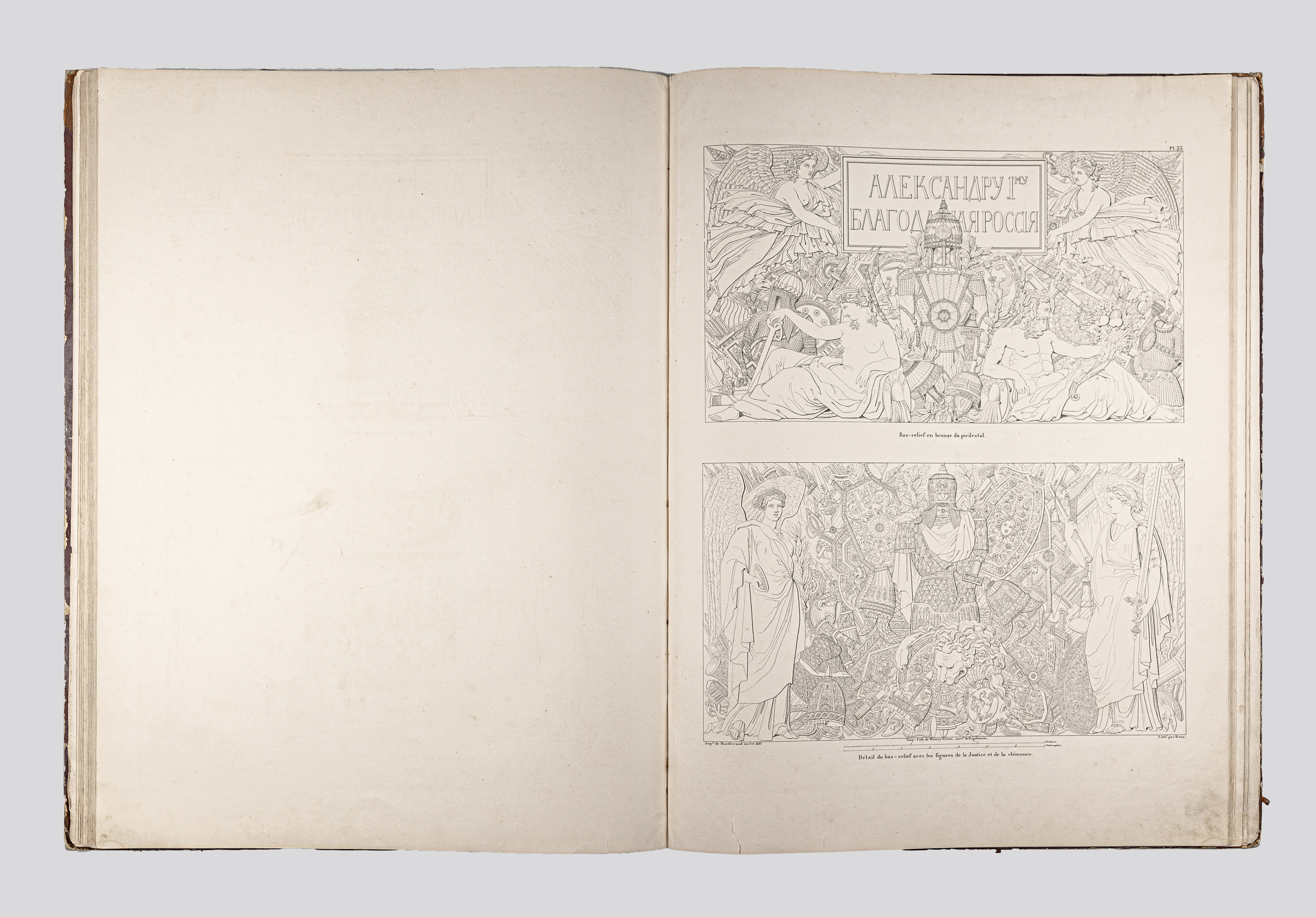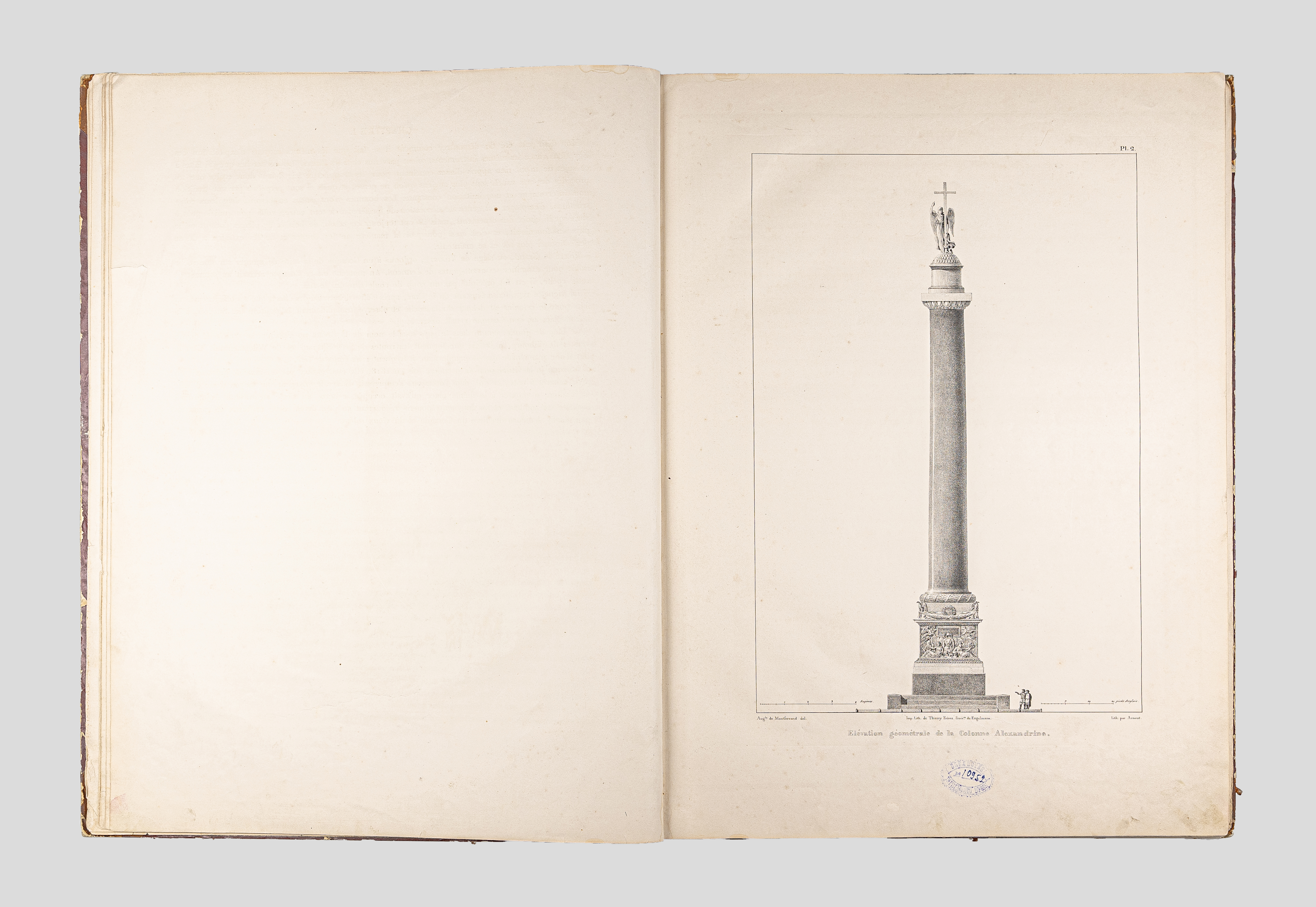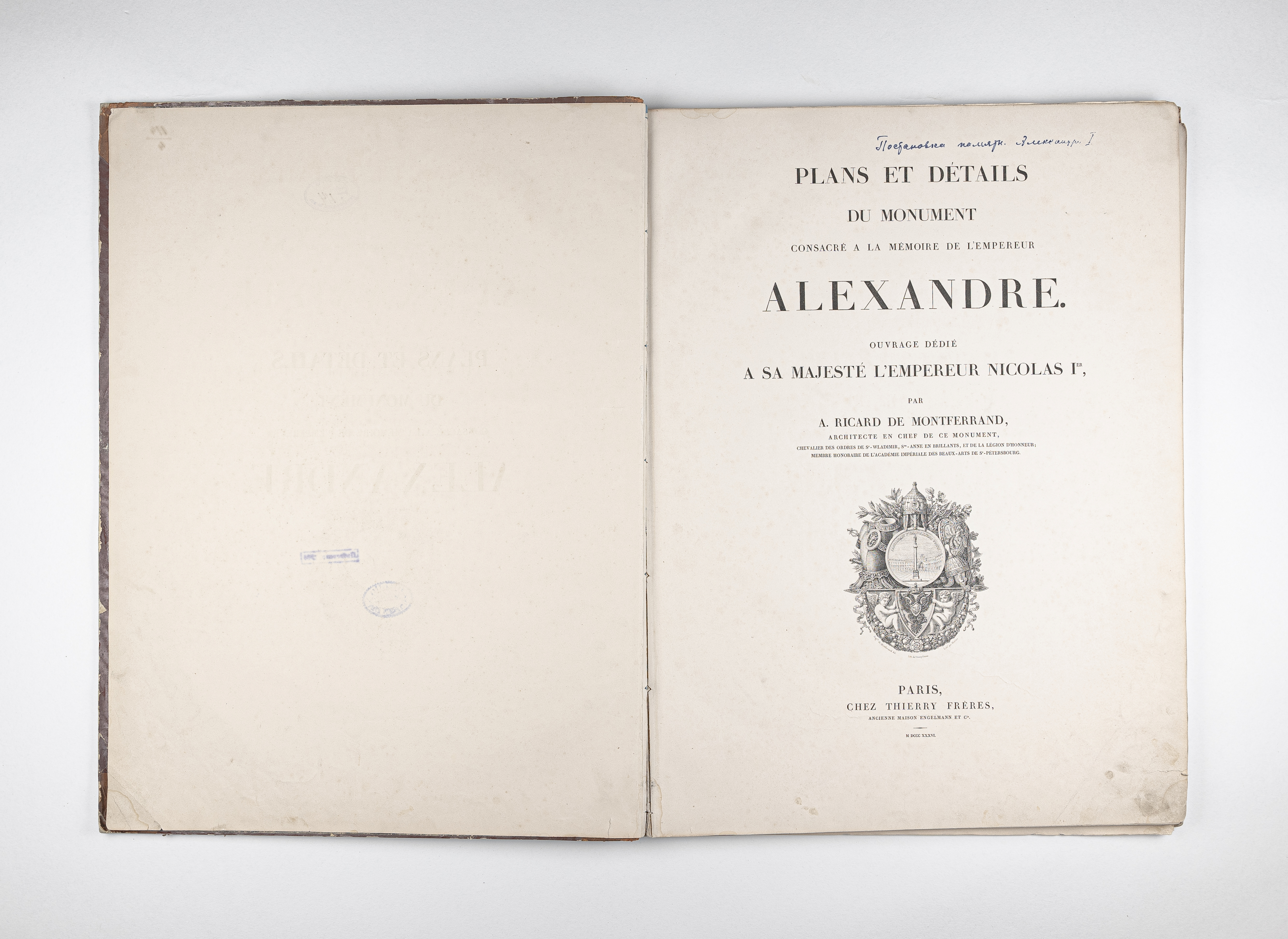 Montferrand, Henri Louis Auguste Ricard de (1786-1858). Plans et details du monument consacre a la memoire de l'empereur Alexandre, ouvrage dedie a S. M. l'empereur Nicolas Ier / par A. Ricard de Montferrand… – Paris : Thierry freres, 1836. – IV, 40, [1] p. : 48 pl. ; 61х45 cm.