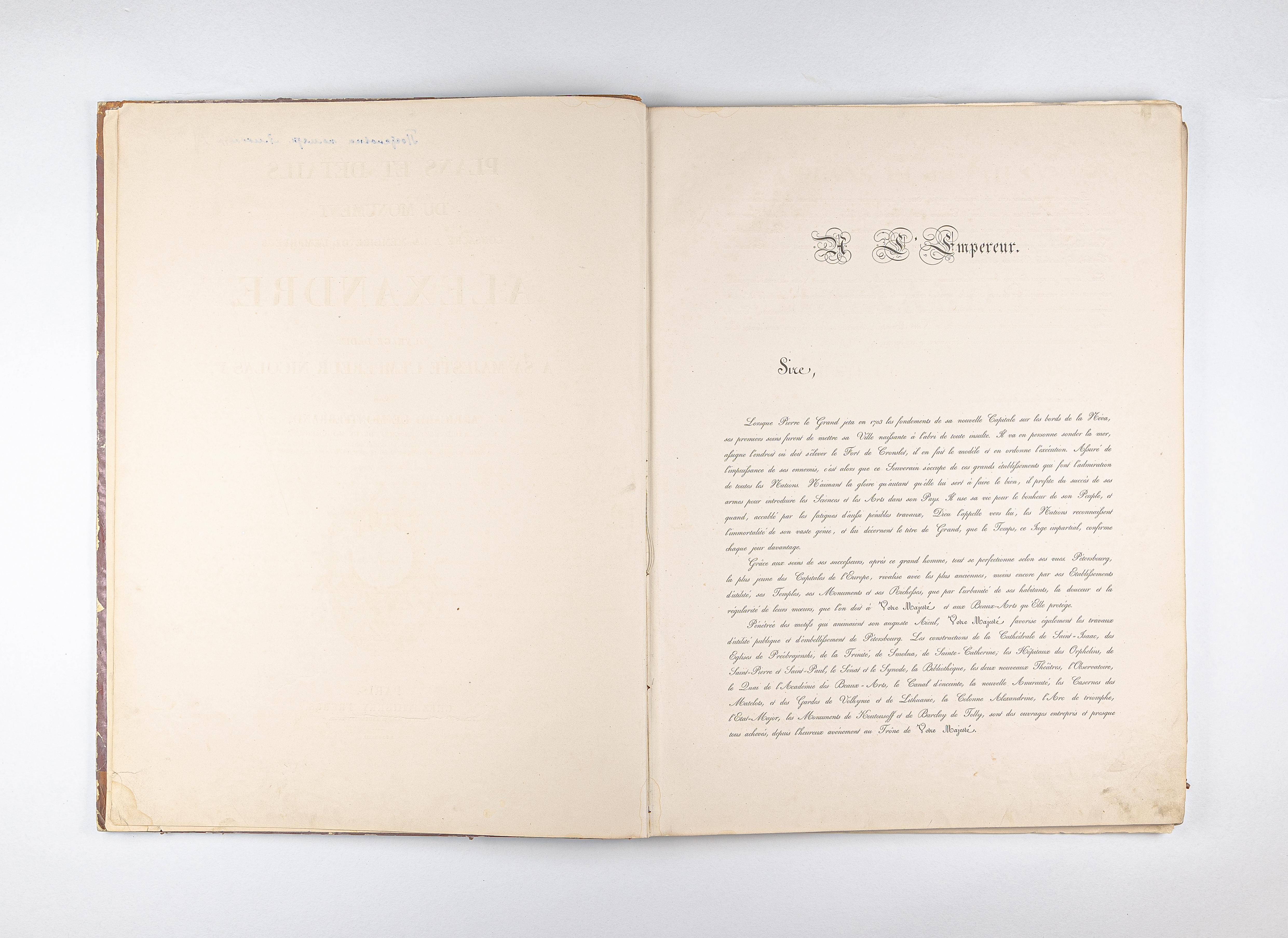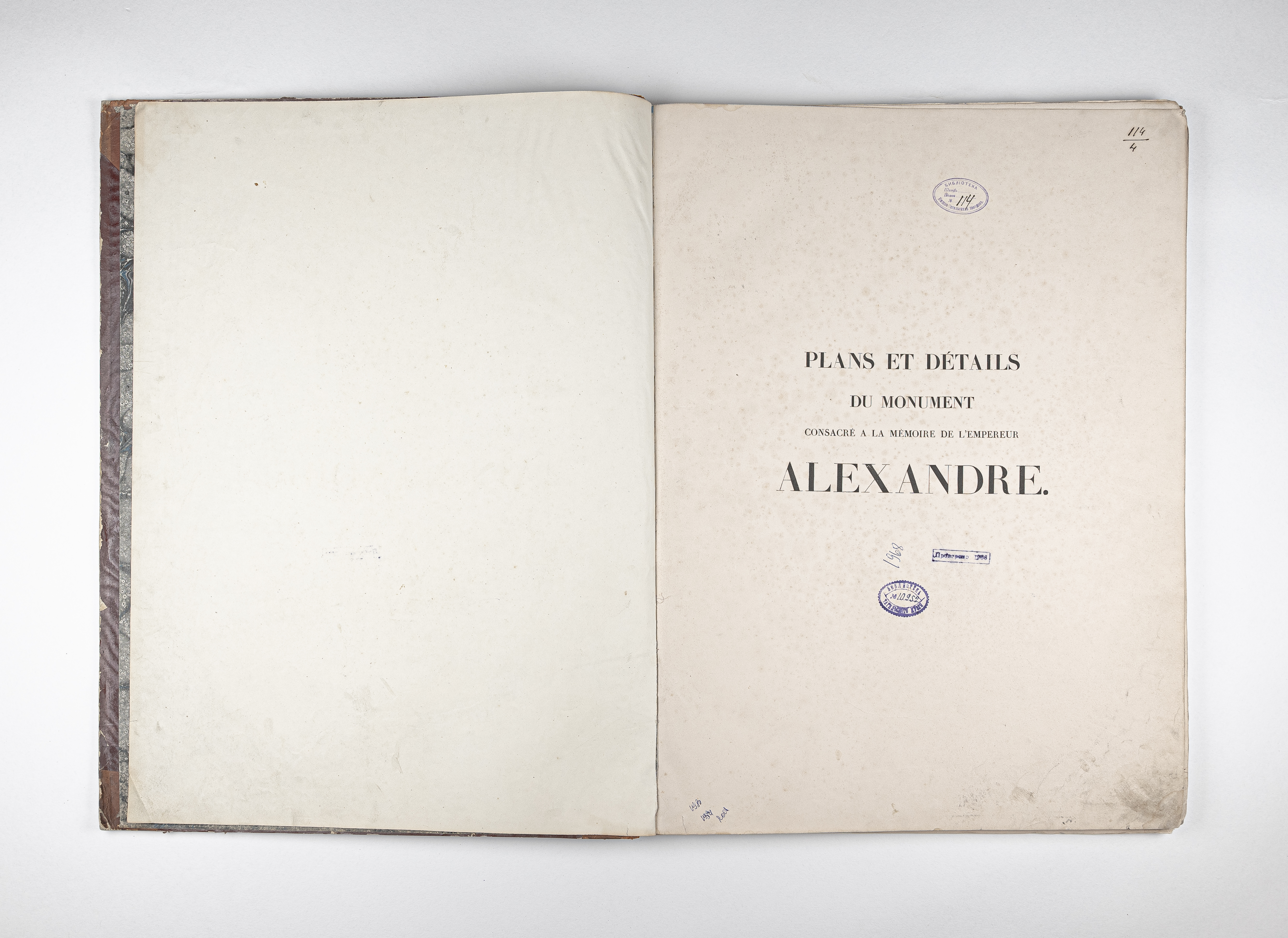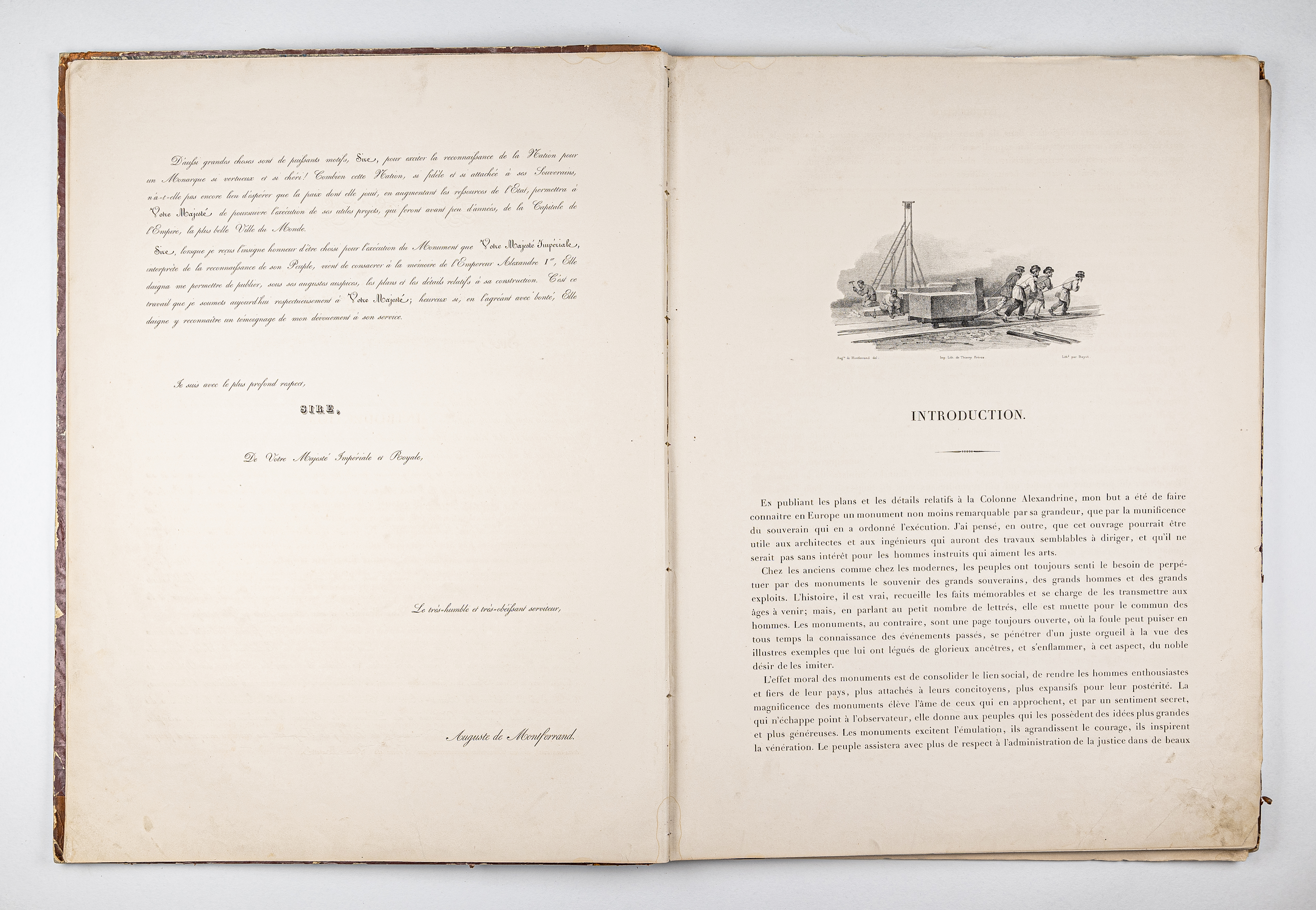 Монферран, Анри Луи Огюст Рикар де (1786-1858). Планы и детали мемориального памятника, посвященного императору Александру, работа посвящена Его Величеству императору Николаю I / А. Рикара де Монферрана… – Париж : Братья Тьерри, 1836. – IV, 40, [1] с. : 48 ил. ; 61х45 см.