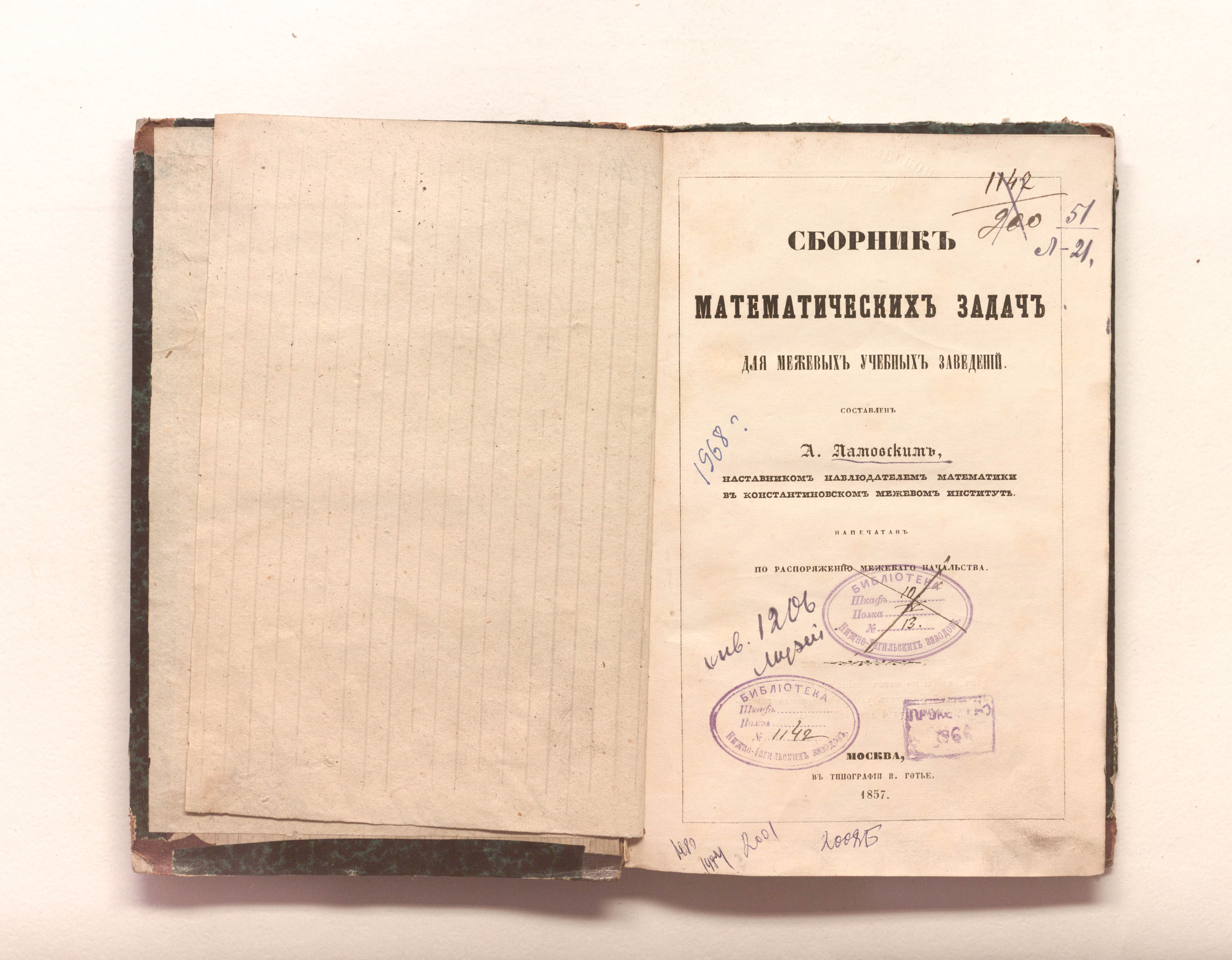 Ламовский, Александр Михайлович. Сборник математических задач для межевых учебных заведений / Сост. А. Ламовским, наставником-наблюдателем математики в Константинов. межевом ин-те. — Москва : тип. В. Готье, 1857. — III, 187, iV с. ; 23,5х16 см.