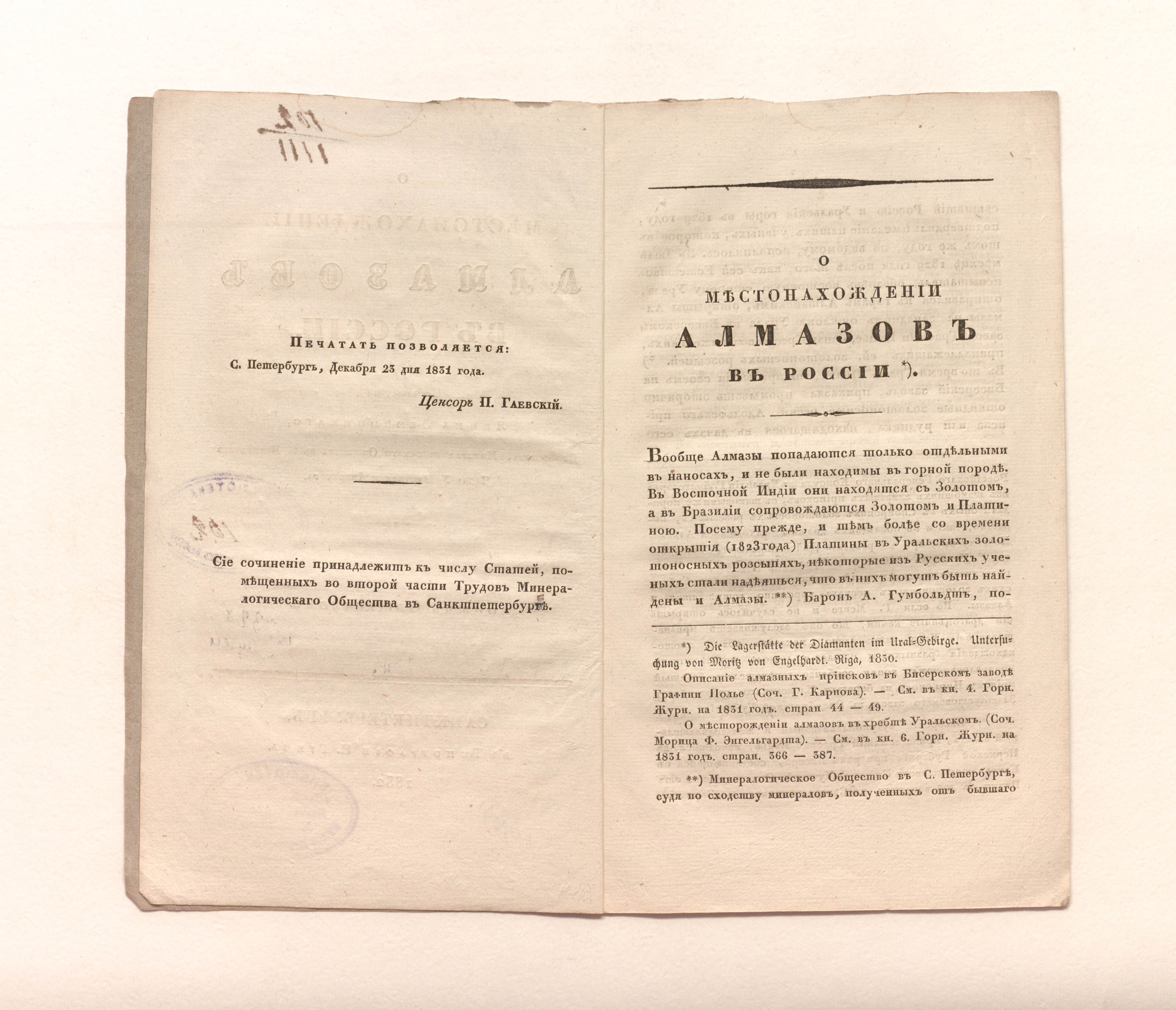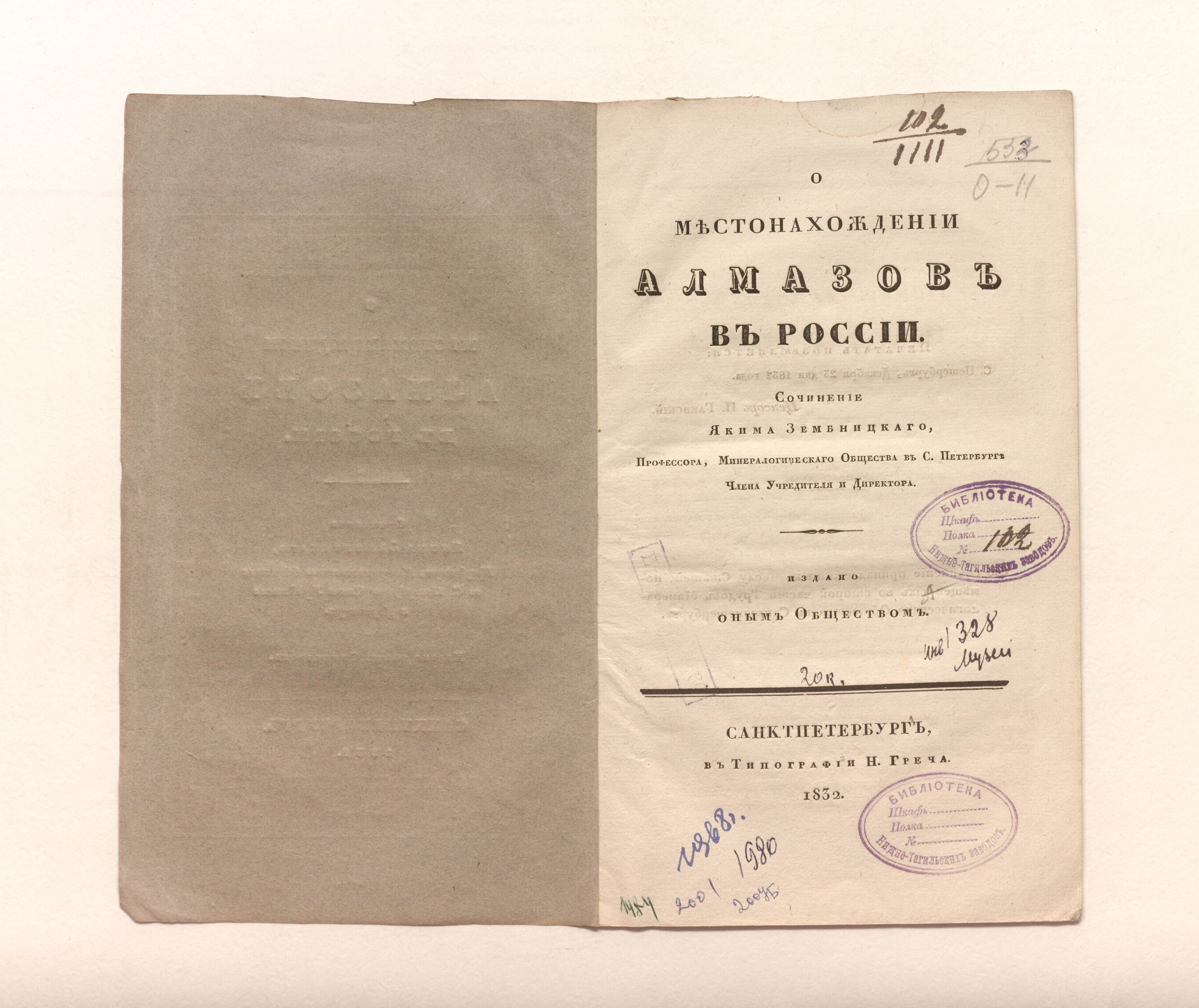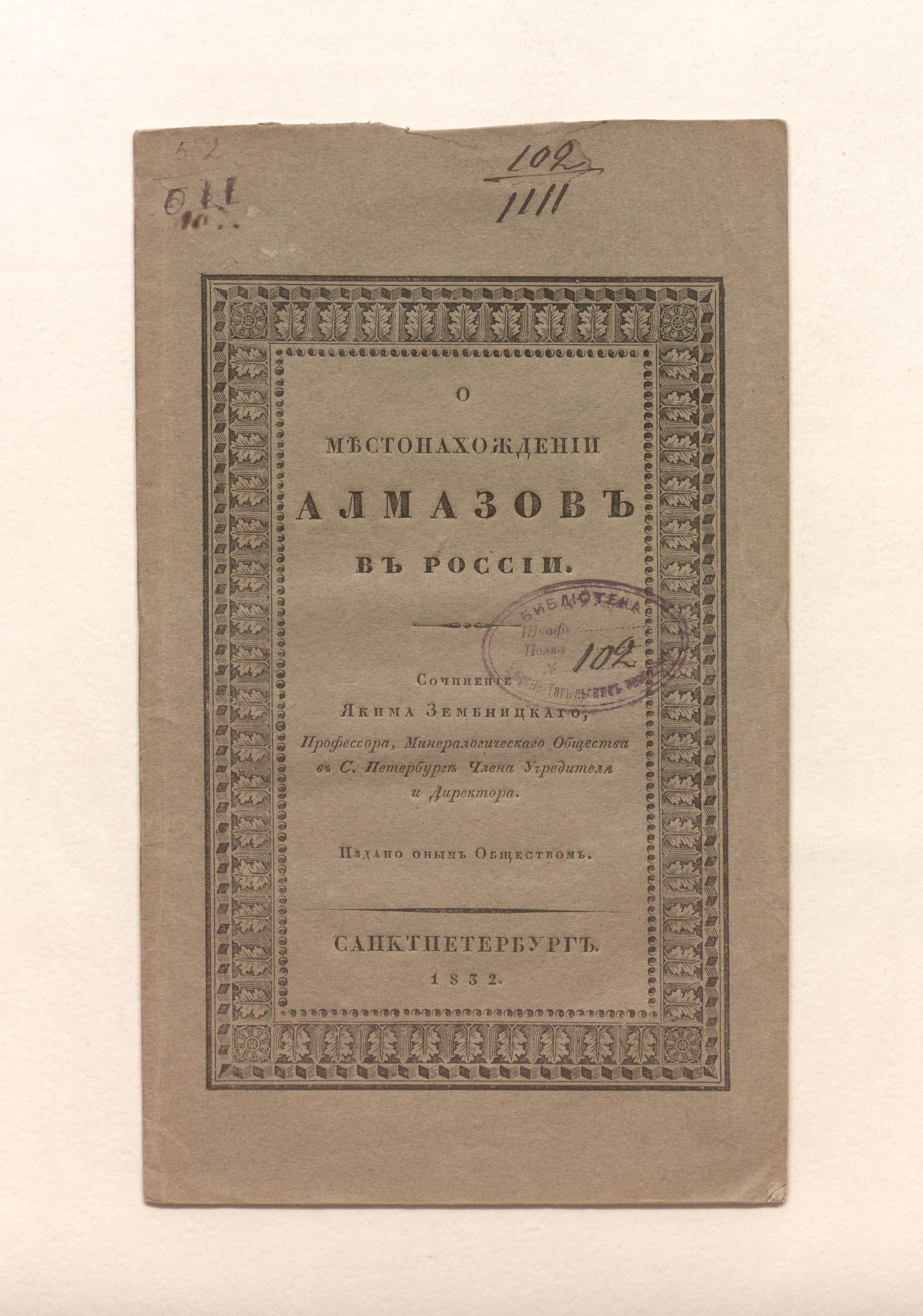 Зембницкий, Я. Г. (1784-1851). О местонахождении алмазов в России / соч. Я. Зембницкого, проф., Минерал. о-ва в С.-Петербурге члена учредителя и директора. ; изд. оным О-вом. – Санкт-Петербург : тип. Н. Греча, 1832. – 16 с. ; 24х14,7 см.