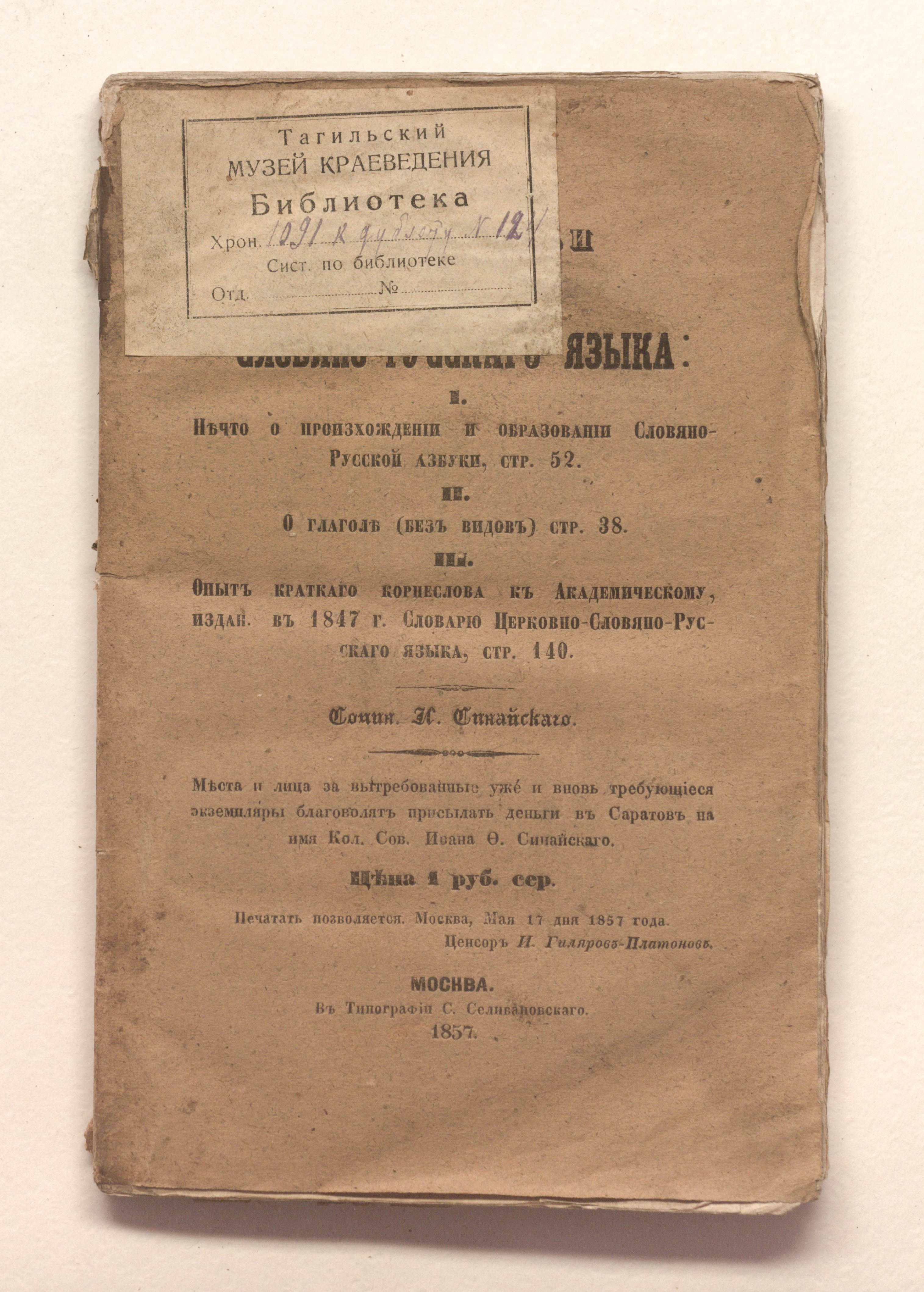 Три статьи по предмету славяно-русского языка : 1. Нечто о происхождении и образовании славяно-русской азбуки. 2. О глаголе (без видов). 3. Опыт краткого корнеслова к академическому, изданному в 1847 г. , словарю церковно-словяно-русского языка / соч. И. Синайского. – Москва : в Типографии С. Селивановскаго, 1857. – [4], 52, 38, [2], X, 141 с. : табл. ; 22х14 см.