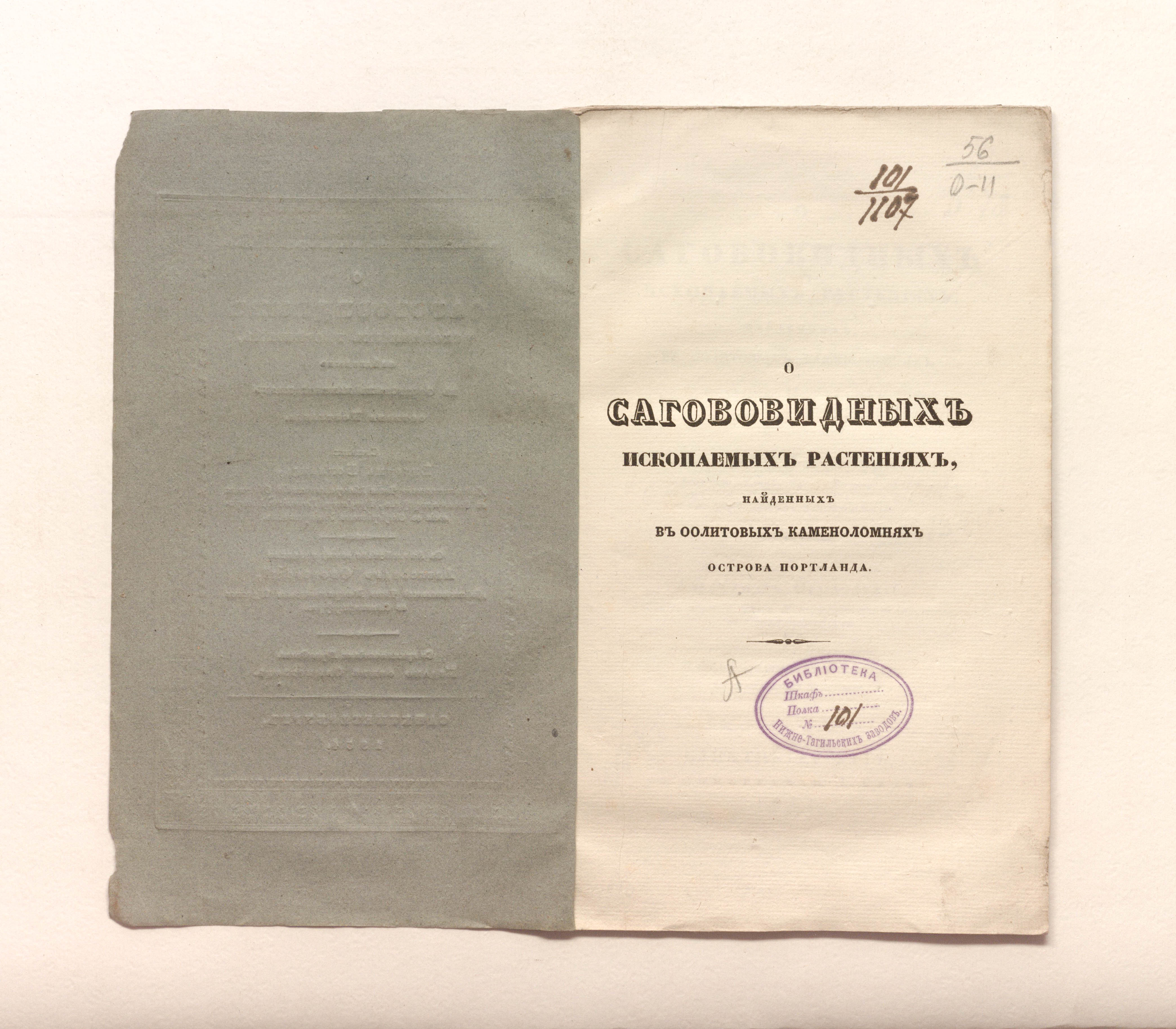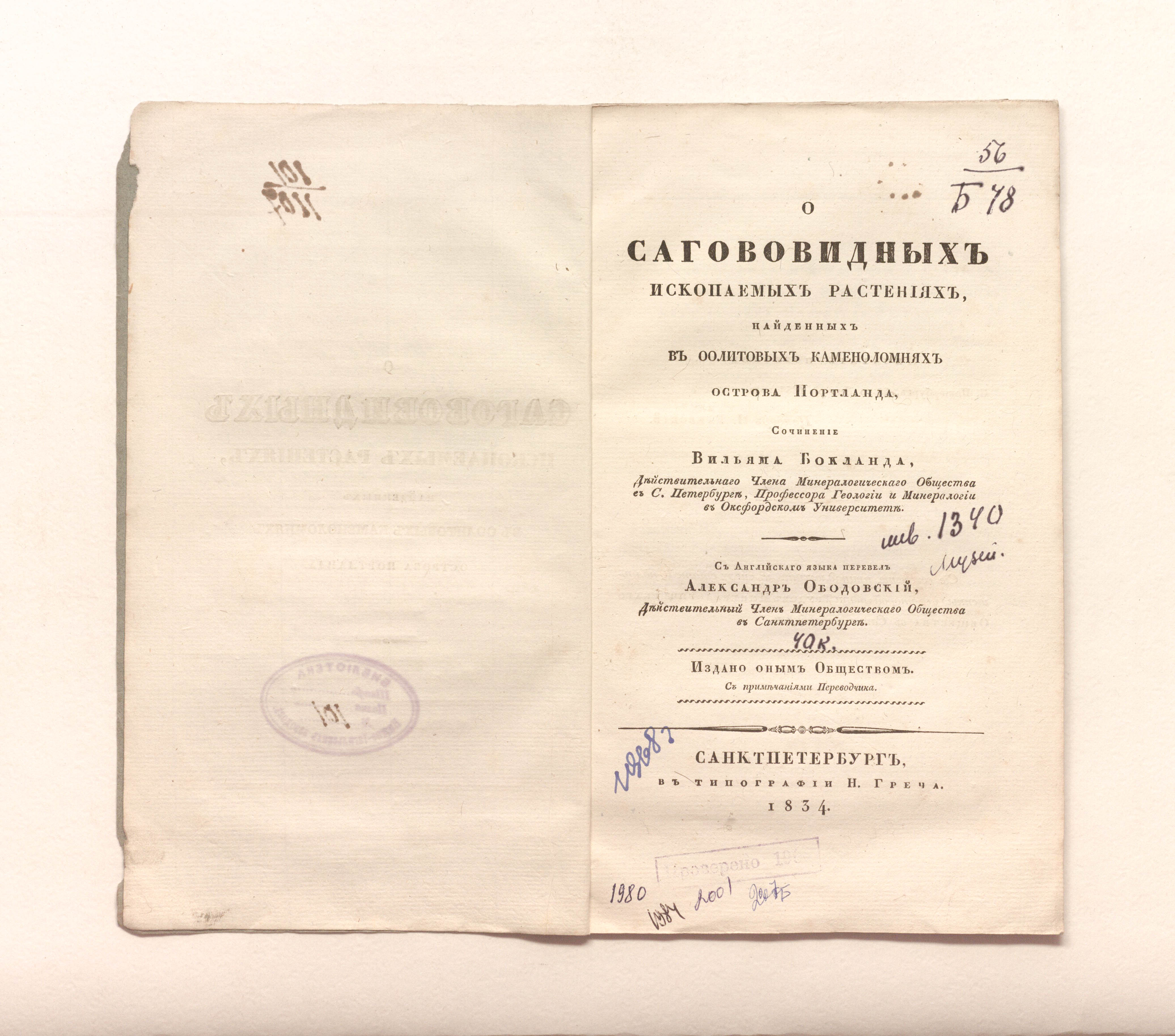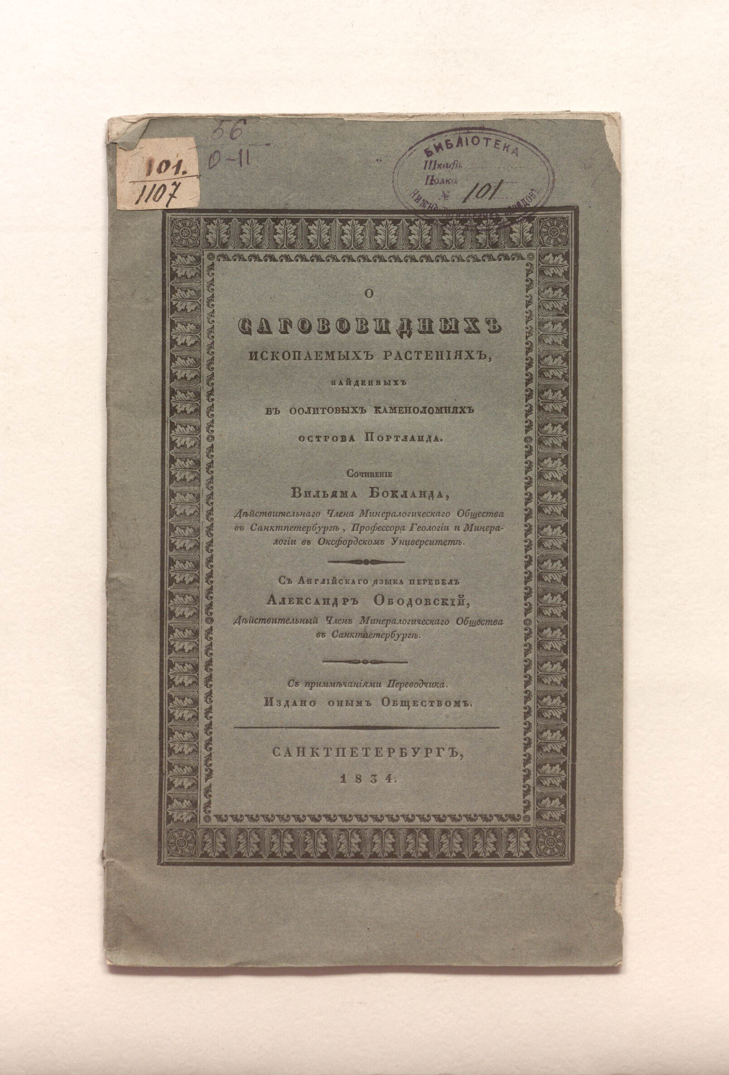 Бокланд, Вильям. О сагововидных ископаемых растениях, найденных в оолитовых каменоломнях острова Портланда / соч. Вильяма Бокланда, д. чл. Минерал. о-ва в С.-Петербурге, проф. геологии и минералогии в Оксфорд. ун-те ; с англ. яз. пер. Александр Ободовский, д. чл. Минерал. о-ва в Санкт-Петербурге ; изд. оным О-вом с примеч. переводчика. – Санкт-Петербург : тип. Н. Греча, 1834. – 23, [1] с. : 4 л. ил. ; 24,5х14,5 см.