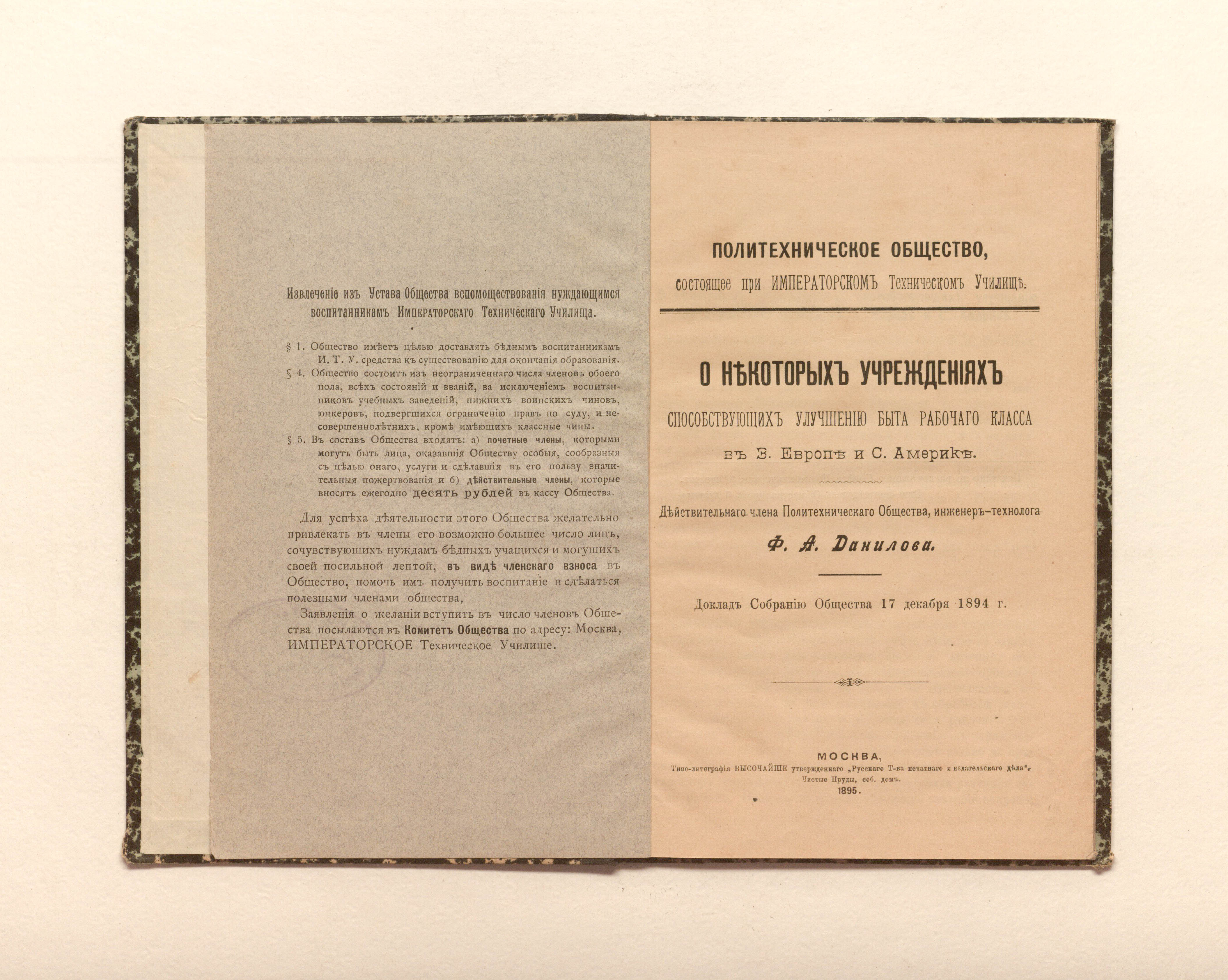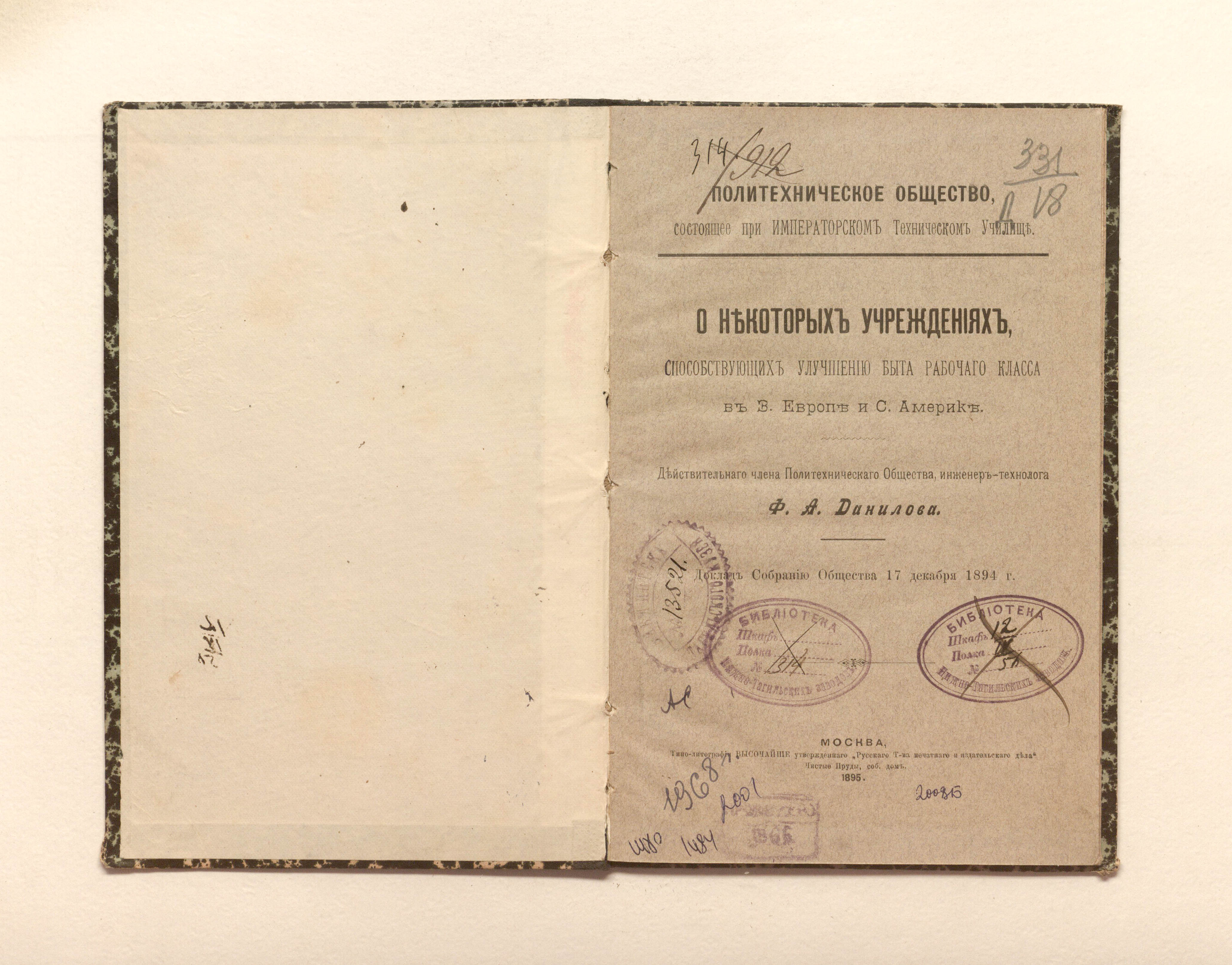 Данилов, Флегонт Александрович. О некоторых учреждениях способствующих улучшению быта рабочего класса в Западной Европе и Северной Америке / Ф. А. Данилов. — Москва : типо-литография Высочайше утвержденного «Русского Т-ва печатного и издательского дела», 1895. — 56 с. ; 21х14 см.