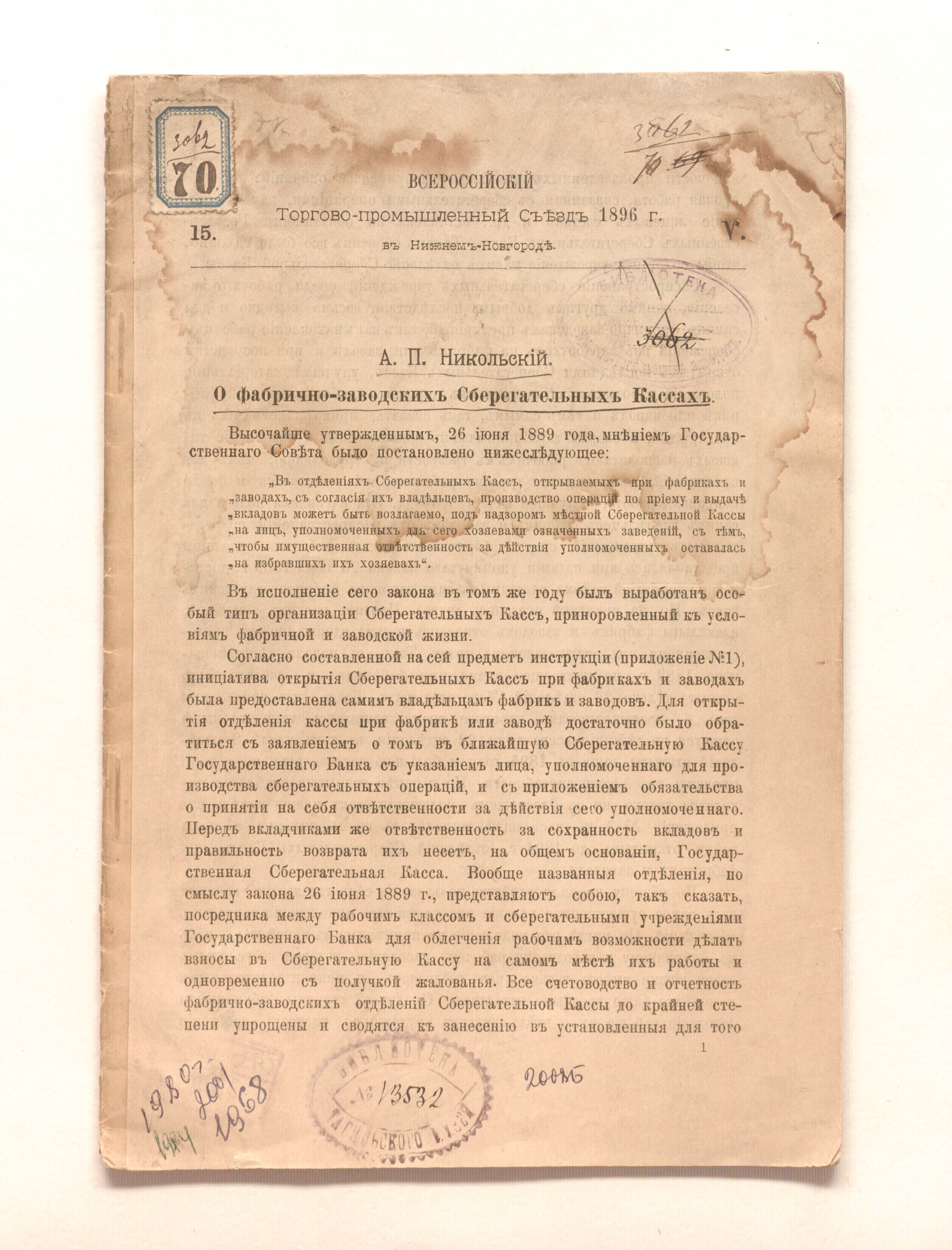 О фабрично-заводских сберегательных кассах / А. П. Никольский ; Всероссийский Торгово-промышленный съезд 1896 г. в Нижнем Новгороде. — [Б. м. : б. и.], 1896. — 29 с. ; 25х16,5 см.