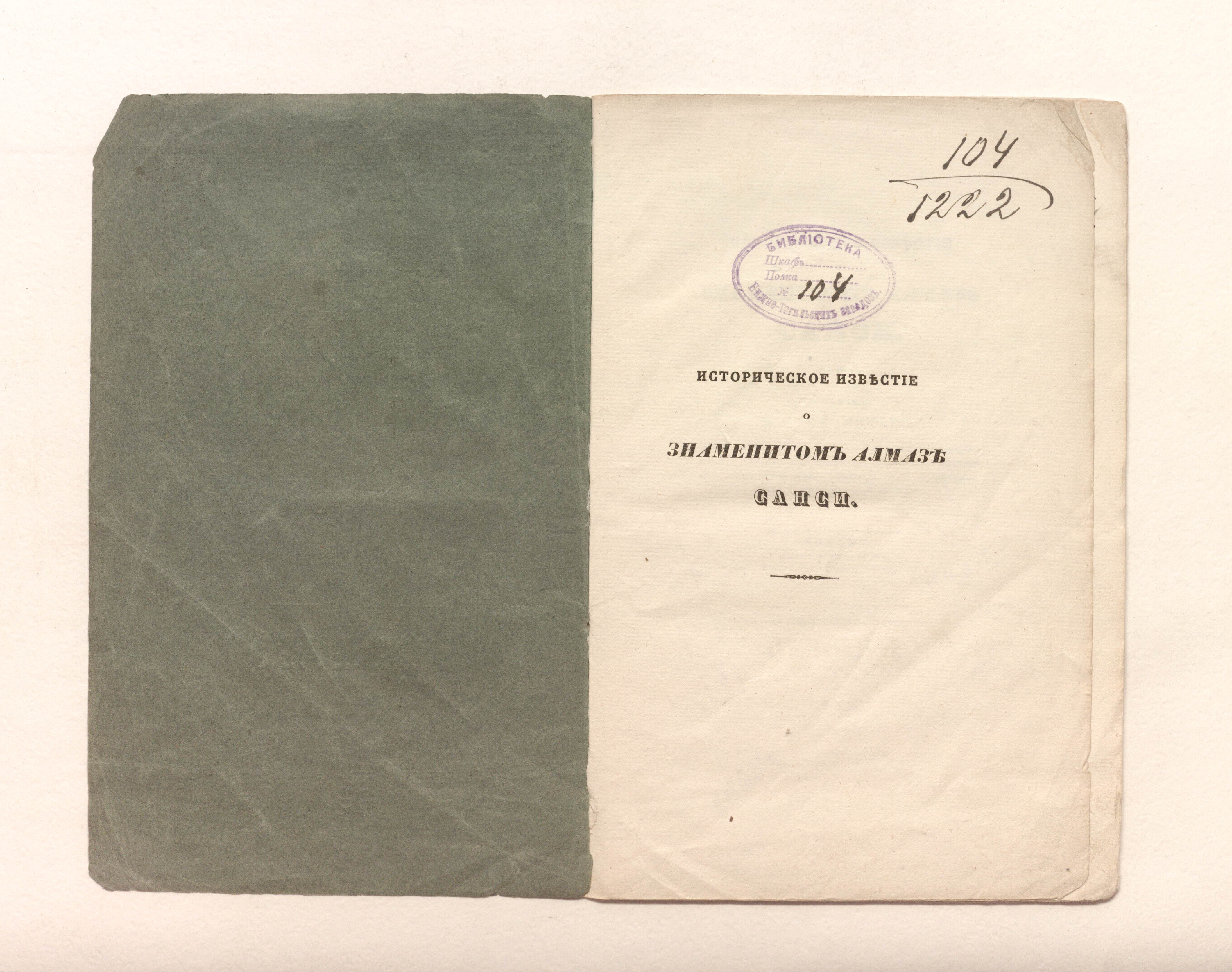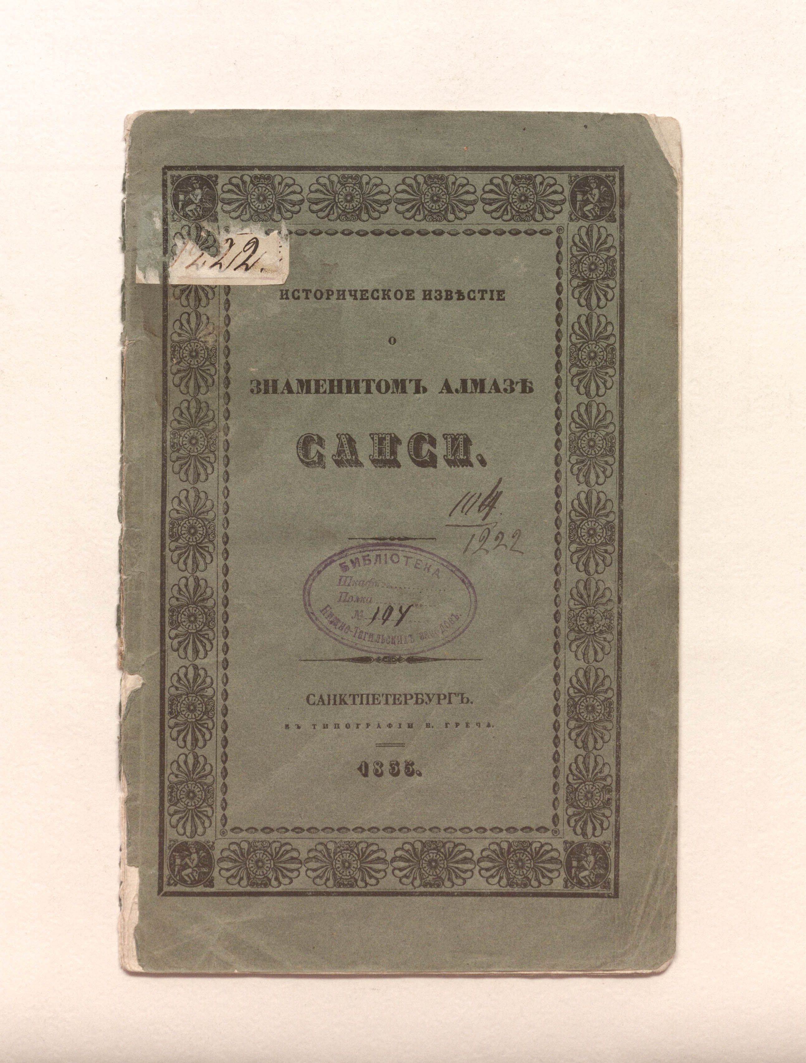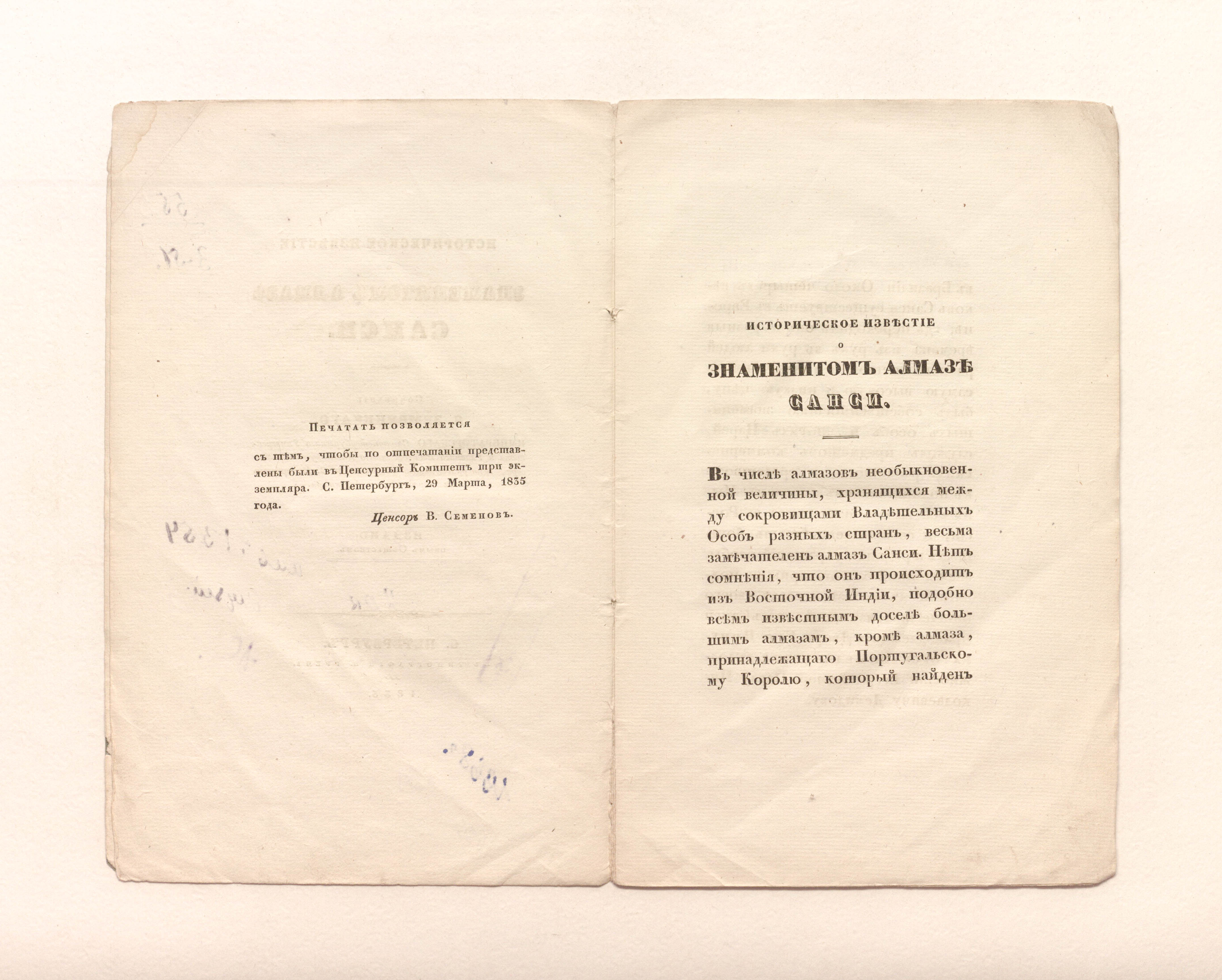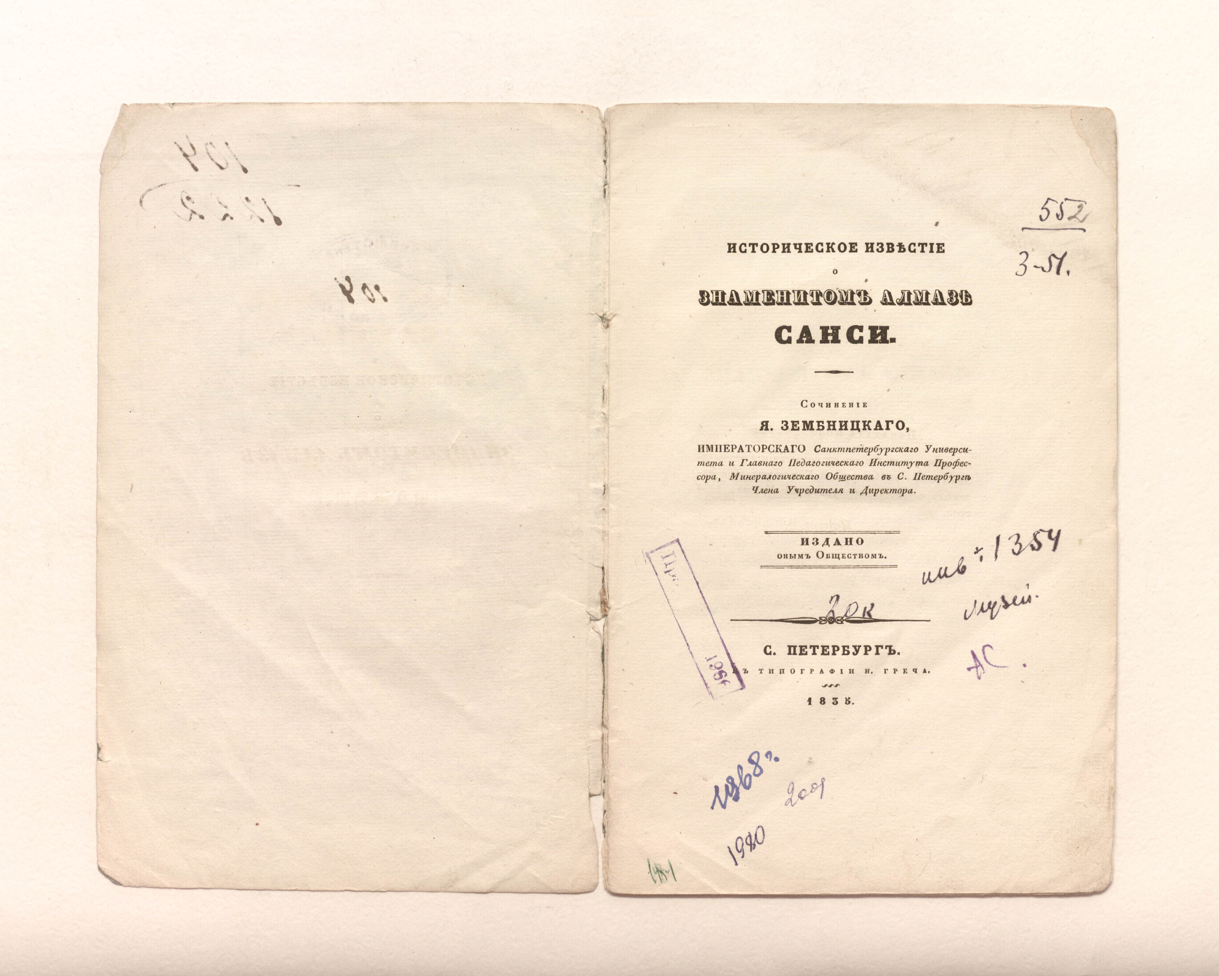 Зембницкий, Я. Г. (1784-1851). Историческое известие о знаменитом алмазе Санси / соч. Я. Зембницкого, Императорскаго Санктпетербургскаго Университета и Гл. пед. ин-та проф. Минерал. о-ва в С.-Петербурге чл. учредителя и дир. ; изд. оным О-вом. – Санкт-Петербург : тип. Н. Греча, 1835. – 18 с. ; 23х14,7 см.