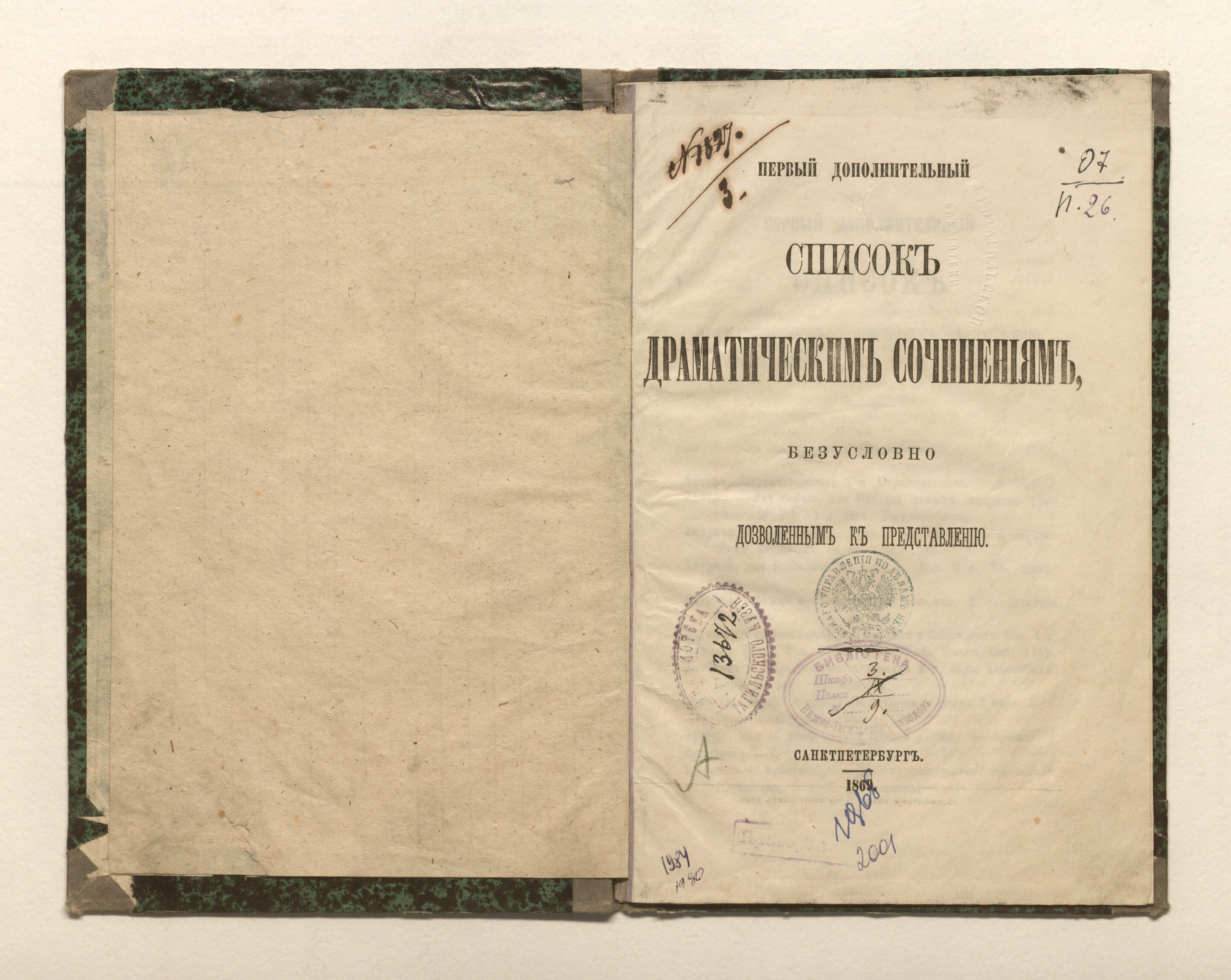 Первый дополнительный список драматическим сочинениям, безусловно дозволенным к представлению. — Санкт-Петербург : тип. Министерства внутренних дел, 1869. — 17 с. ; 24х15,5 см.
