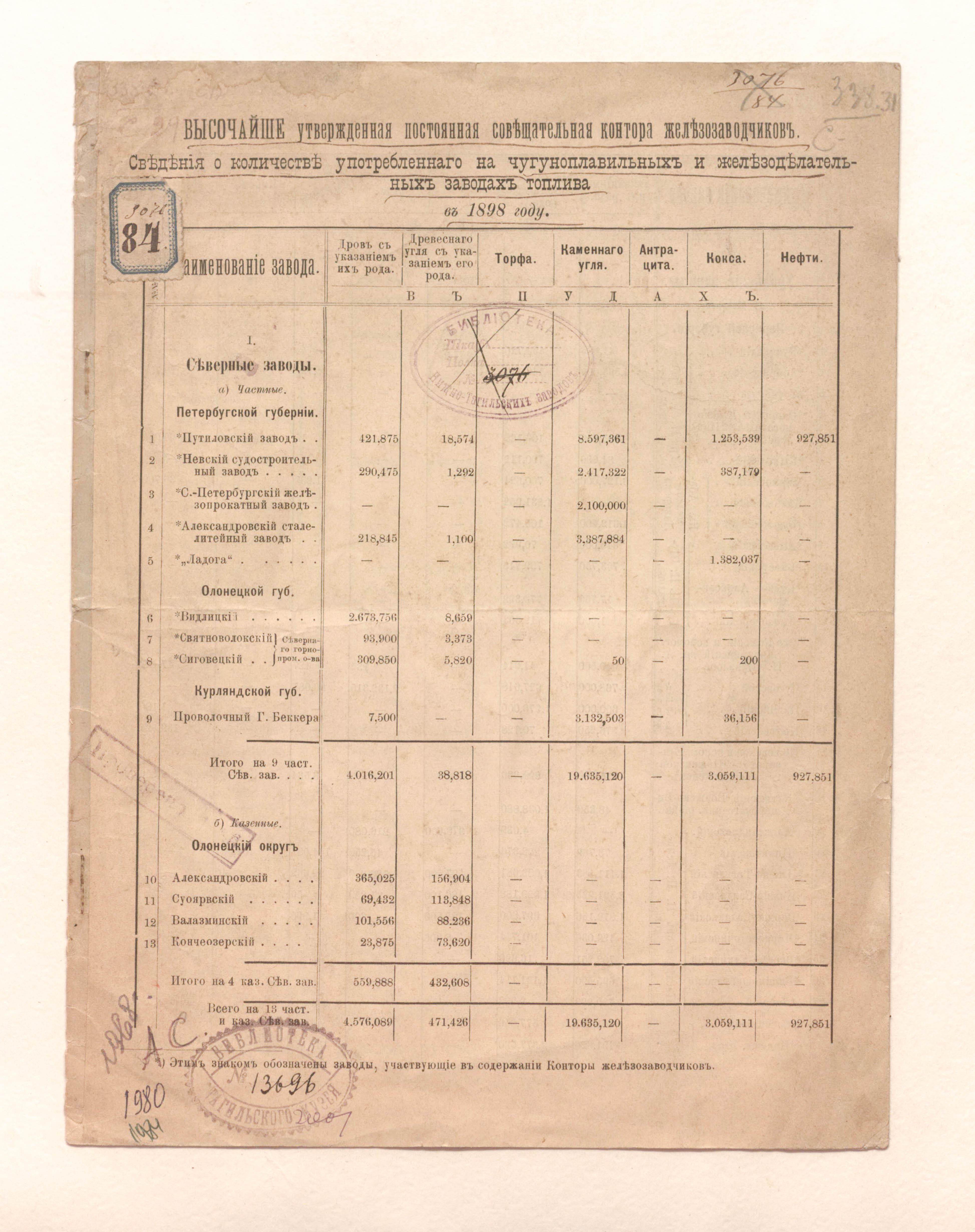 Сведения о количестве употребленного на чугуноплавильных и железоделательных заводах топлива в 1898 году