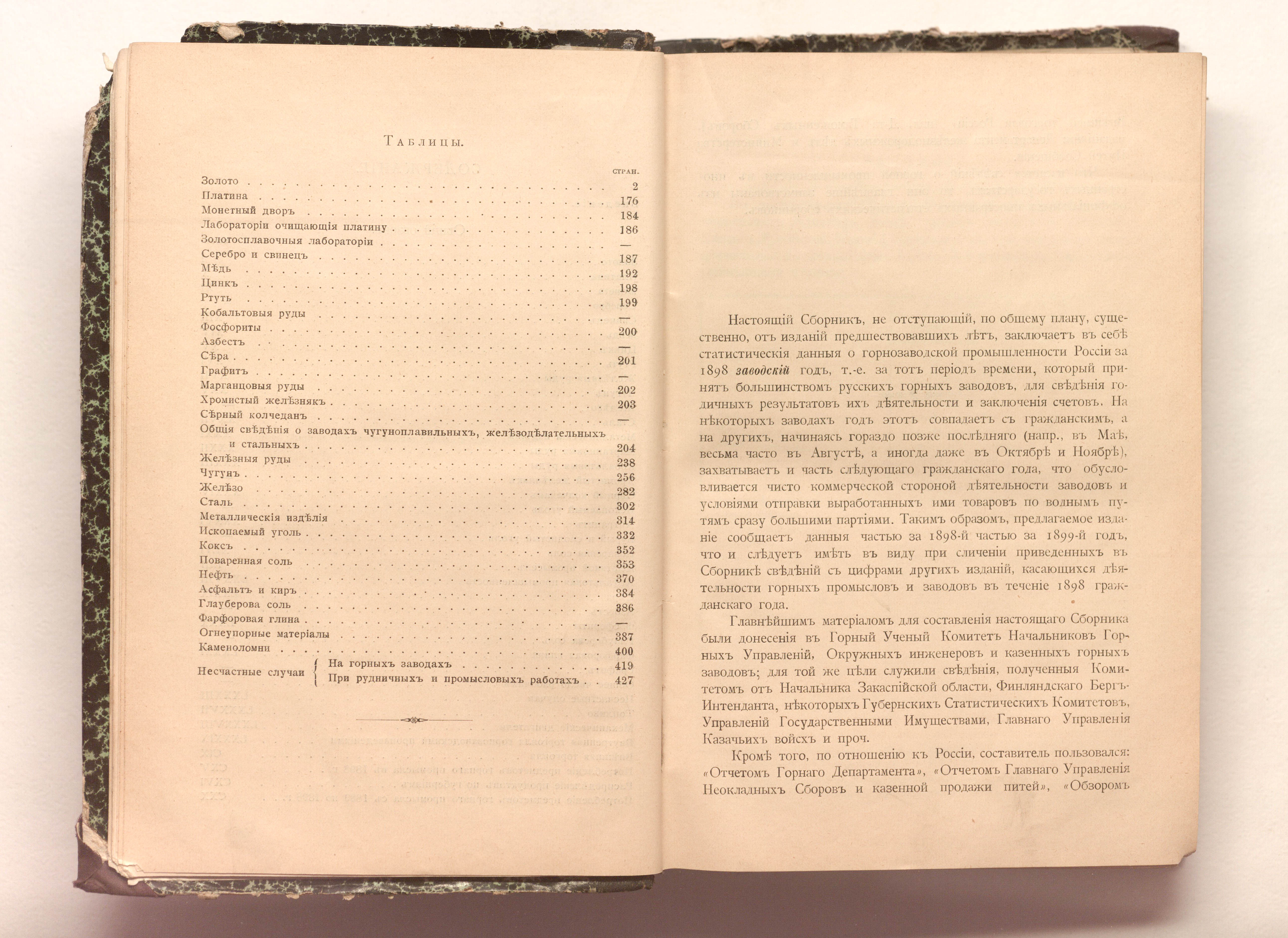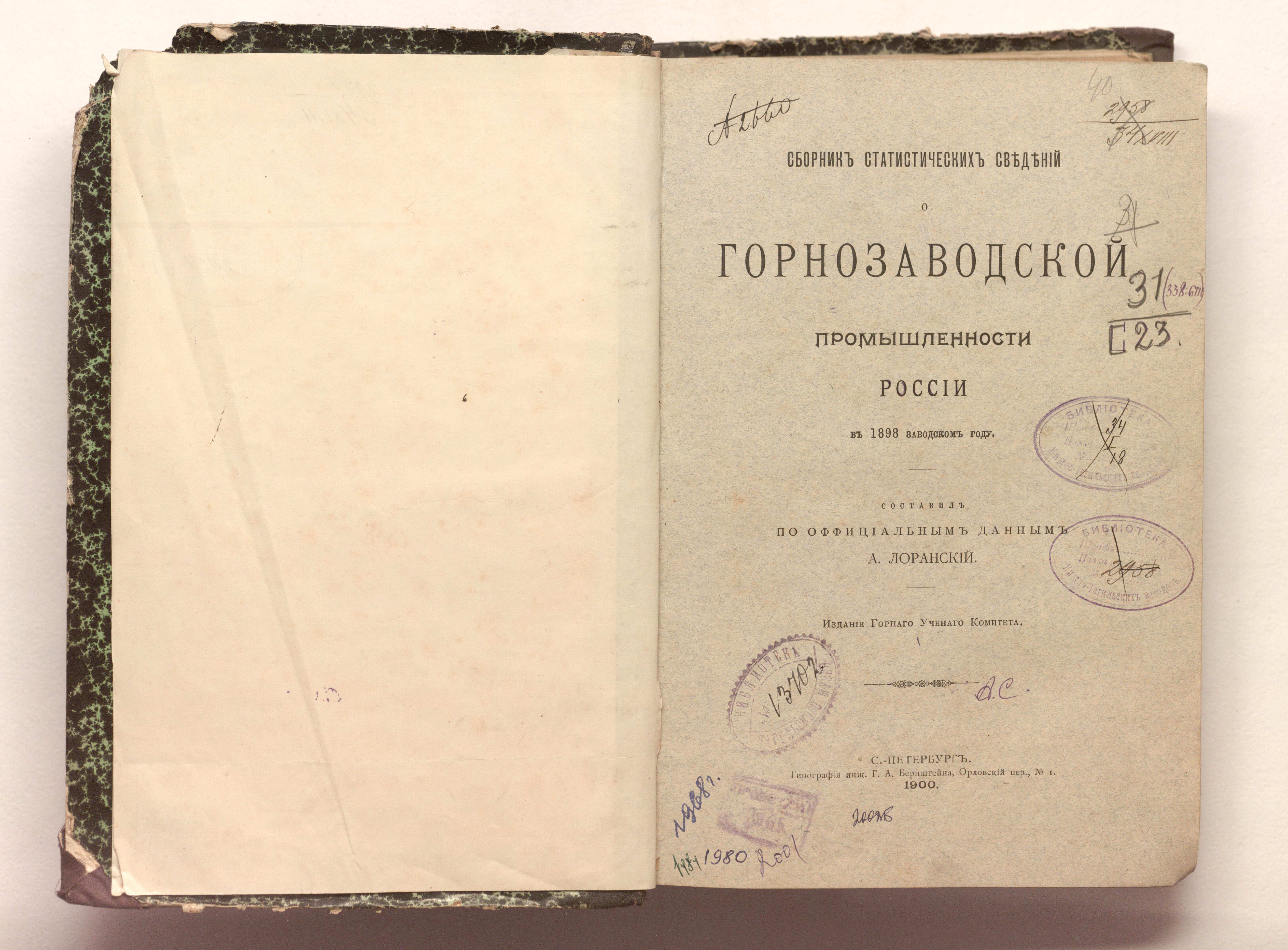 Сборник статистических сведений о горнозаводской промышленности России в 1898 заводском году / сост. А. Лоранский. — Санкт-Петербург : тип. инж. Г.А. Бернштейна, 1900. — CXX, 448 c. ; 27х18,5 см.