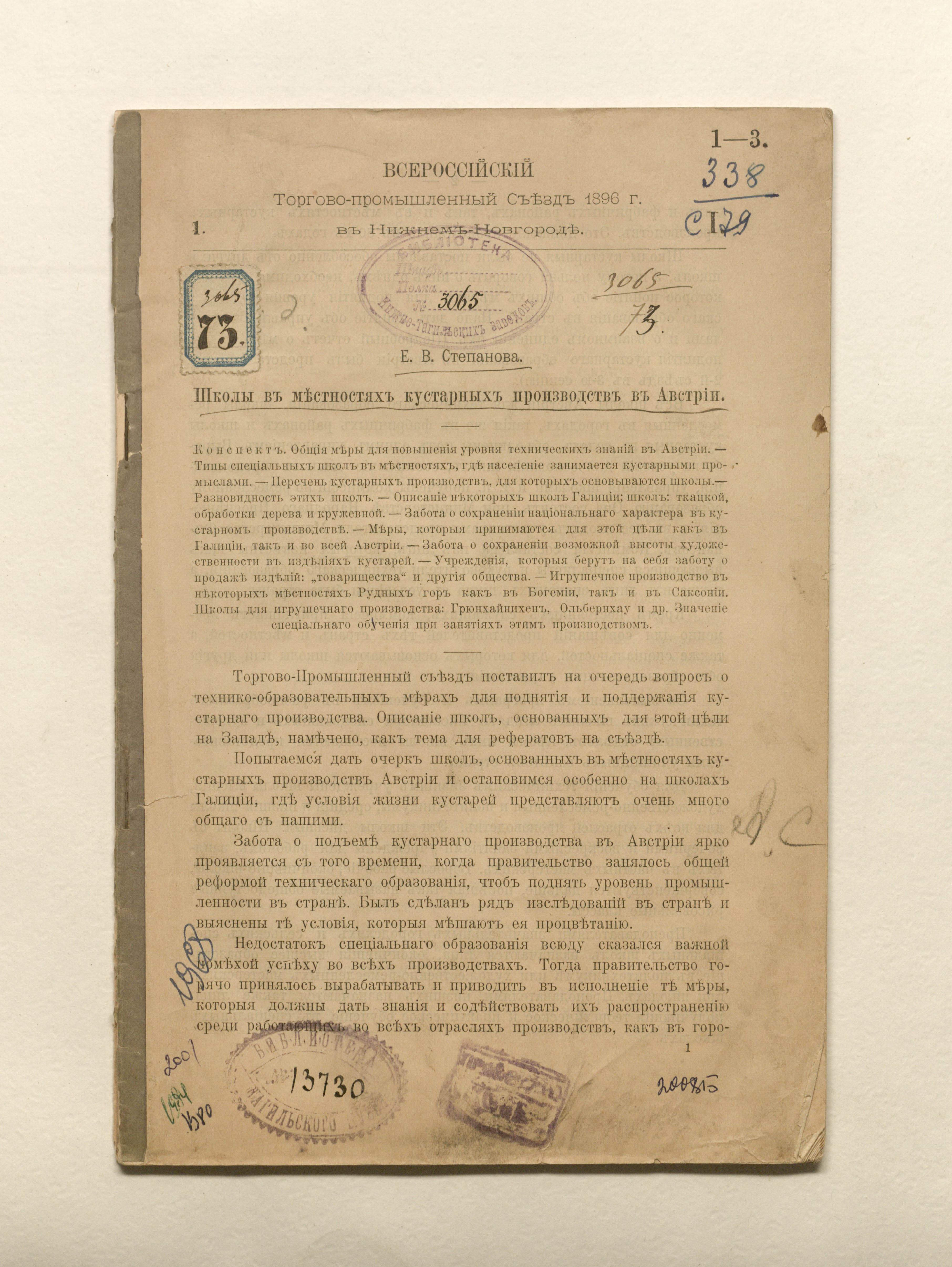 Труды высочайше учрежденного Всероссийского торгово-промышленного съезда 1896 г. в Нижнем Новгороде. — Нижний Новгород : [б. и.], 1896. — 39, 15, 16 с. ; 25х17 см.