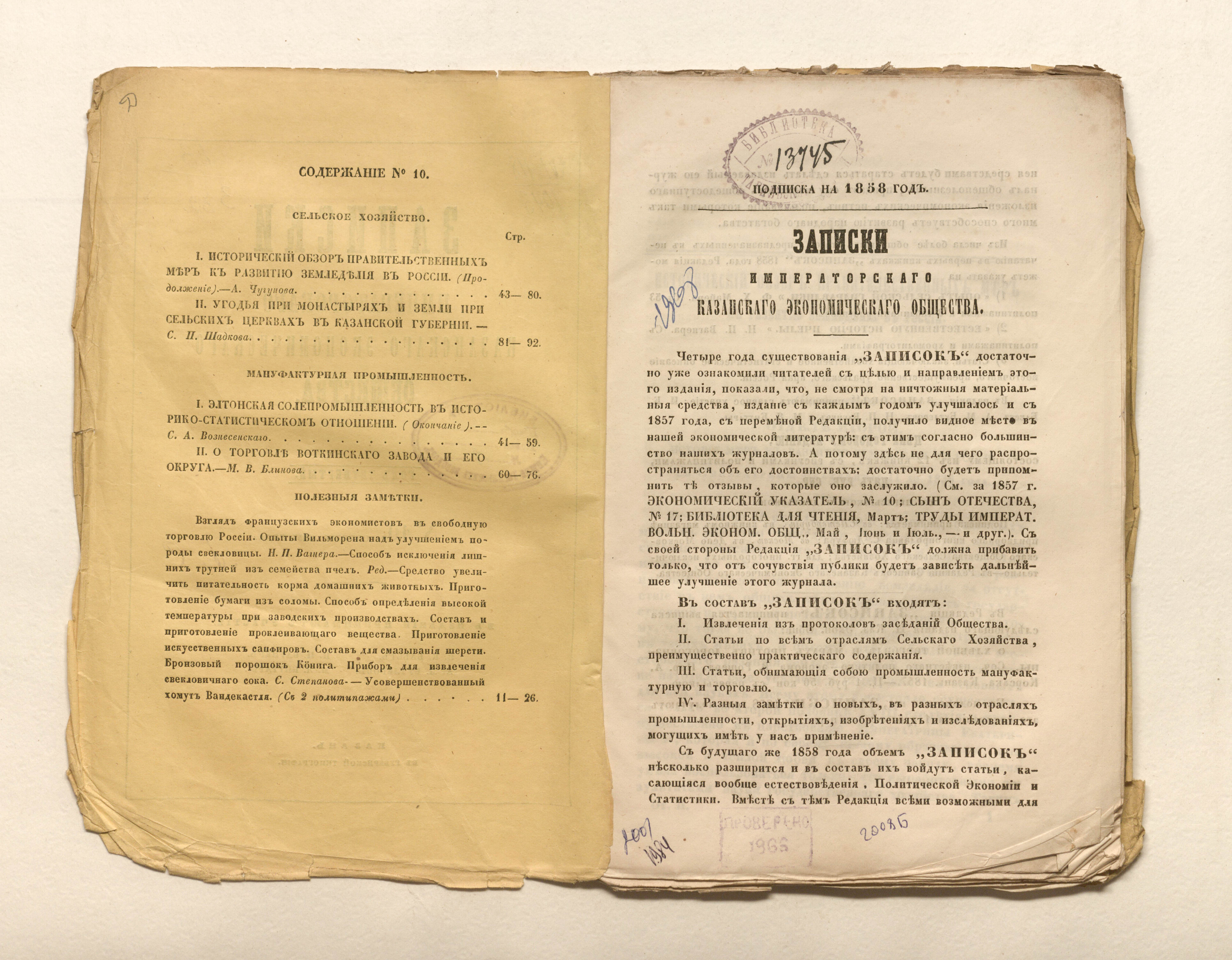 Записки Императорскаго Казанскаго Экономическаго Общества. Книга 10. Октябрь / Казанское экономическое общество ; ред. А. Чугунов. — Казань : [б. и.], 1857 (в Губернской типографии). — раздельная пагинация. ; 25х16,5 см.