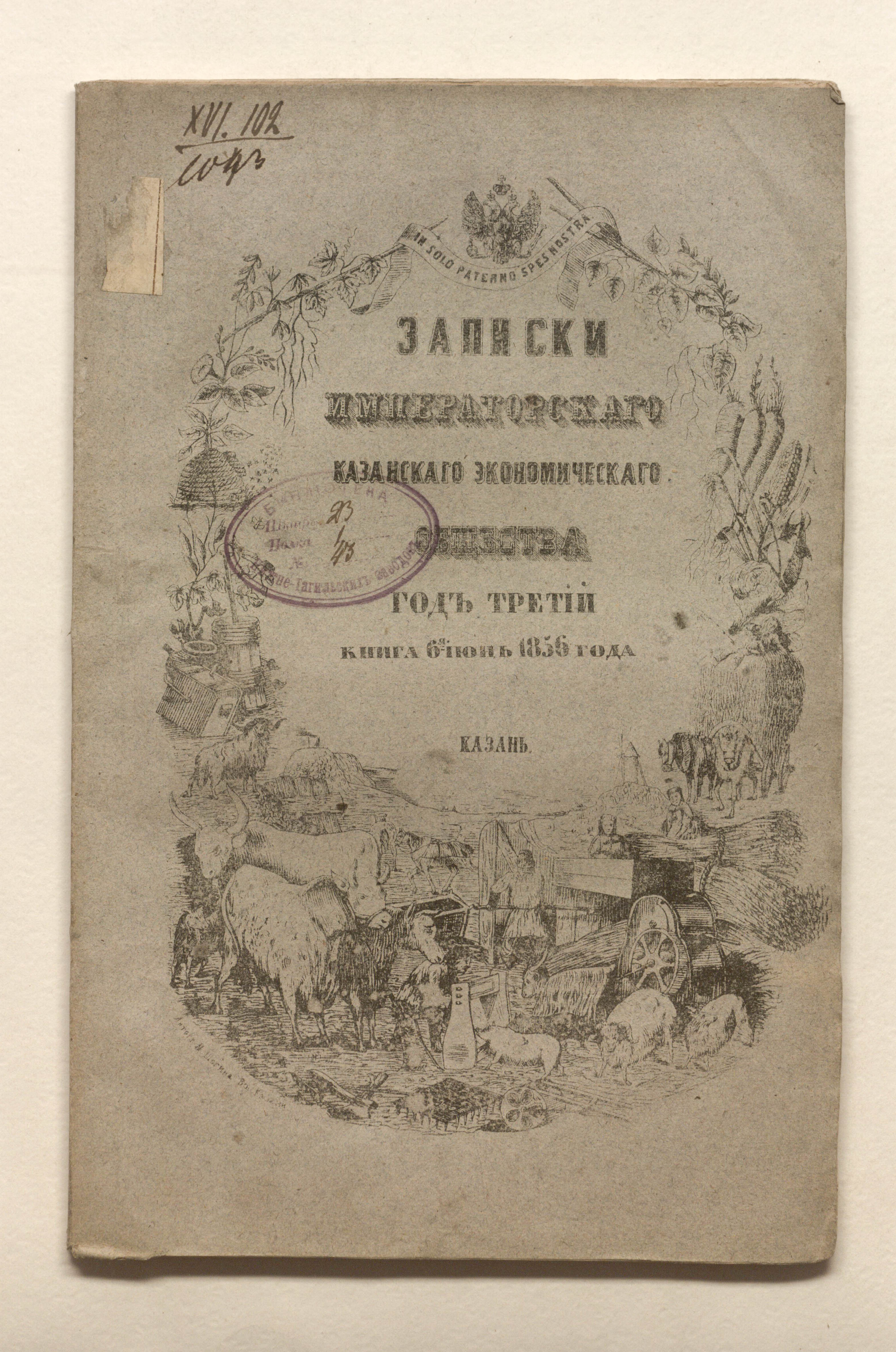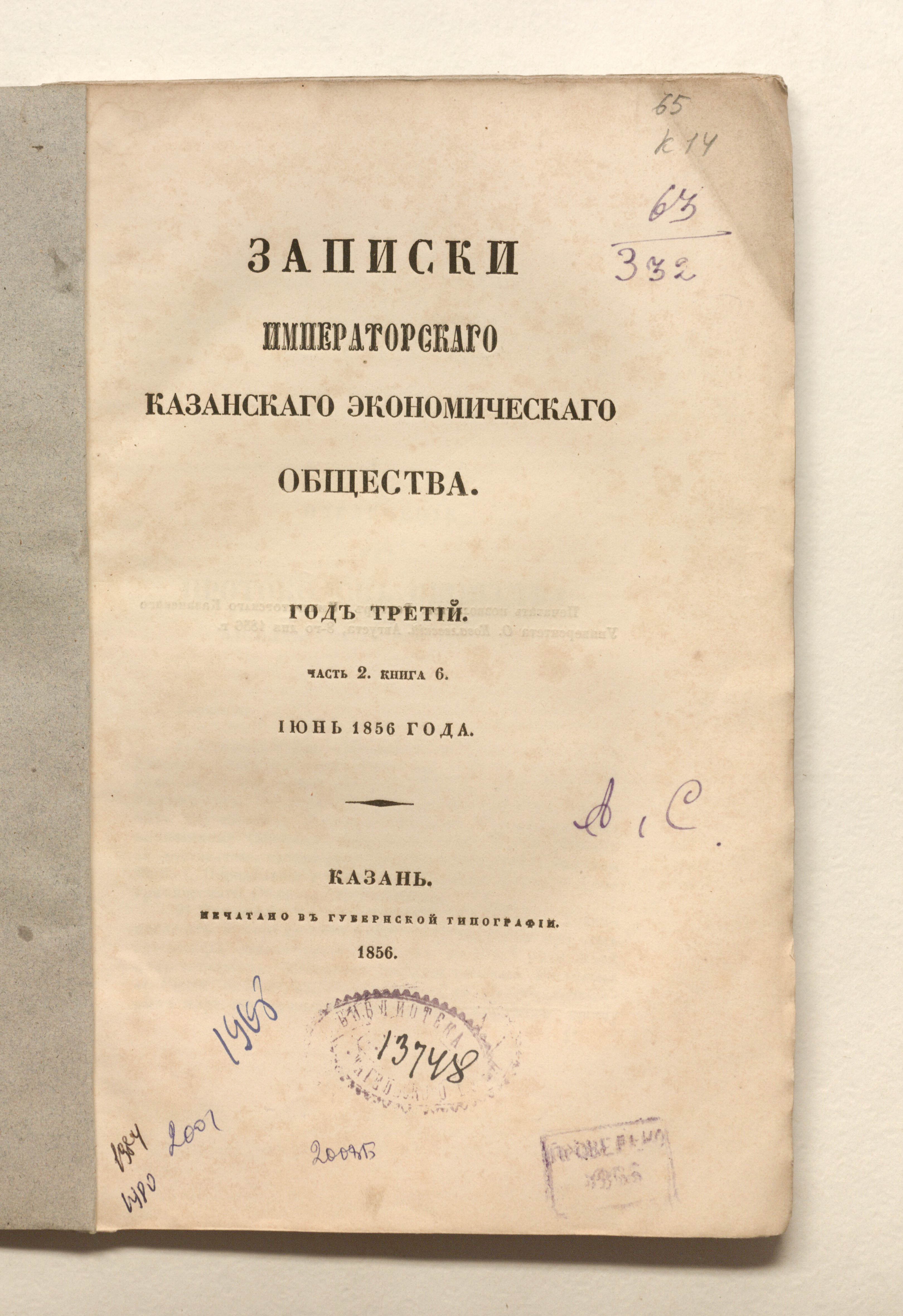 Записки Императорскаго Казанскаго Экономическаго Общества. Книга 6. Июнь / Казанское экономическое общество ; ред. М. Я. Киттары. — Казань : [б. и.], 1856 (в Губернской типографии). — раздельная пагинация. ; 26х17 см.
