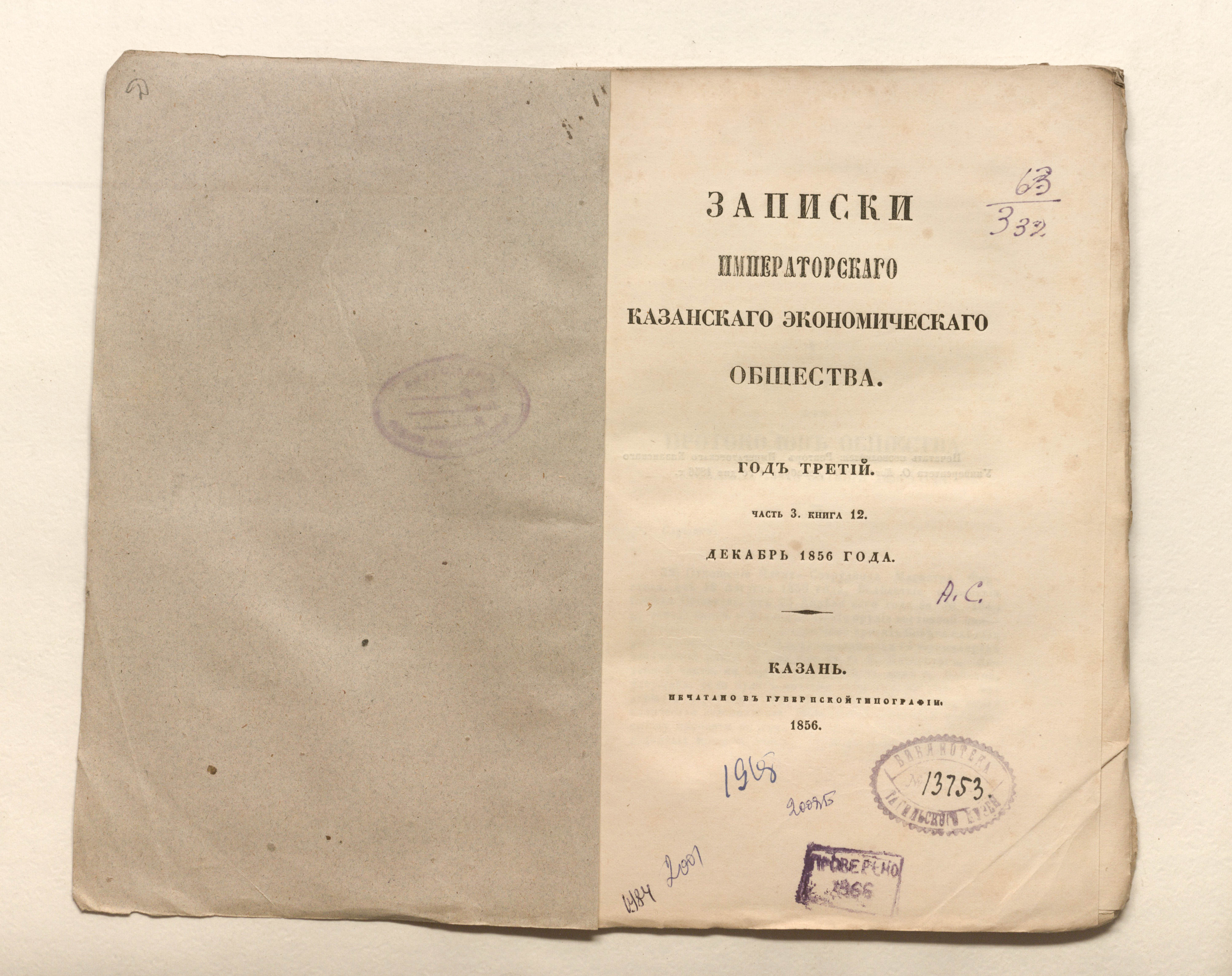 Записки Императорскаго Казанскаго Экономическаго Общества. Книга 12. Декабрь / Казанское экономическое общество ; ред. М. Я. Киттары. — Казань : [б. и.], 1856 (в Губернской типографии). — раздельная пагинация. ; 25,5х17 см.