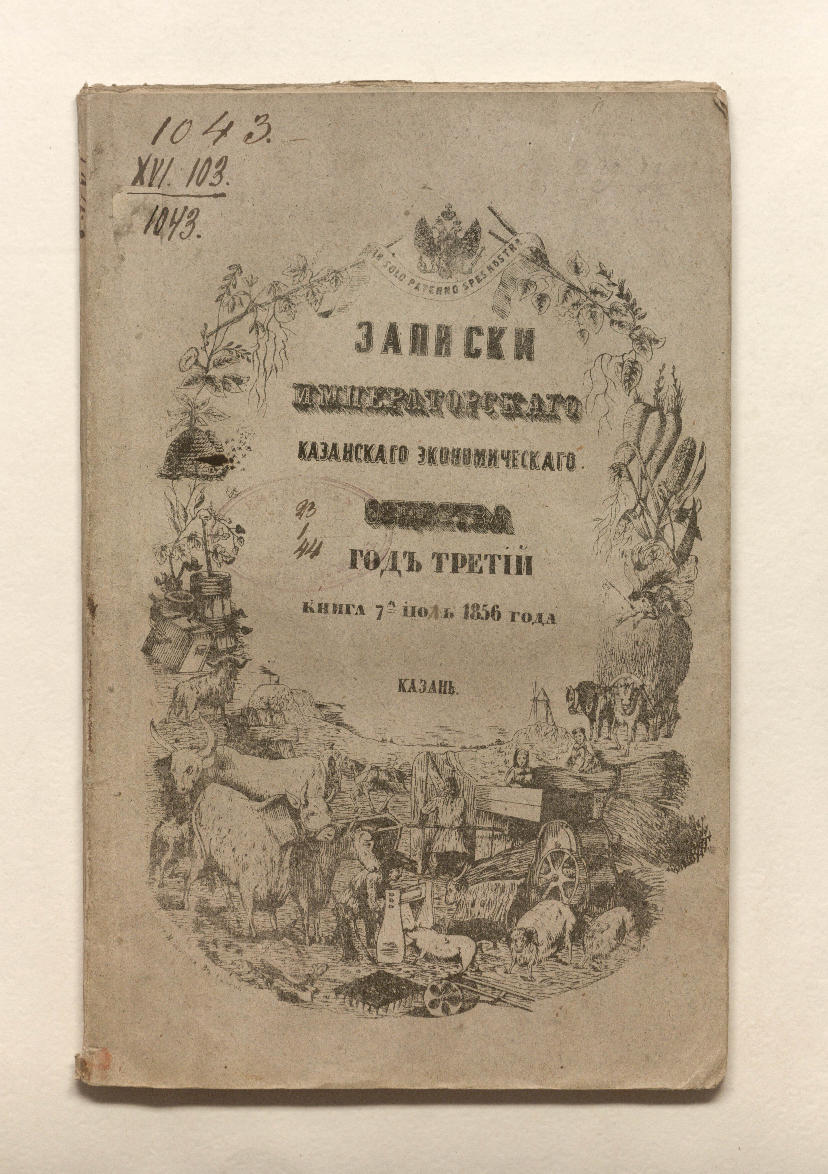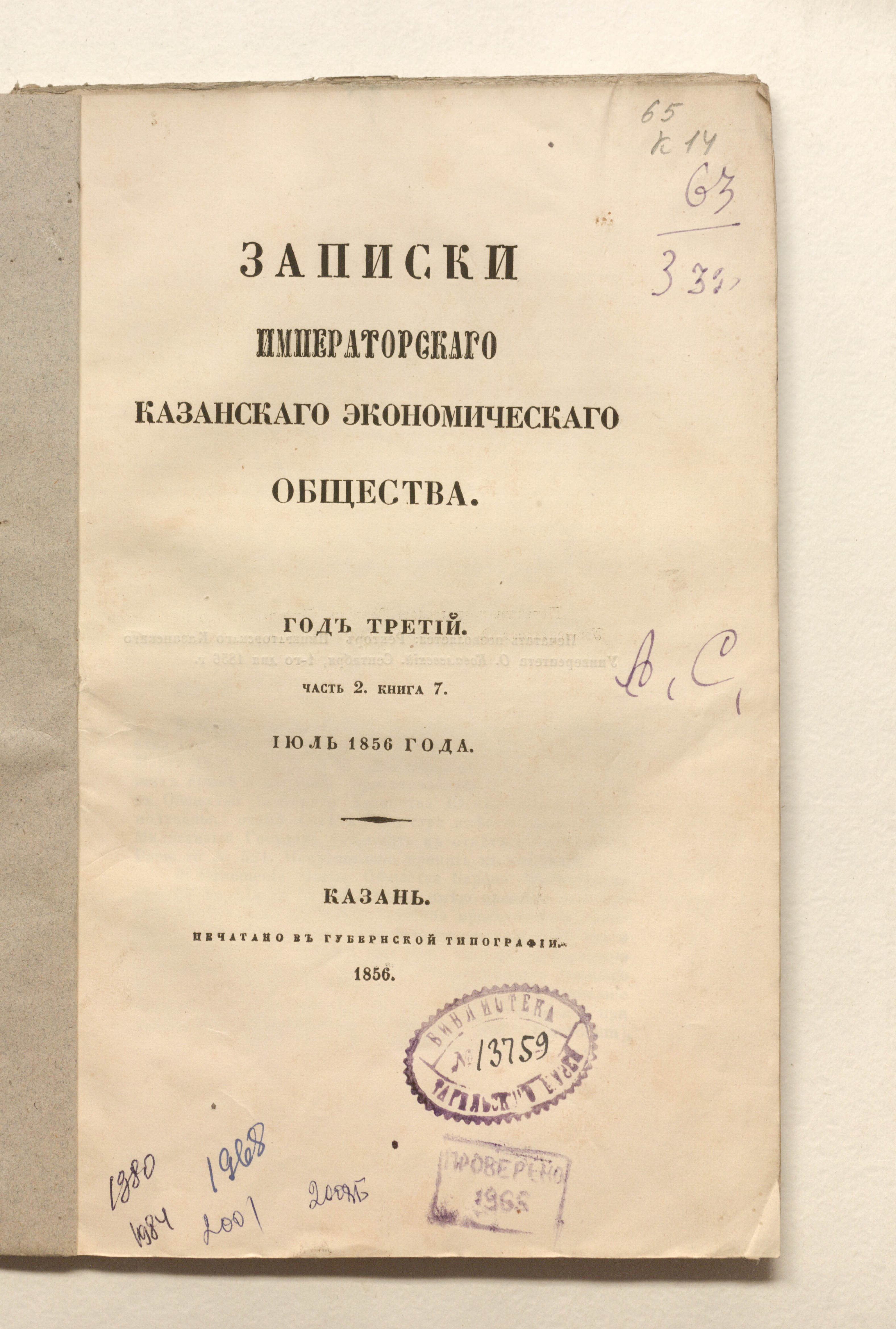 Записки Императорскаго Казанскаго Экономическаго Общества. Книга 7. Июль / Казанское экономическое общество ; ред. М. Я. Киттары. — Казань : [б. и.], 1856 (в Губернской типографии). — раздельная пагинация. ; 26х17 см.