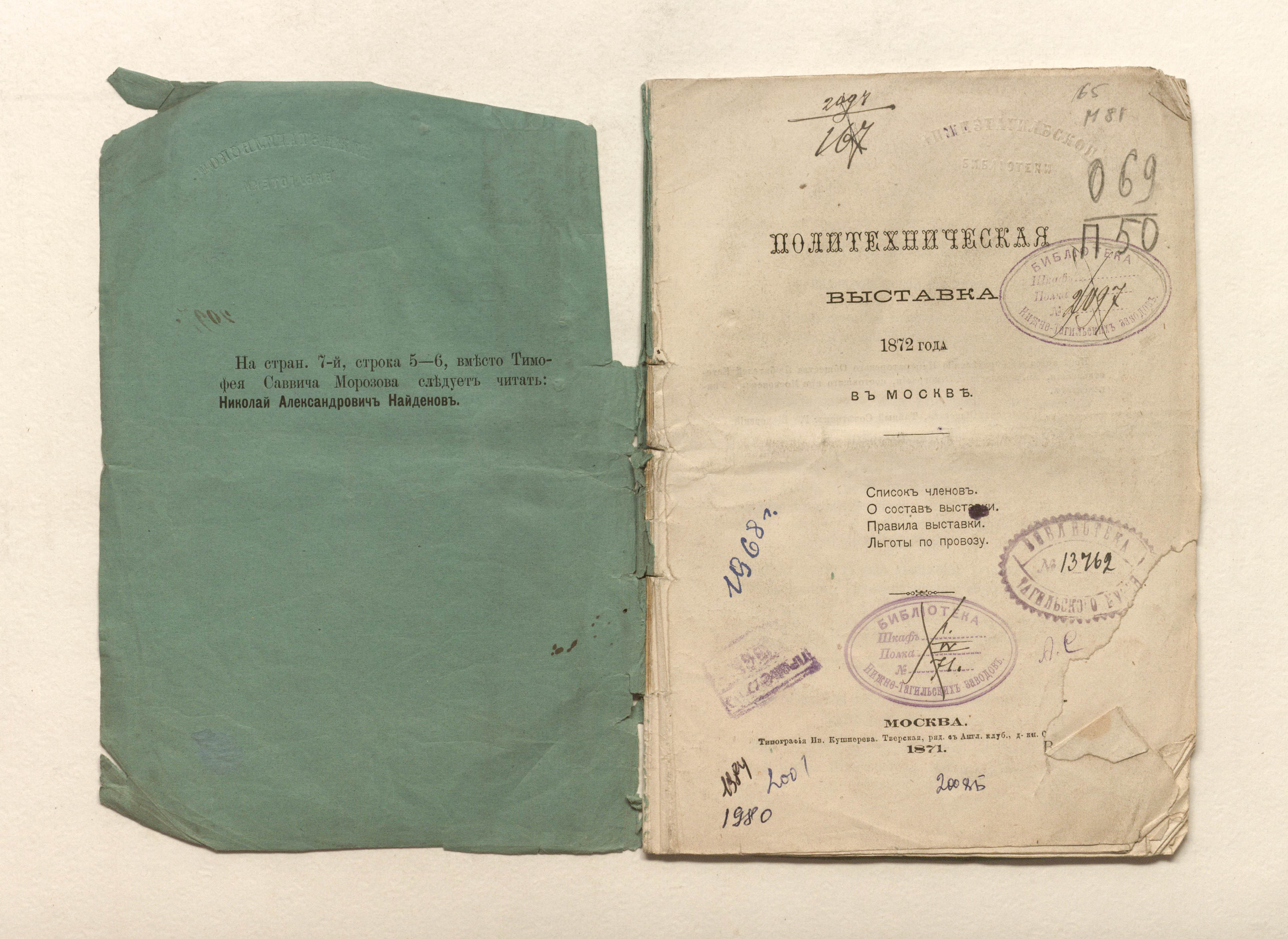 Политехническая выставка 1872 года в Москве : список членов. О составе Выставки. Правила Выставки. Льготы по провозу / Московская политехническая выставка. — Москва : тип. Ив. Кушнерева, 1871. — 46 с. ; 21,5х13,5 см.