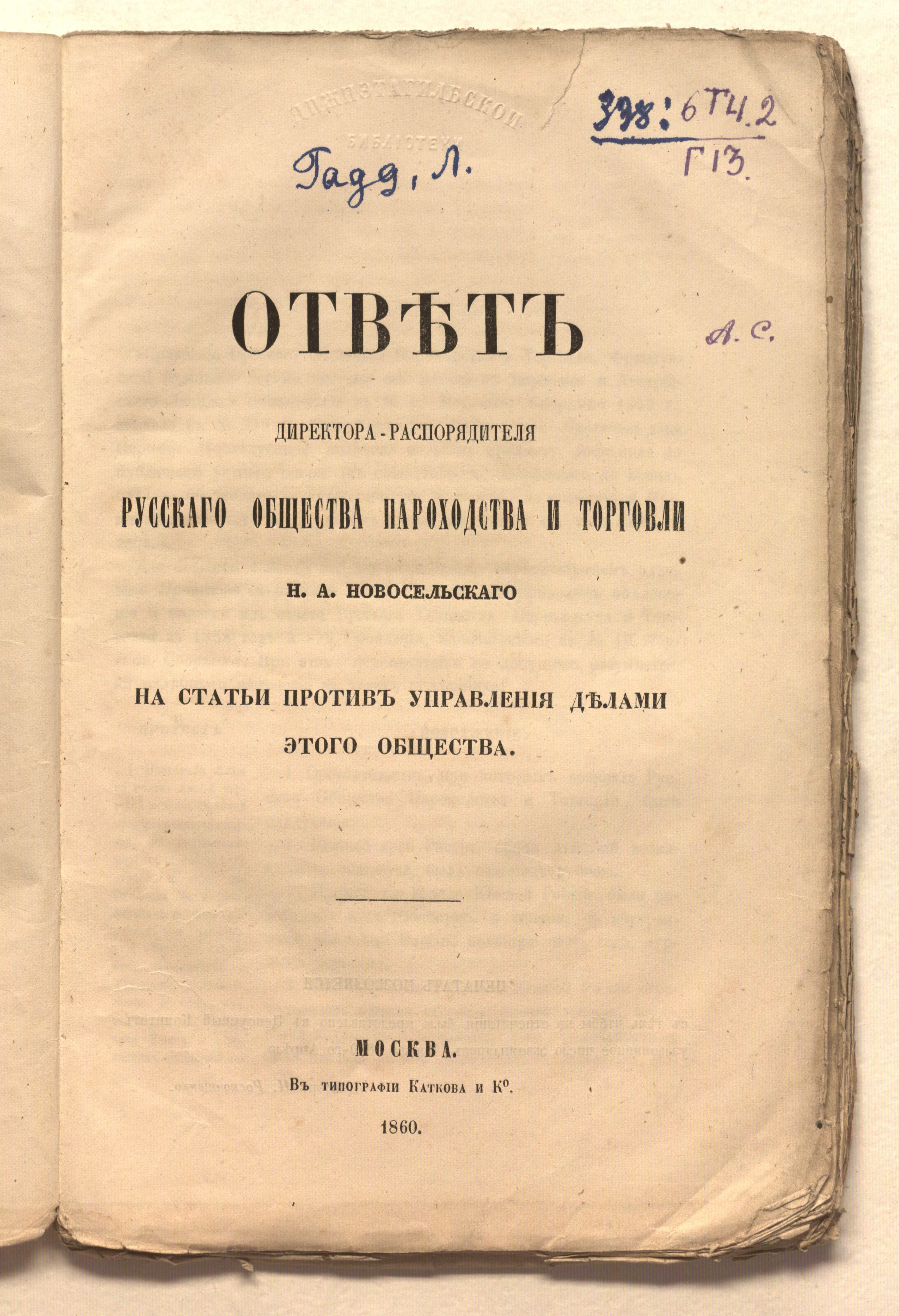 Ответ директора-распорядителя Русского общества пароходства и торговли Н. А. Новосельского на статьи против управления делами этого Общества / Н. А, Новосельский. — Москва : в типографии Каткова и К, 1860. — 109, X с. ; 25х16 см.