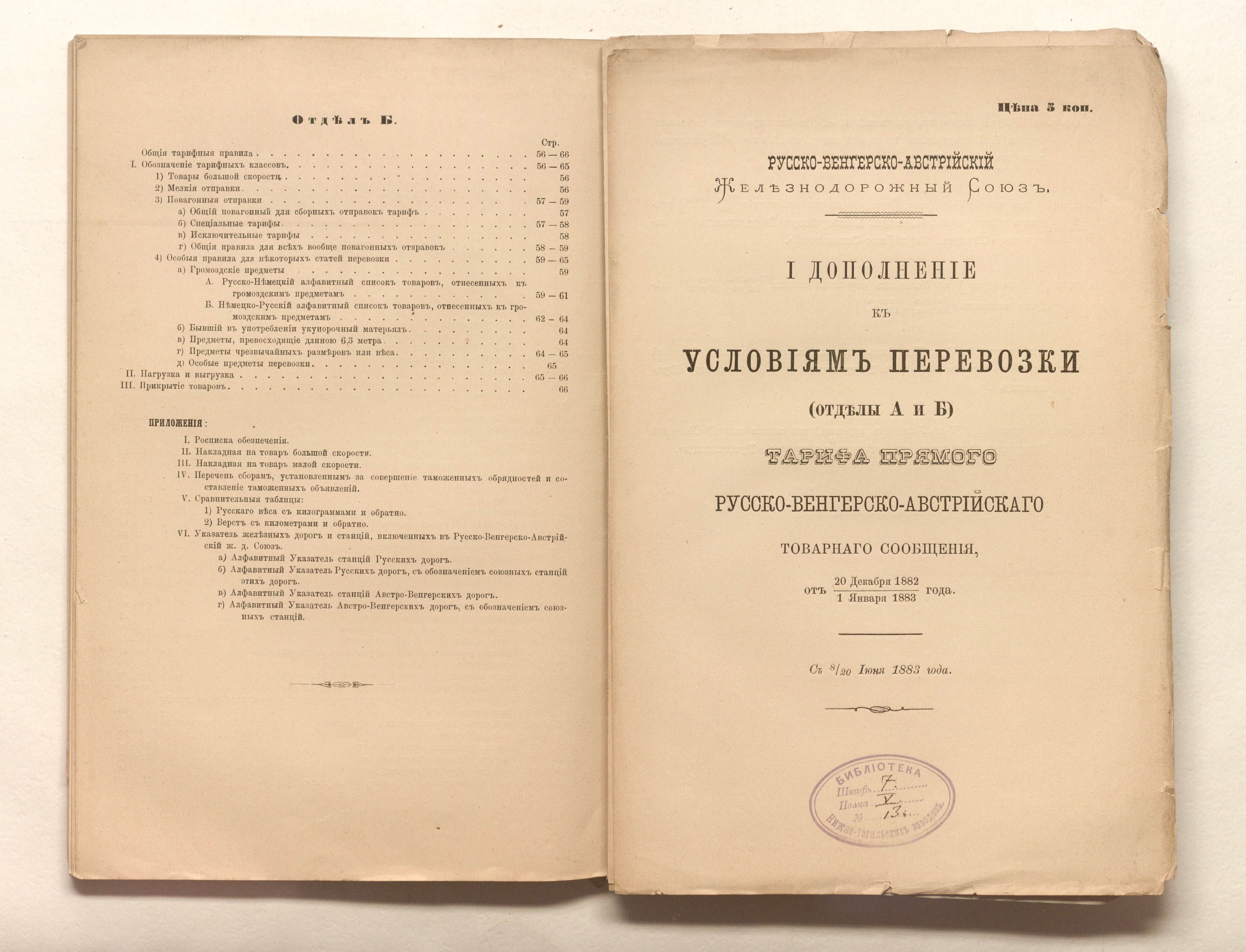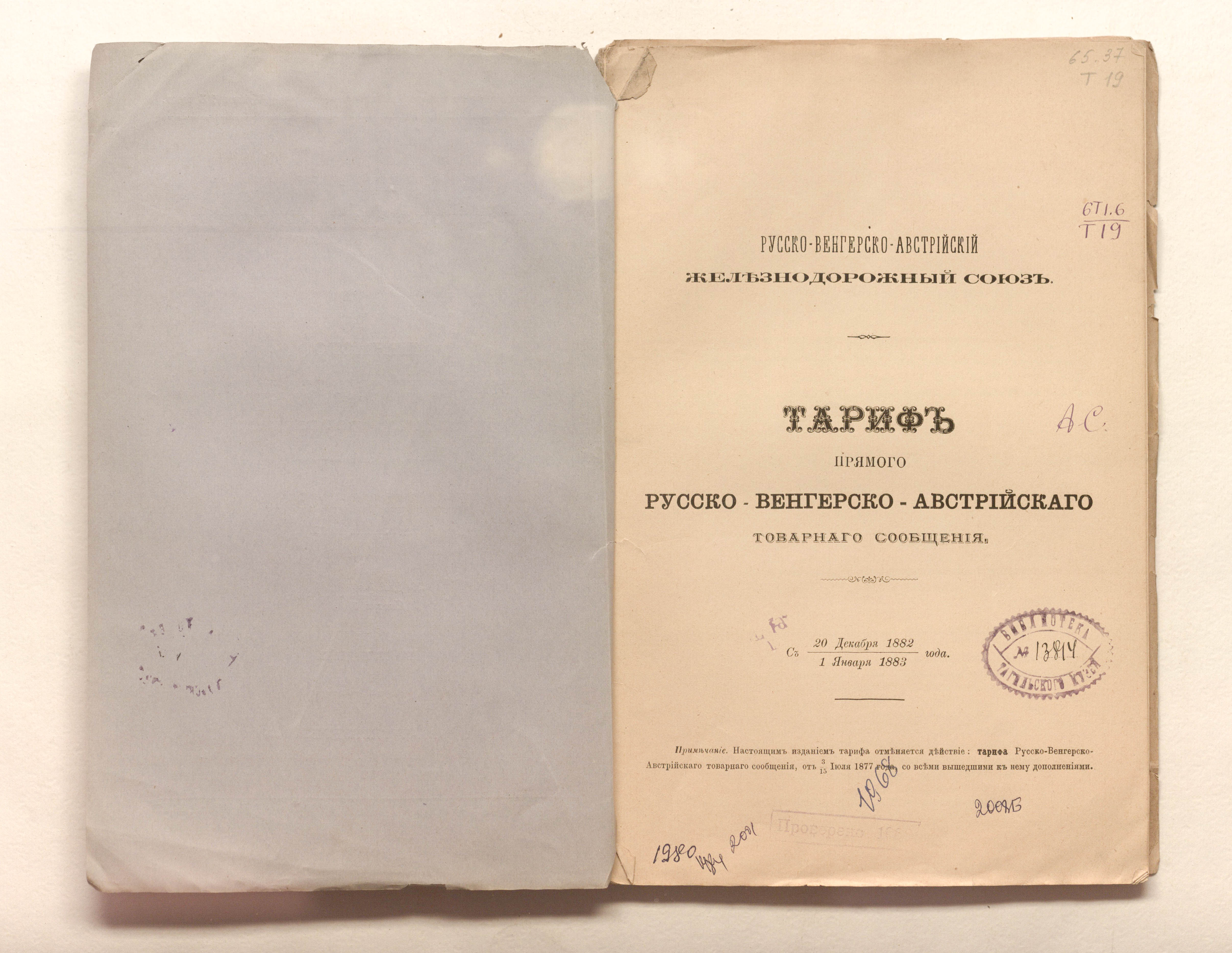 Тариф прямого русско-венгерско-австрийского товарного сообщения от 20 декабря 1882/1 января 1883 года : условия перевозки. — 2-е изд. — Санкт-Петербург : Типография братьев Шумахер, 1883. — 66, [4], 7, [5],13 с. : табл. ; 26,5х17,5 см.