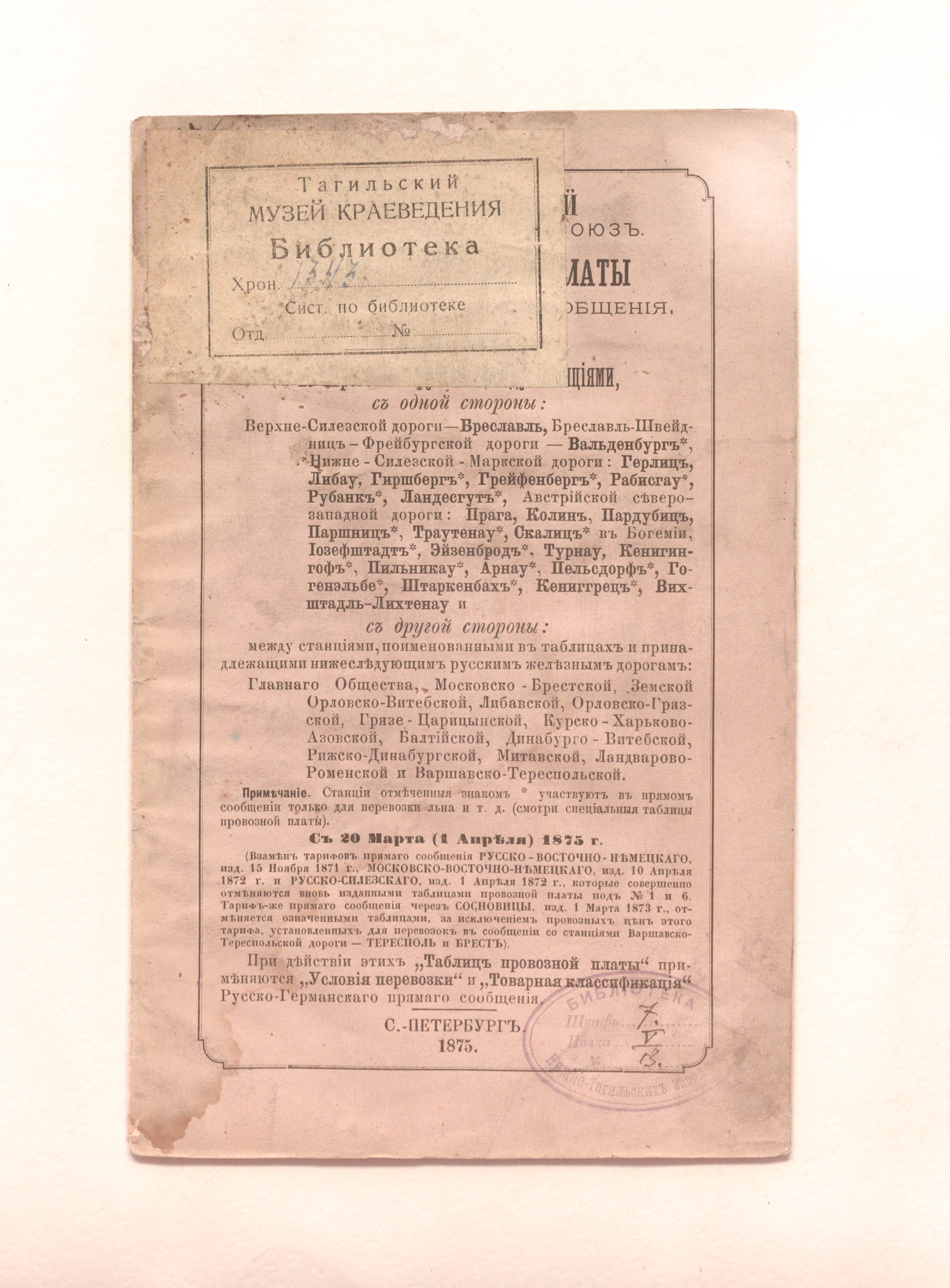 Таблица провозной платы прямого товарного сообщения № VI по перевозке грузов между станциями с одной стороны: Верхне-Силезской железной дороги и с другой стороны: между станциями поименованными в таблицах и принадлежащим нижеследующим железным дорогам: Главного общества, Московско-Бресткой [и др.] / Русско-Германский железно-дорожный союз. — Санкт-Петербург : тип. братьев Шумахер, 1875. — 21, 5, [4] с. ; 22х14 см.