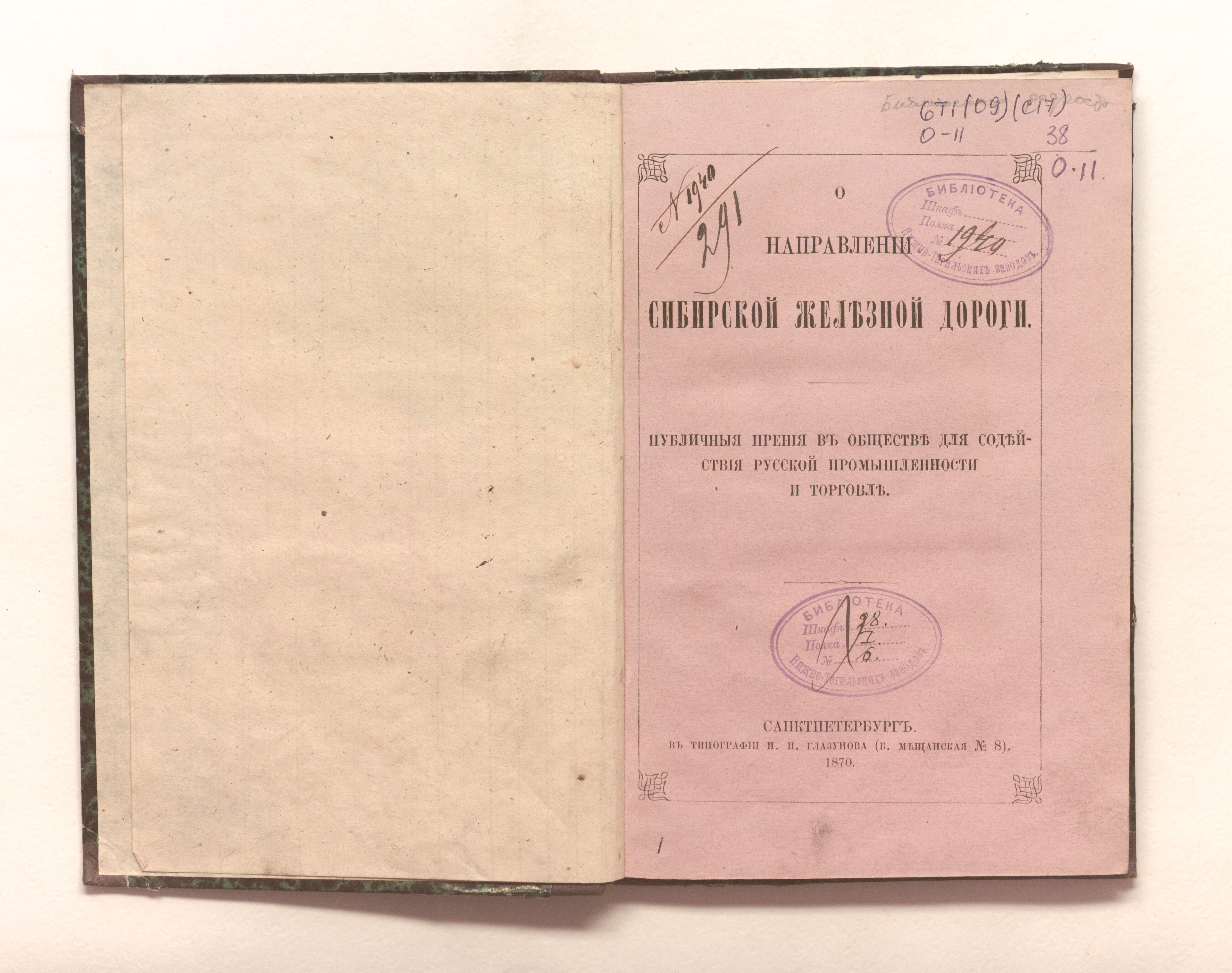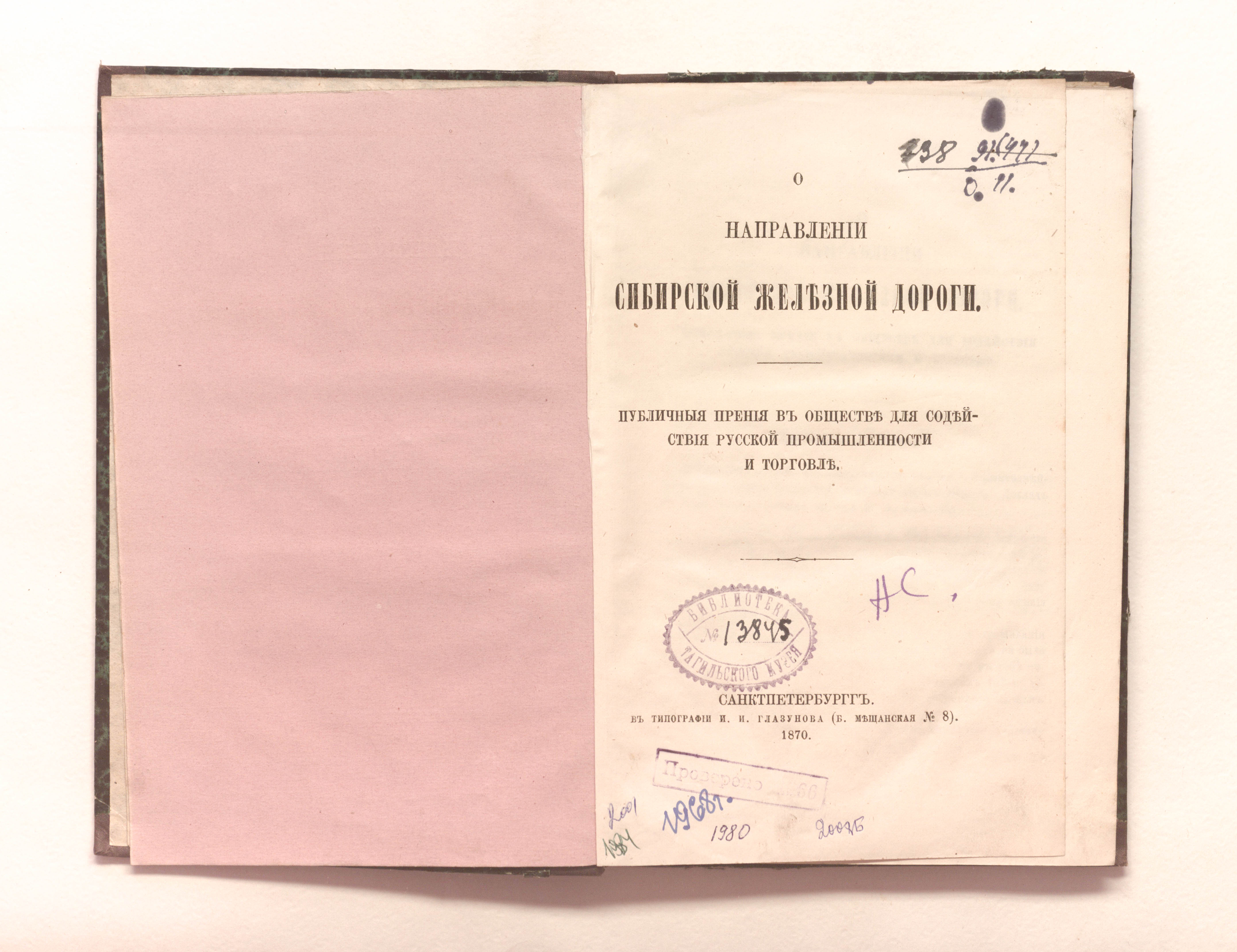 О направлении Сибирской железной дороги : публичные прения в Обществе для содействия русской промышленности и торговле. — Санкт-Петербург : тип. И. И. Глазунова, 1870. — 215 с. ; 22,5х15 см.