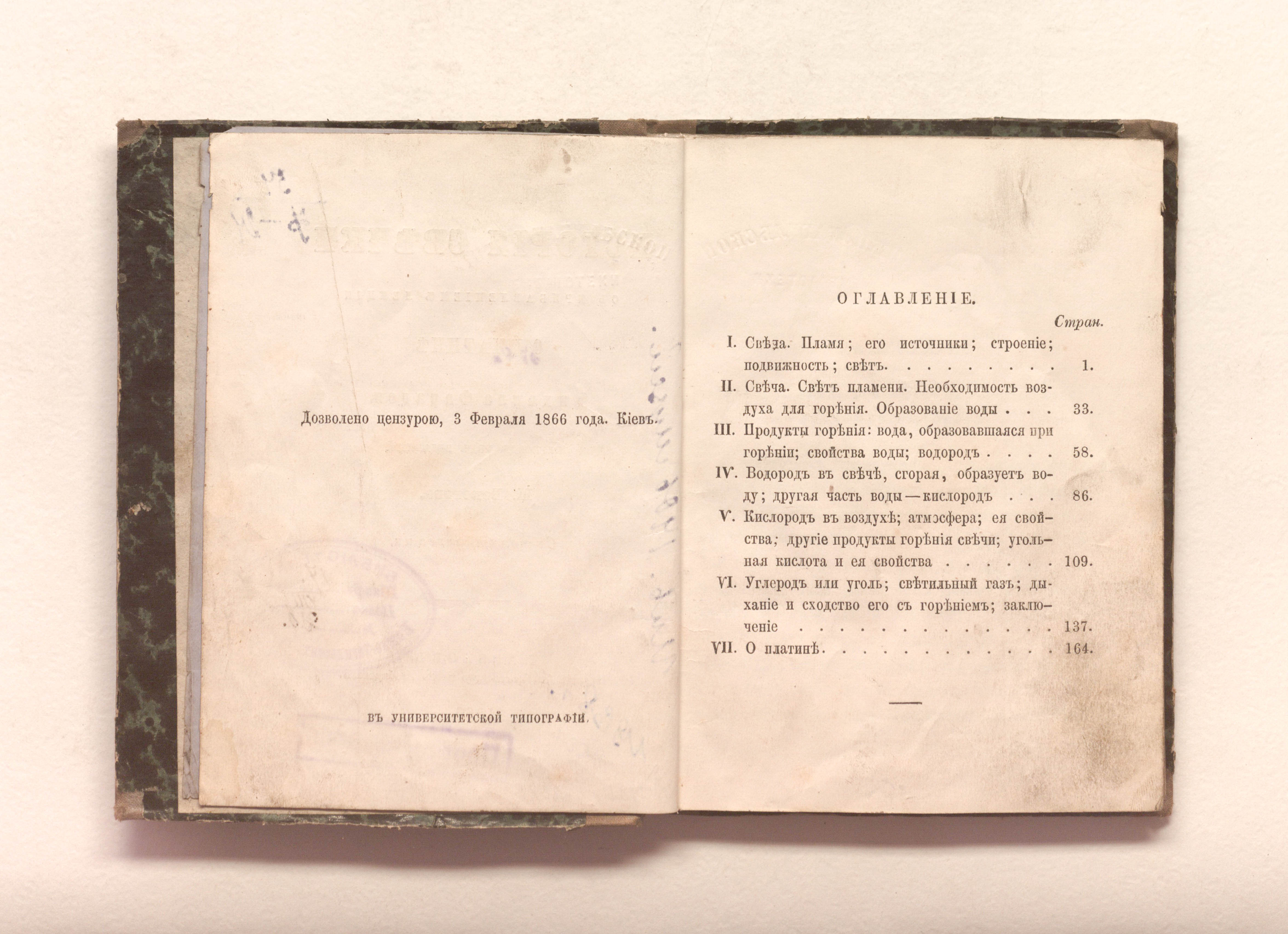 Фарадей, Майкл (1791-1867). История свечки с прибавлением лекции о платине Михаила Фарадея : с политипажами / перевод под редакцией Н. Бекетова. — Харьков : Издание Ал. Зеленскаго и Ев. Любарскаго, 1866. — 191 с. : ил. ; 16х12 см.