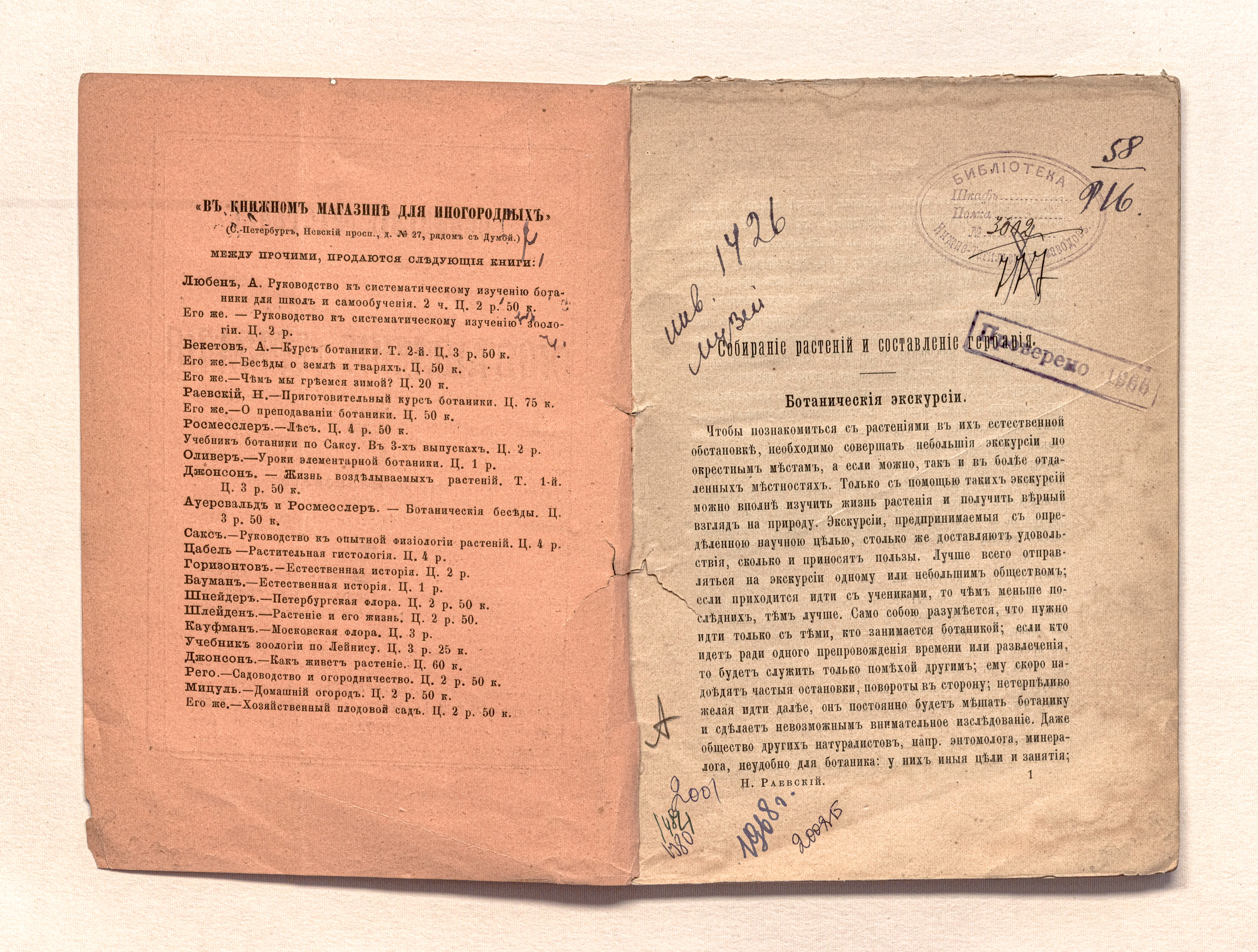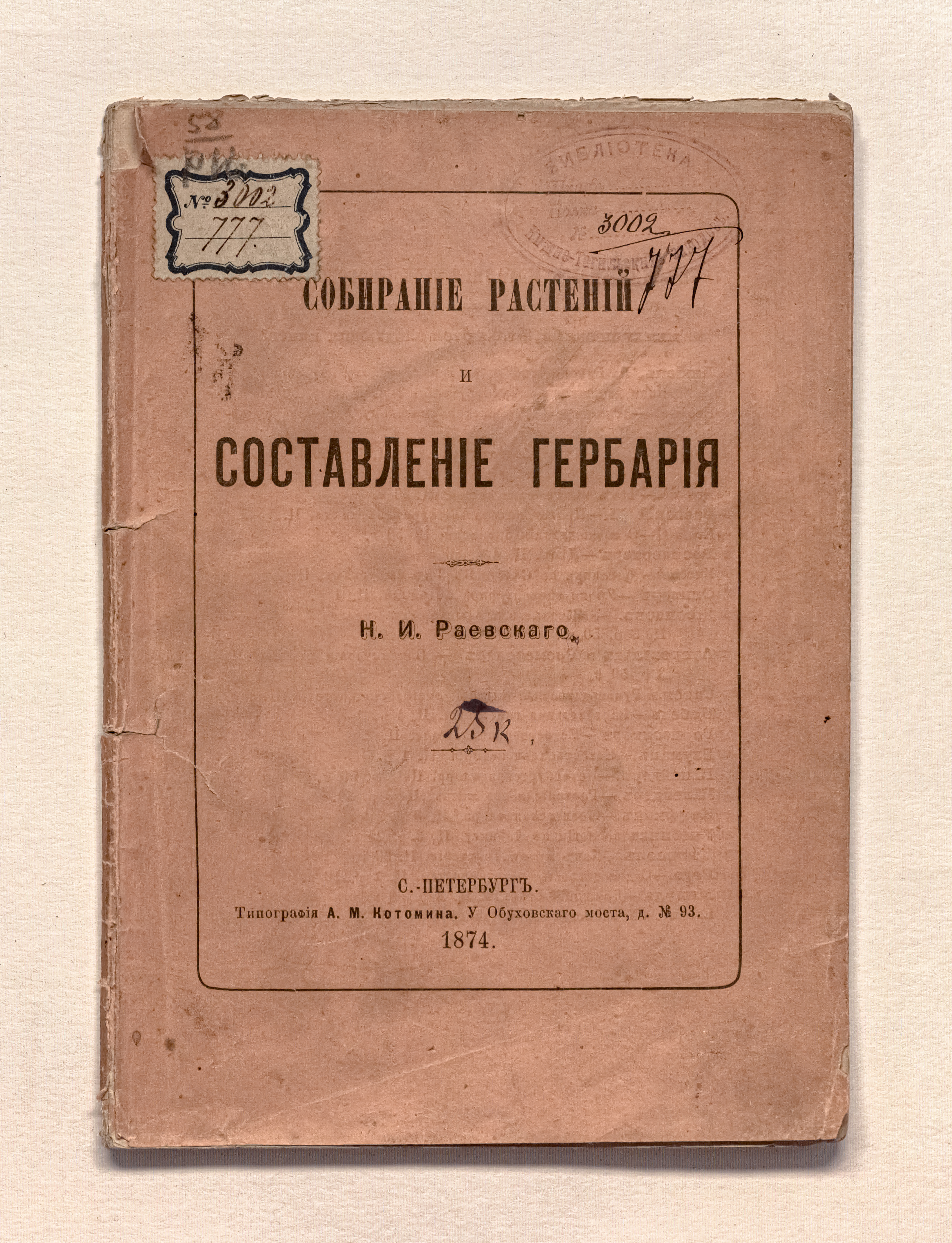 Раевский, Н. И. (1835-1898). Собирание растений и составление гербария / Н.И. Раевский. – Санкт-Петербург : тип. А.М. Котомина, 1874. – 64 с. ; 19х13,5 см.