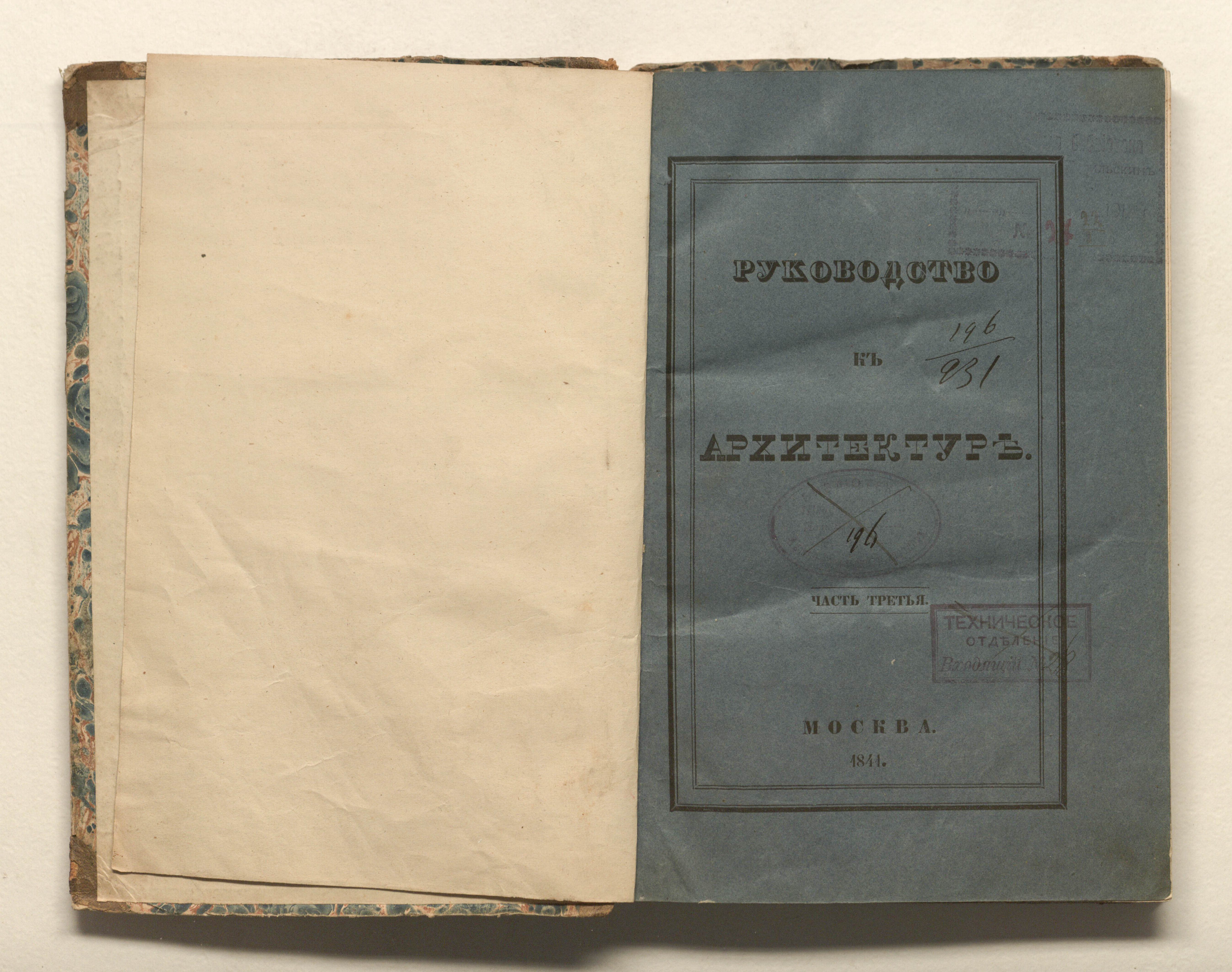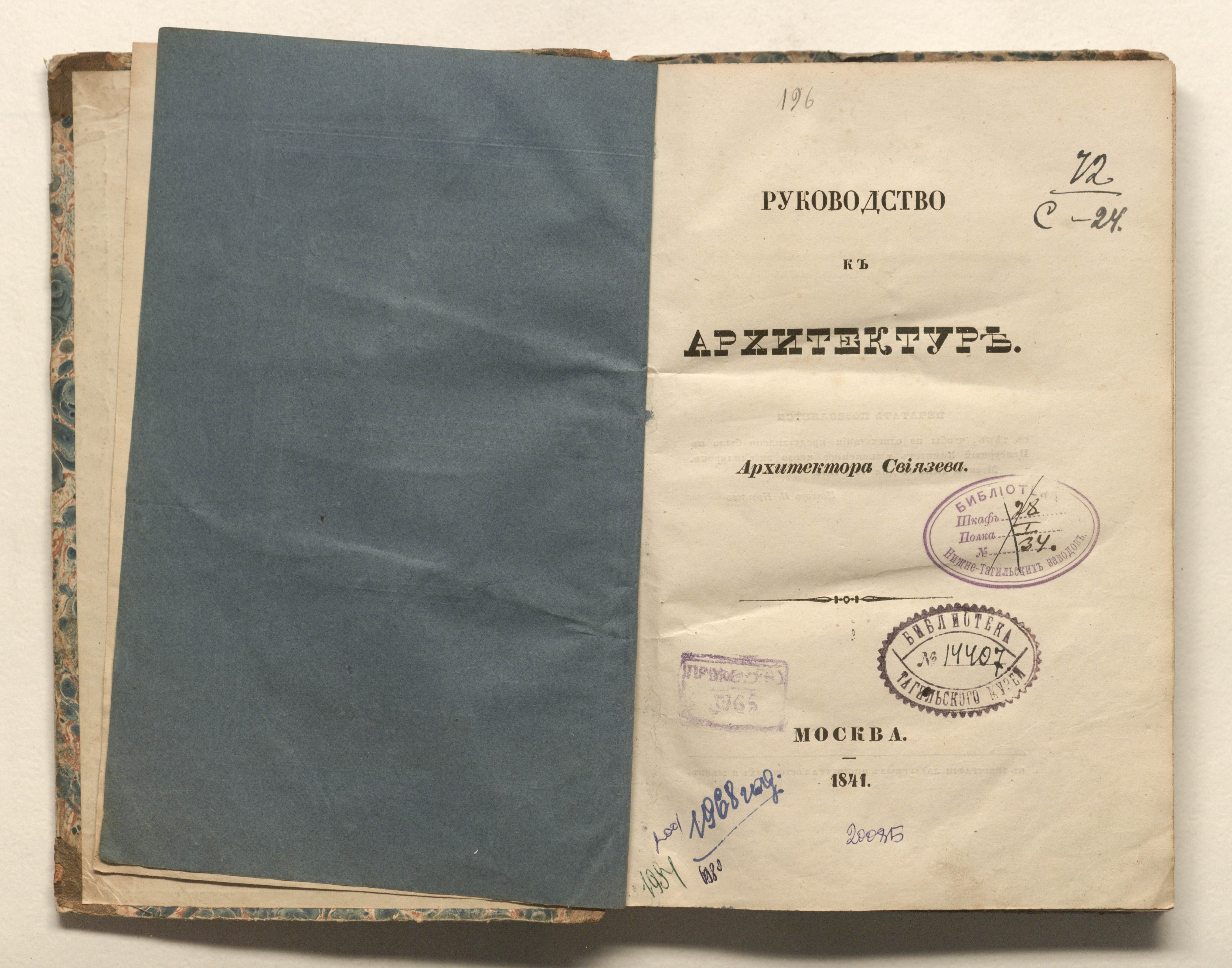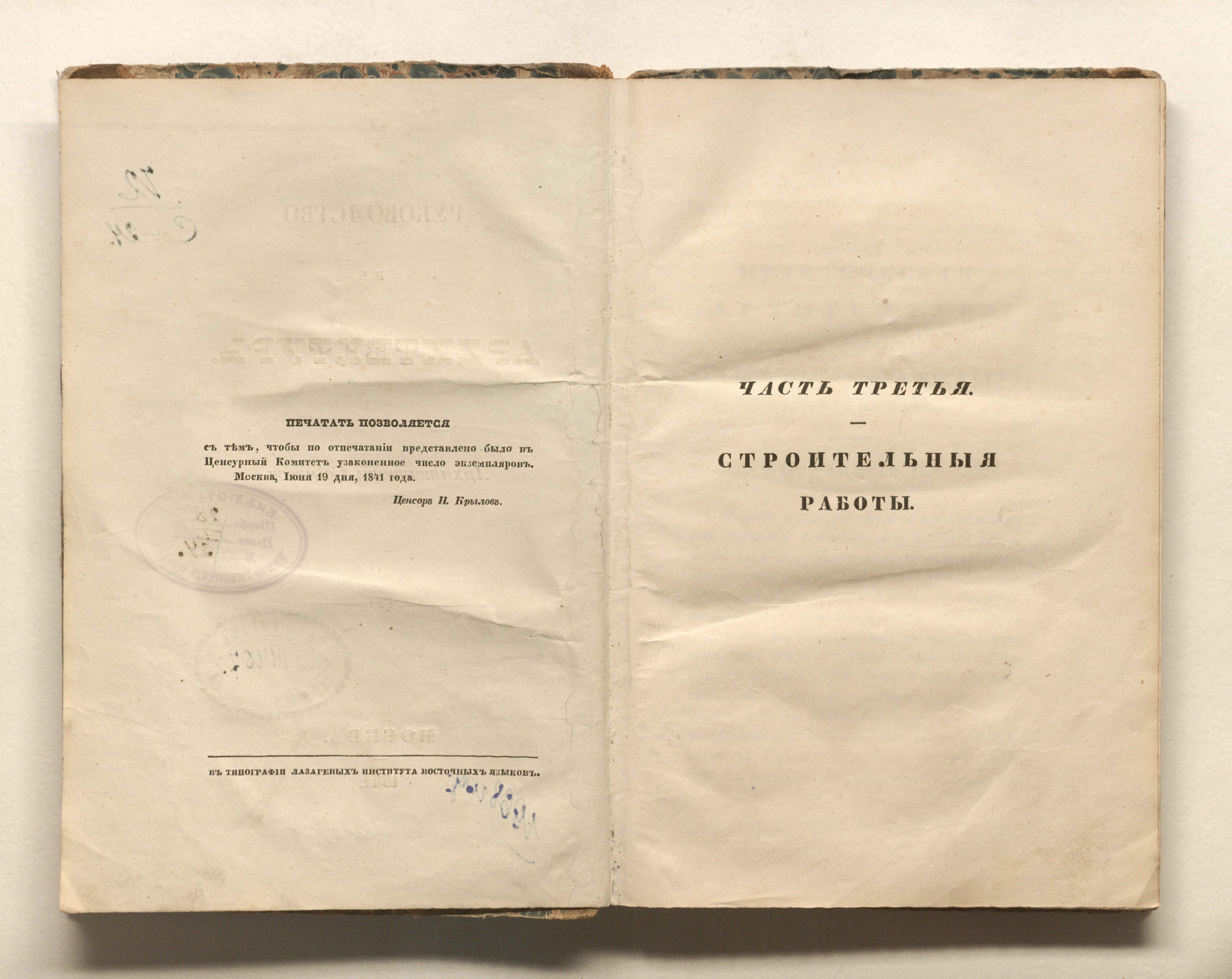 Руководство к архитектуре. Ч. 3. Строительные работы / [соч.] архитектора Свиязева. — Москва : тип. Лазаревых института восточных языков, 1841. — [4], 323, VII с. ; 23х15 см.