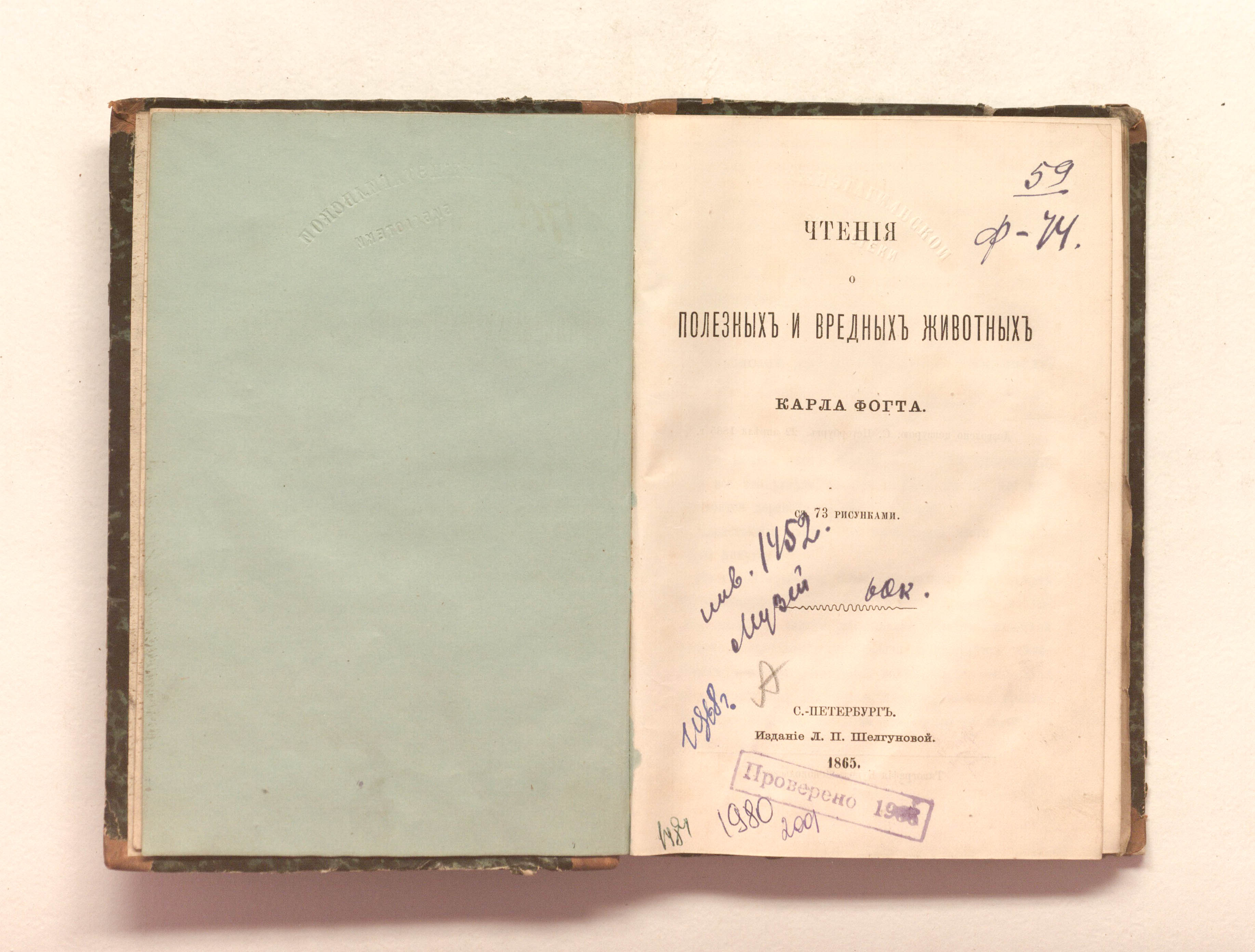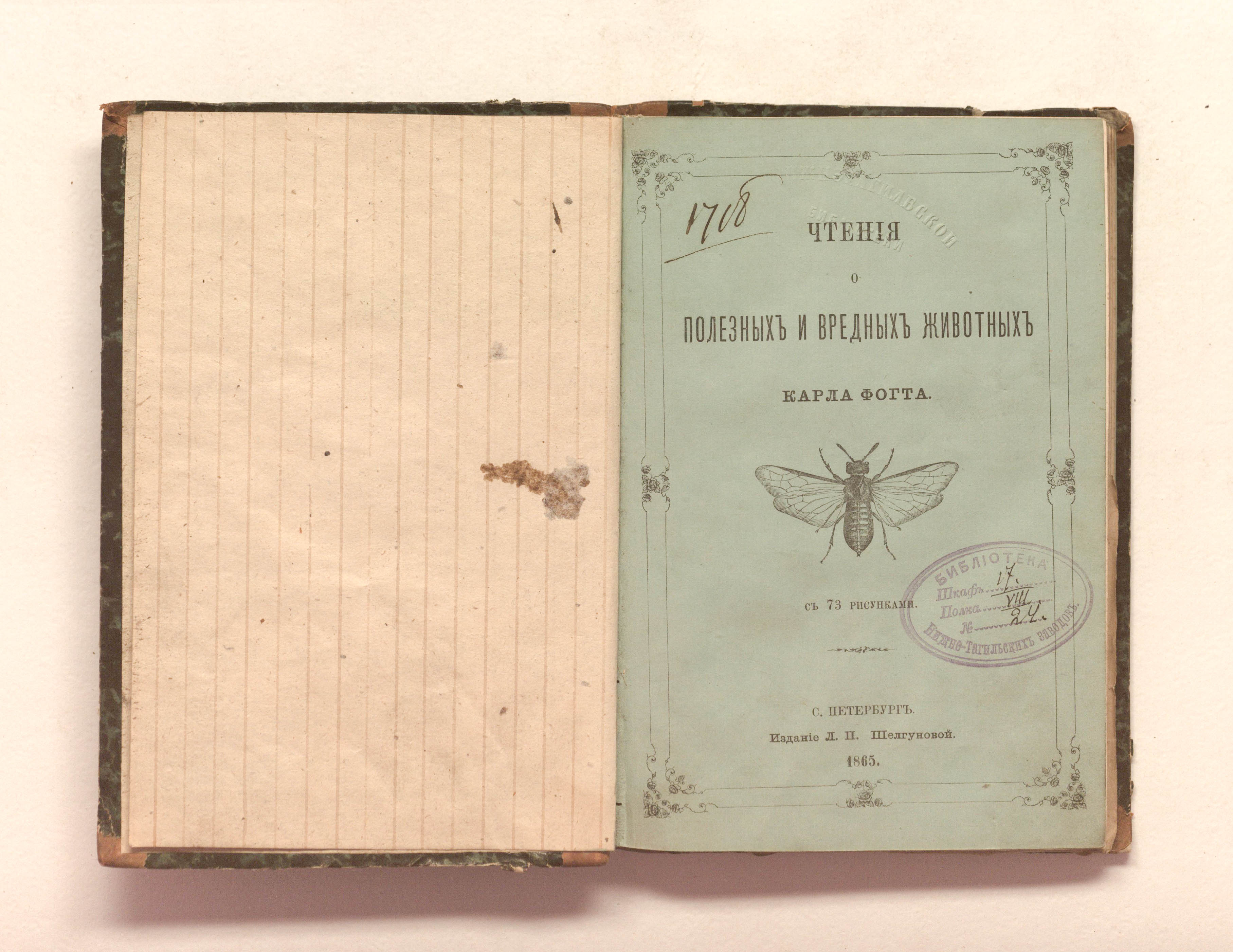 Чтения о полезных и вредных животных : с 73 рисунками / К. Фогт. — Санкт-Петербург : Изд. Л. П. Шелгуновой, 1865. — V, 246 с. : ил. ; 18х12,5 см.