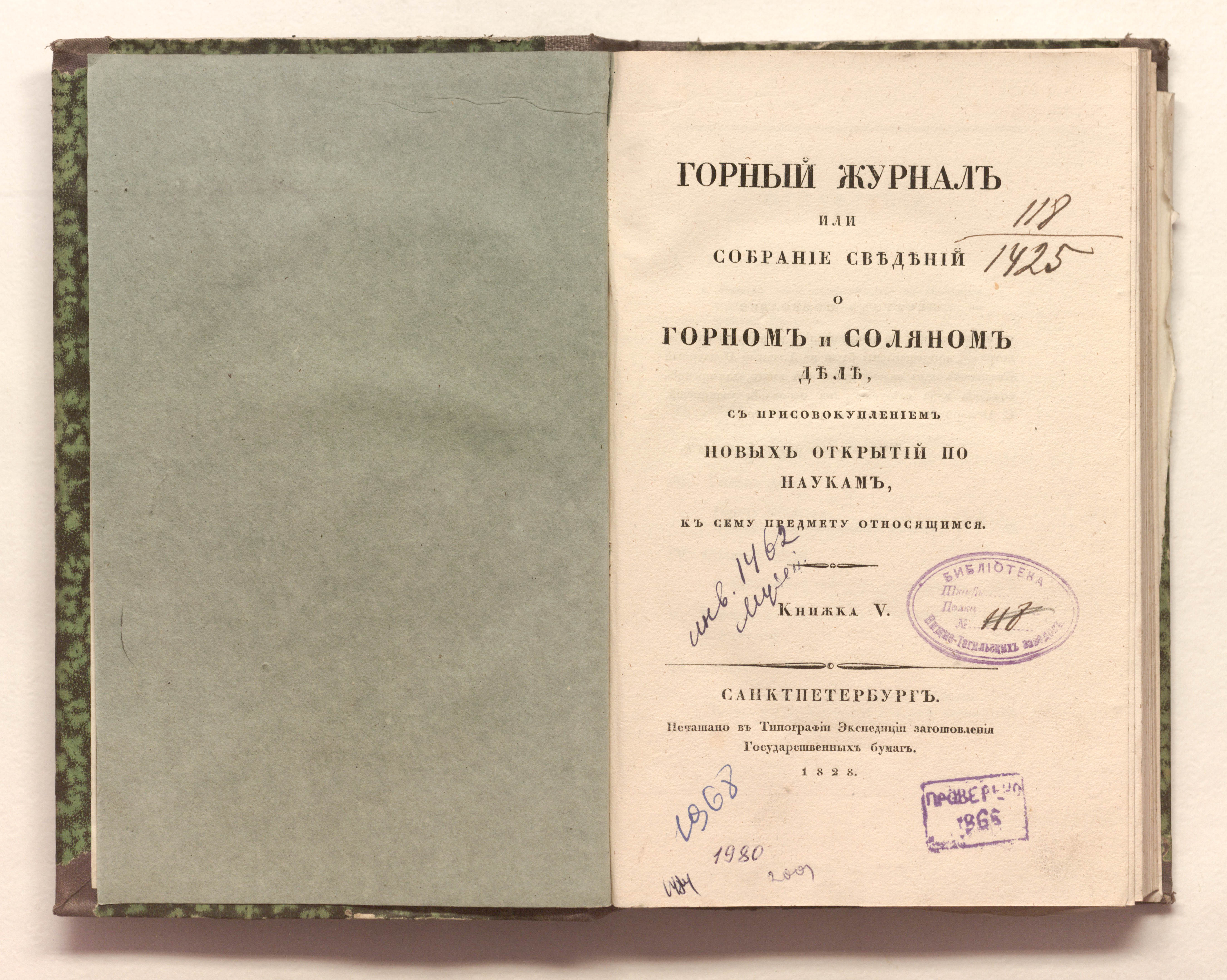 Кн. 5. – Санкт-Петербург : печатано в типографии Экспедиции заготовления Государственных бумаг, 1828. – [4], 171, [1] с. : [2] л. черт. ; 24х14,5 см.