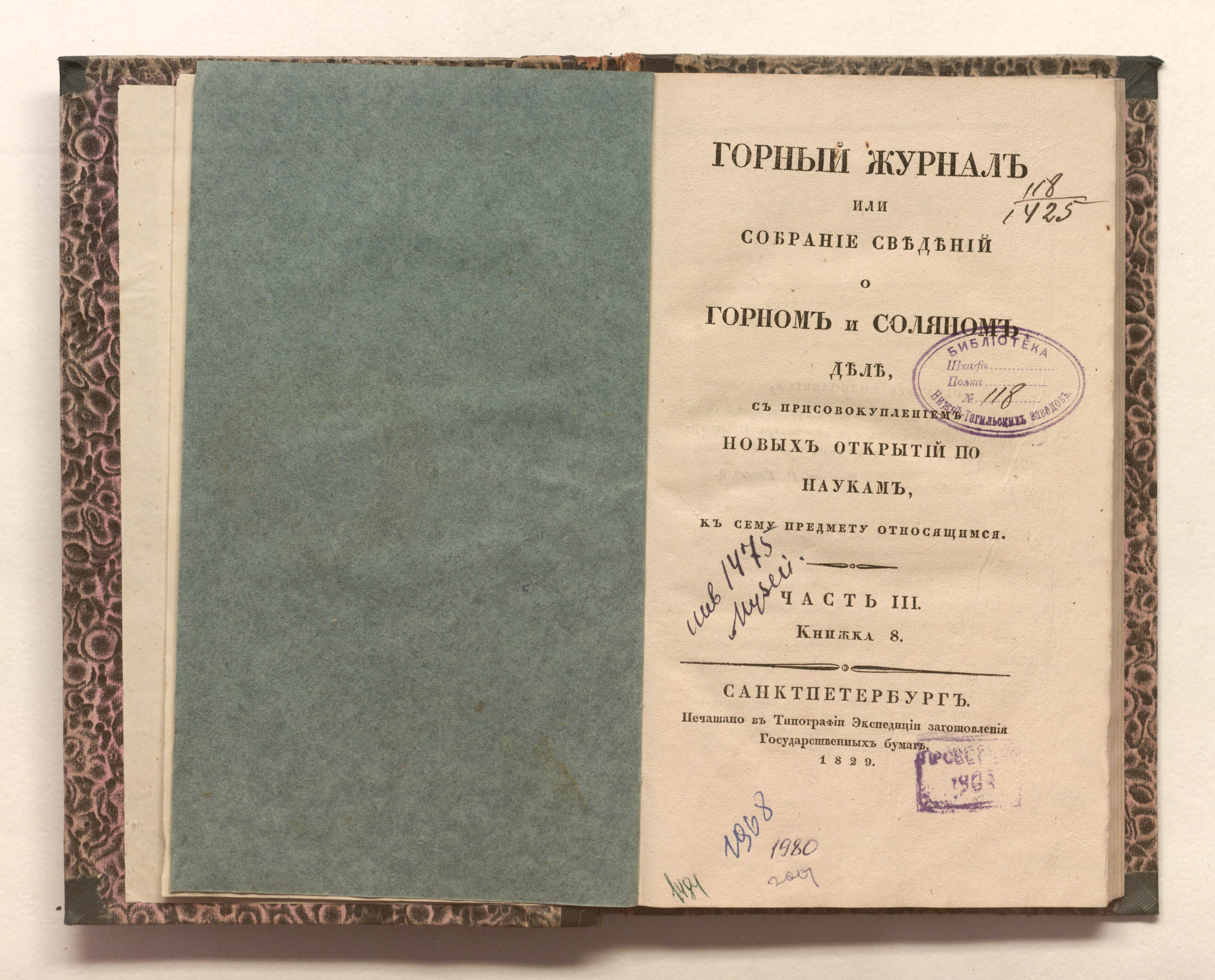 «Библиотека Нижне-Тагильских заводов. № 118» (форзац, тит. л.).