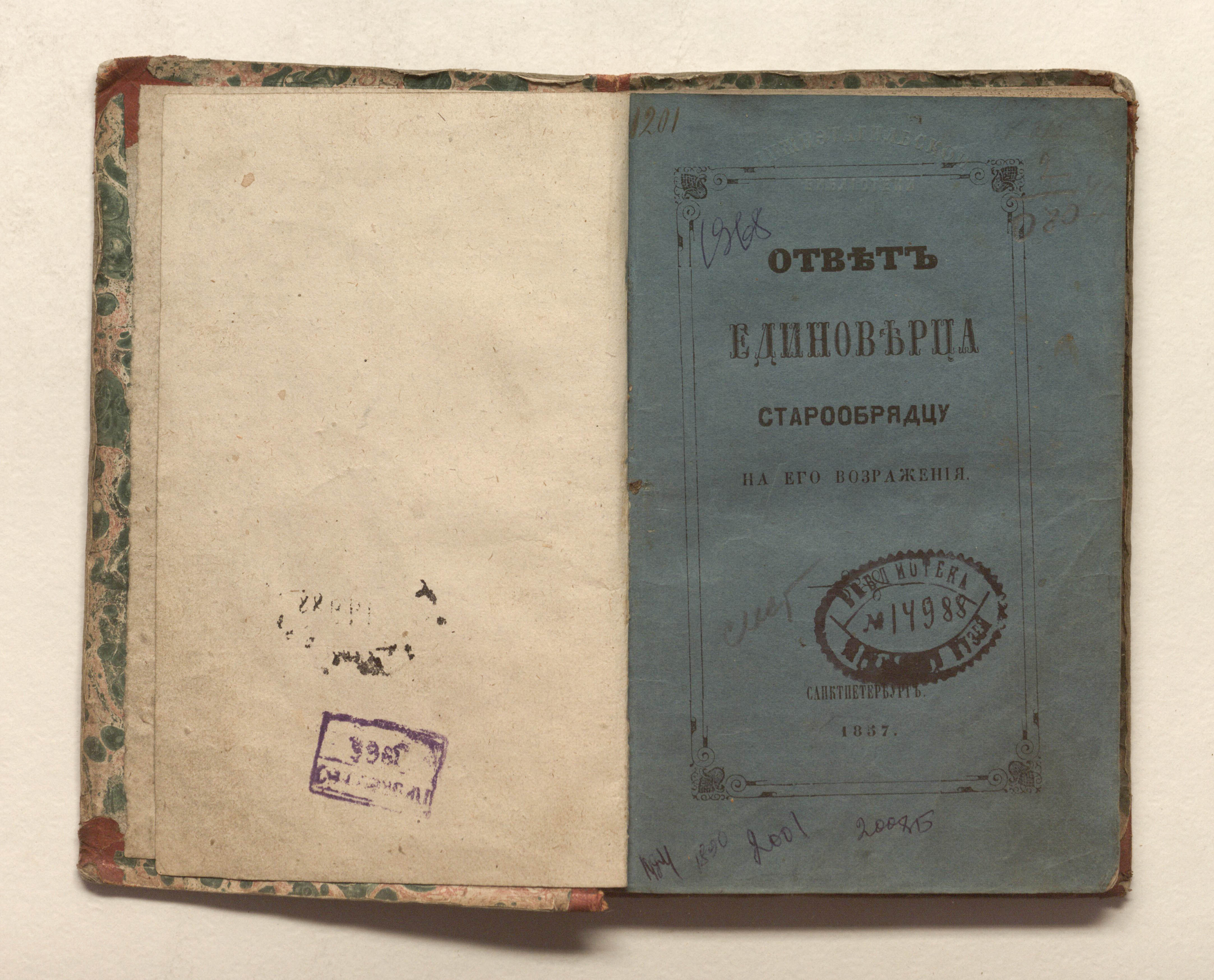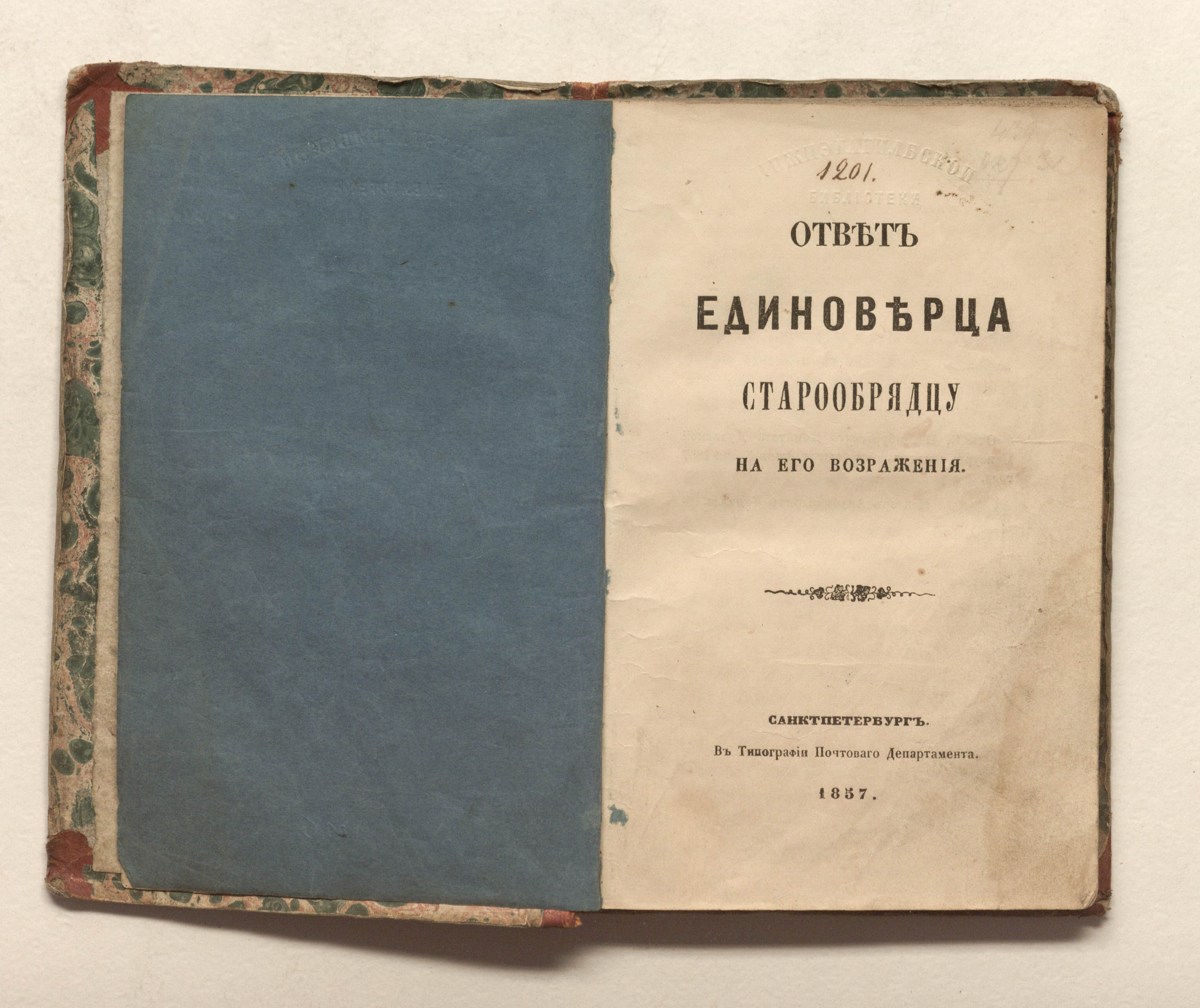 Ответ единоверца старообрядцу на его возражения / Григорий. — Санкт-Петербург : типография Почтового департамента, 1857. — 120 с. ; 18х12 см.