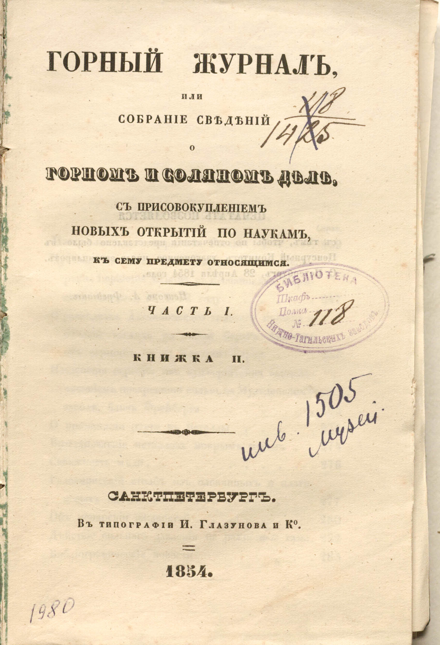 Горный журнал или Собрание сведений о горном и соляном деле, С присовокуплением новых открытий по наукам, к сему предмету относящимся. – Санкт-Петербург : печатано в Военной типографии Главнаго штаба его императорскаго величества ; в типографии Экспедиции заготовления государственных бумаг ; в типографии Карла Крайя ; в типографии императорской академии наук, 1825 - 1918.