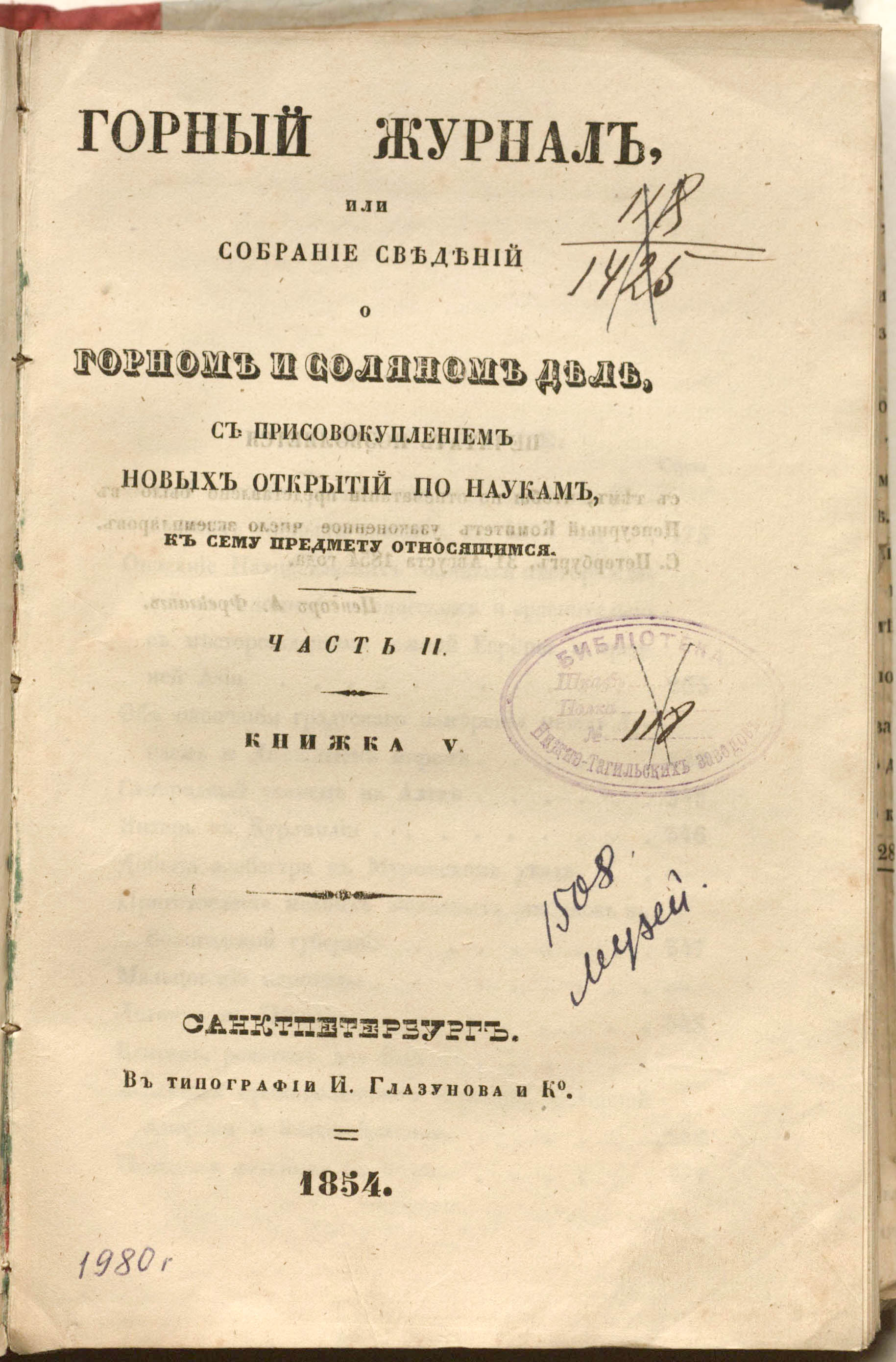 Ч. 2 Кн. 5. – Санкт-Петербург : в типографии И. Глазунова и К, 1854. – [4], 175-354 с. : 4 л. черт. ; 22,5х15 см.