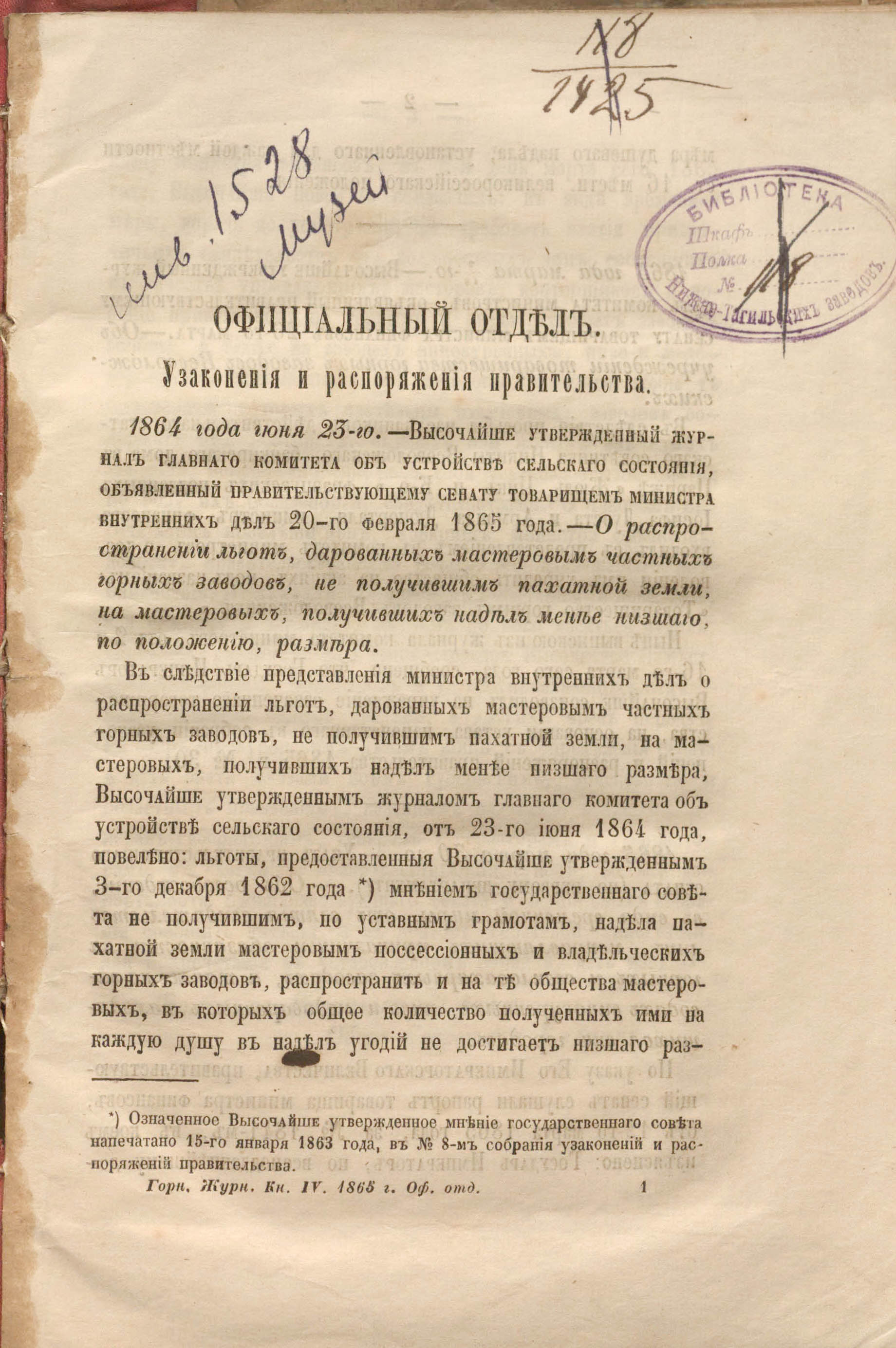 «Библиотека Нижне-Тагильских заводов.» (с. 1.).