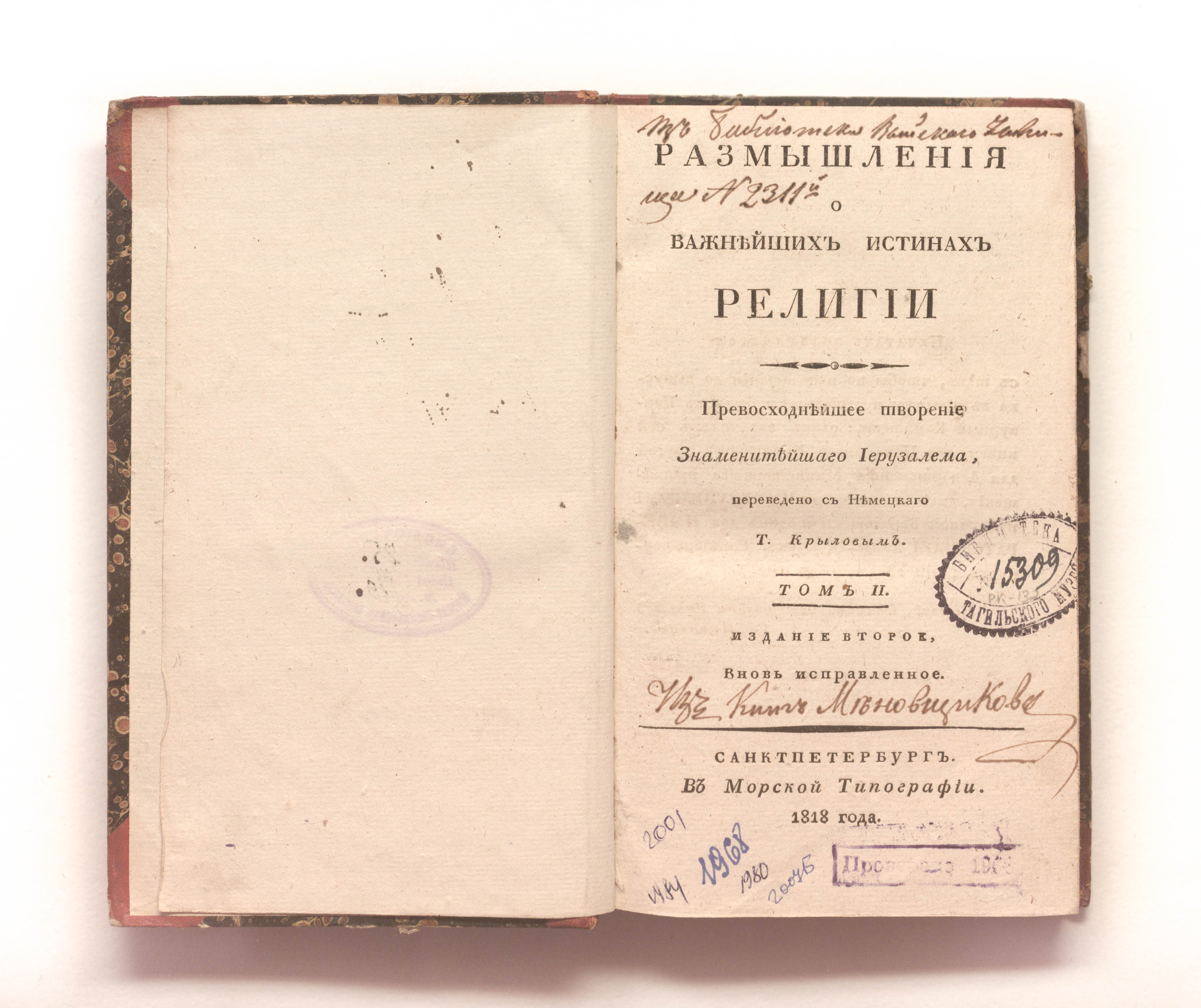 Иерузалем, Иоганн Фридрих Вильгельм (1709-1789). Размышления о важнейших истинах религии / превосходнейшее творение знаменитейшаго Иерузалема ; переведено с немецкаго Т. Крыловым. — Издание второе вновь исправленное. — Т. 2. — Санкт-Петербург : в Морской типографии, 1818. — [2], 248 с. ; 21х13 см.
