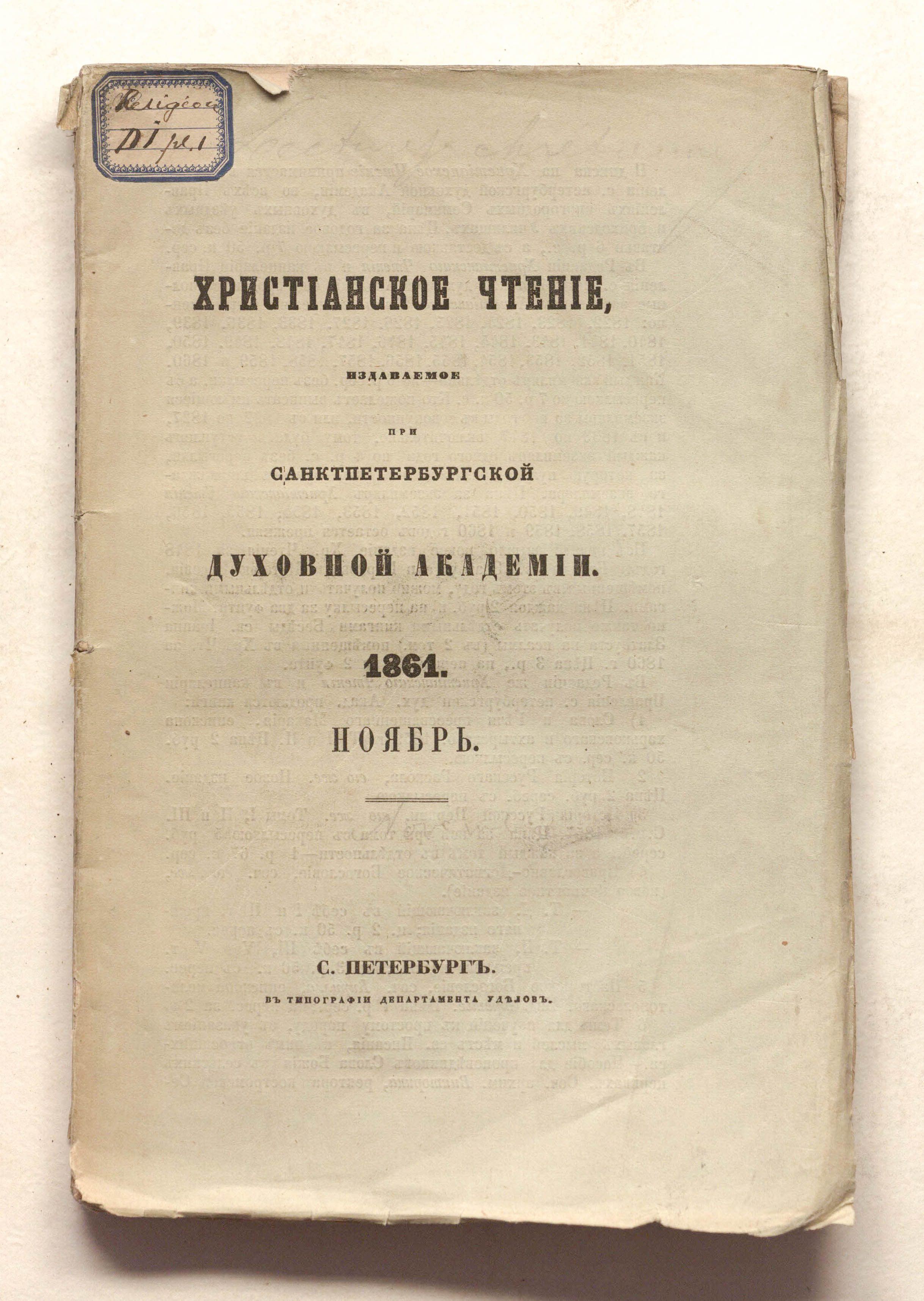 Христианское чтение, издаваемое при Санктпетербургской духовной академии. – Санкт-Петербург : тип. Департамента Уделов, 1861. № 11. Ноябрь. – разд. паг. ; 25х17 см.