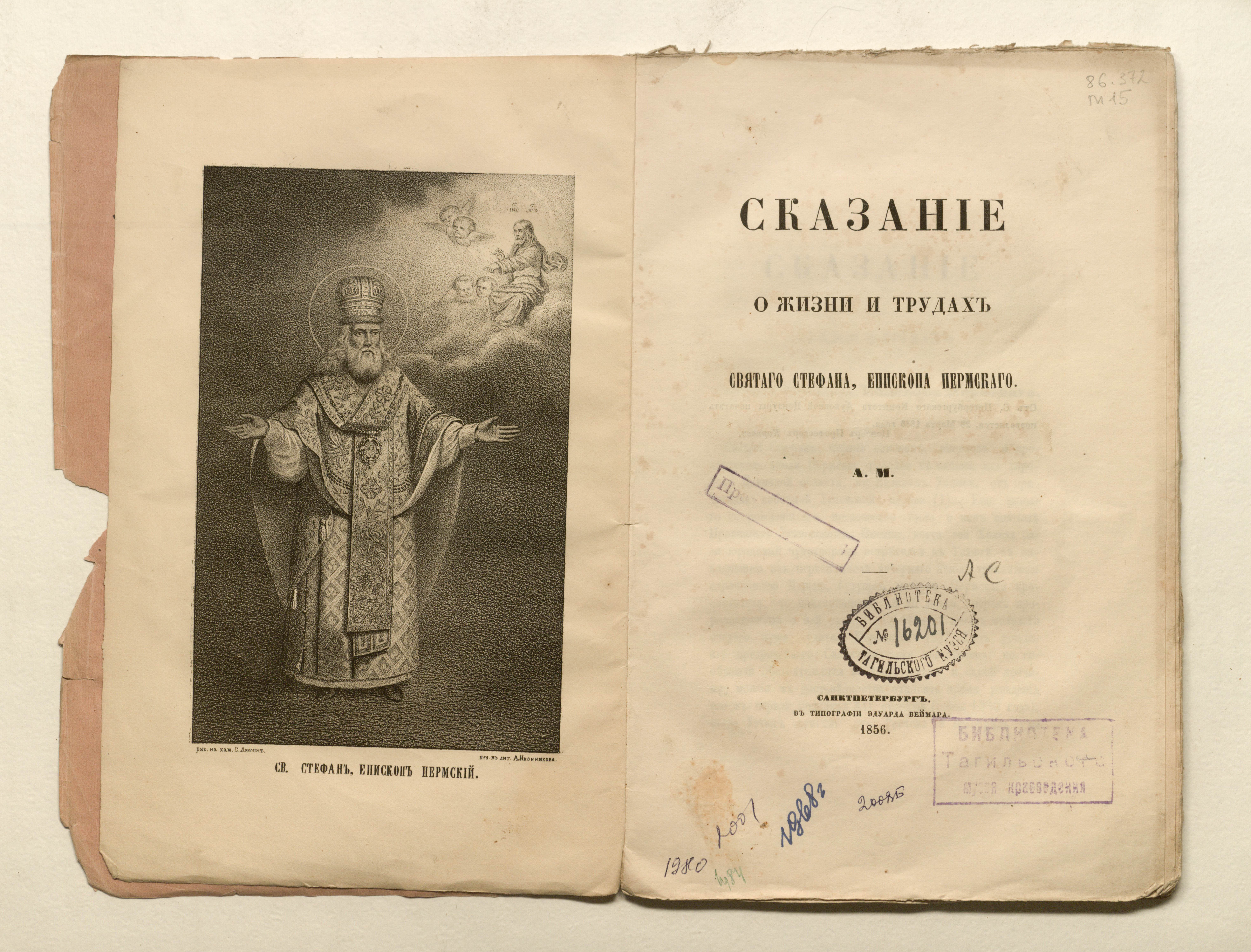 Сказание о жизни и трудах святого Стефана, епископа Пермскаго / А. М. — Санкт-Петербург : в типографии Эдуарда Веймара, 1856. — 67 с. : 1 л. фронт. (ил.), портр. ; 25.5х17 см.