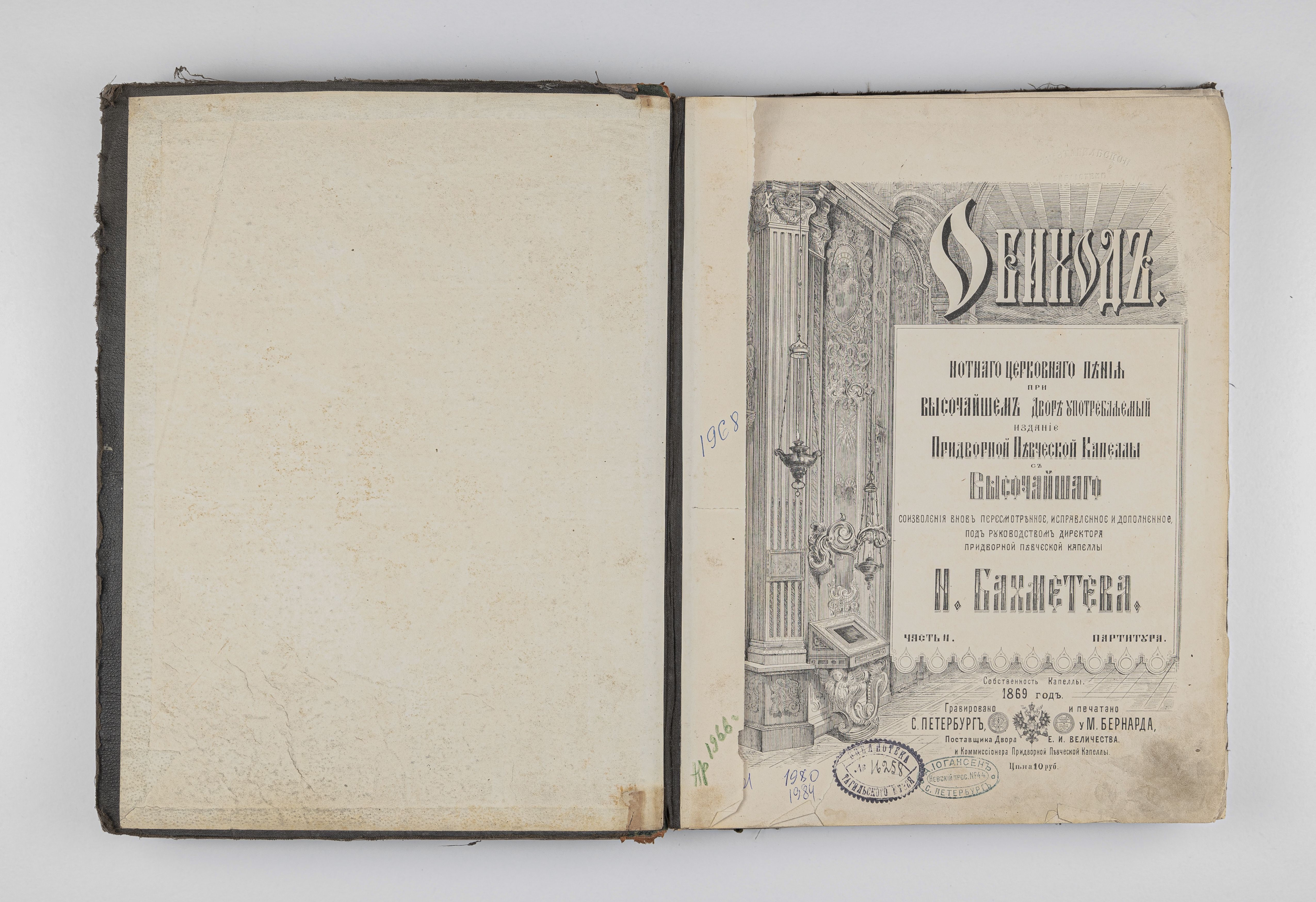Бахметев, Н И. (1807-1891). Обиход нотного церковного пения ... : [Ноты : музыкальное произведение, хоровое] / Н. Бахметев. – Санкт-Петербург : гравировано и печатано у М. Бернарда, 1869.