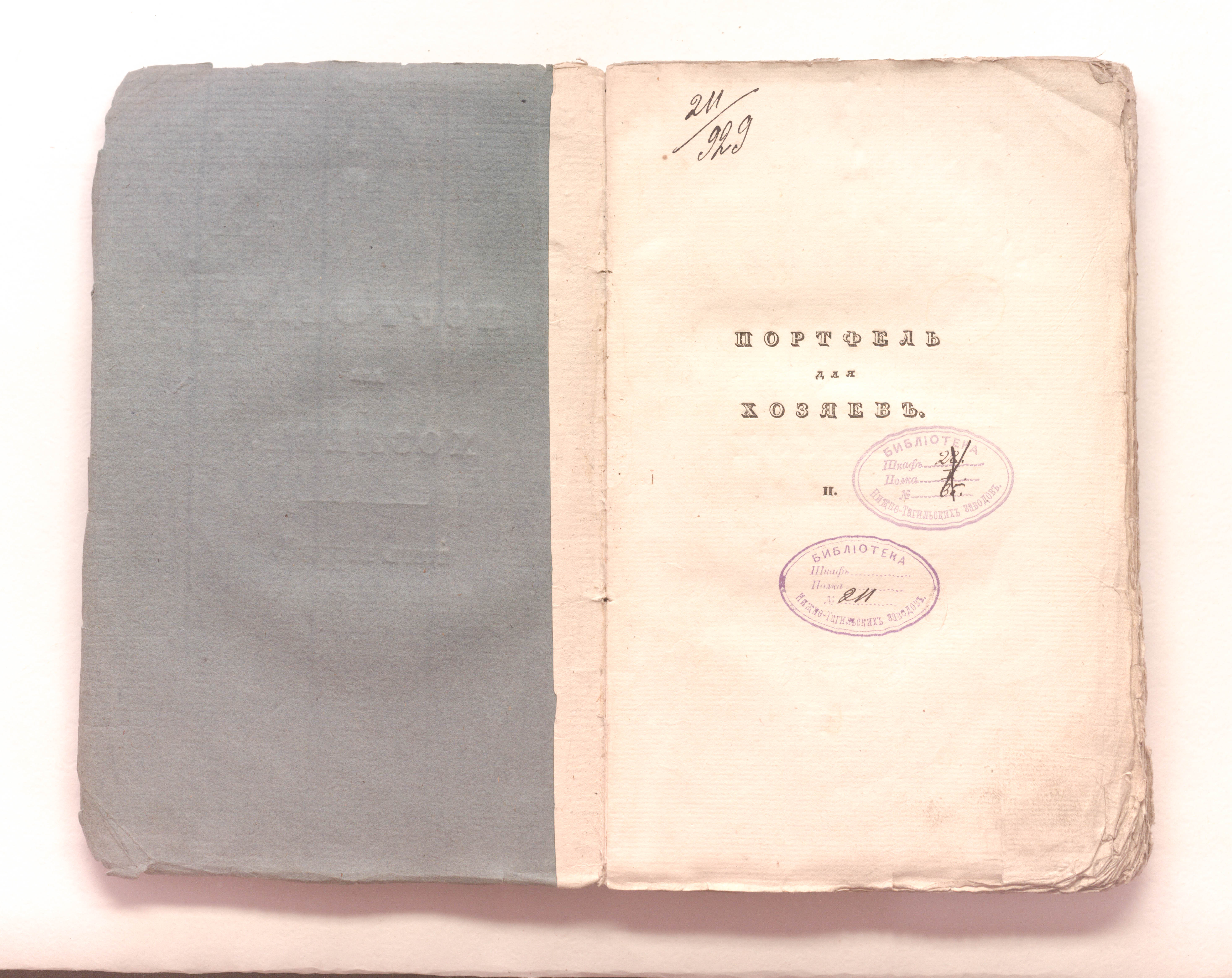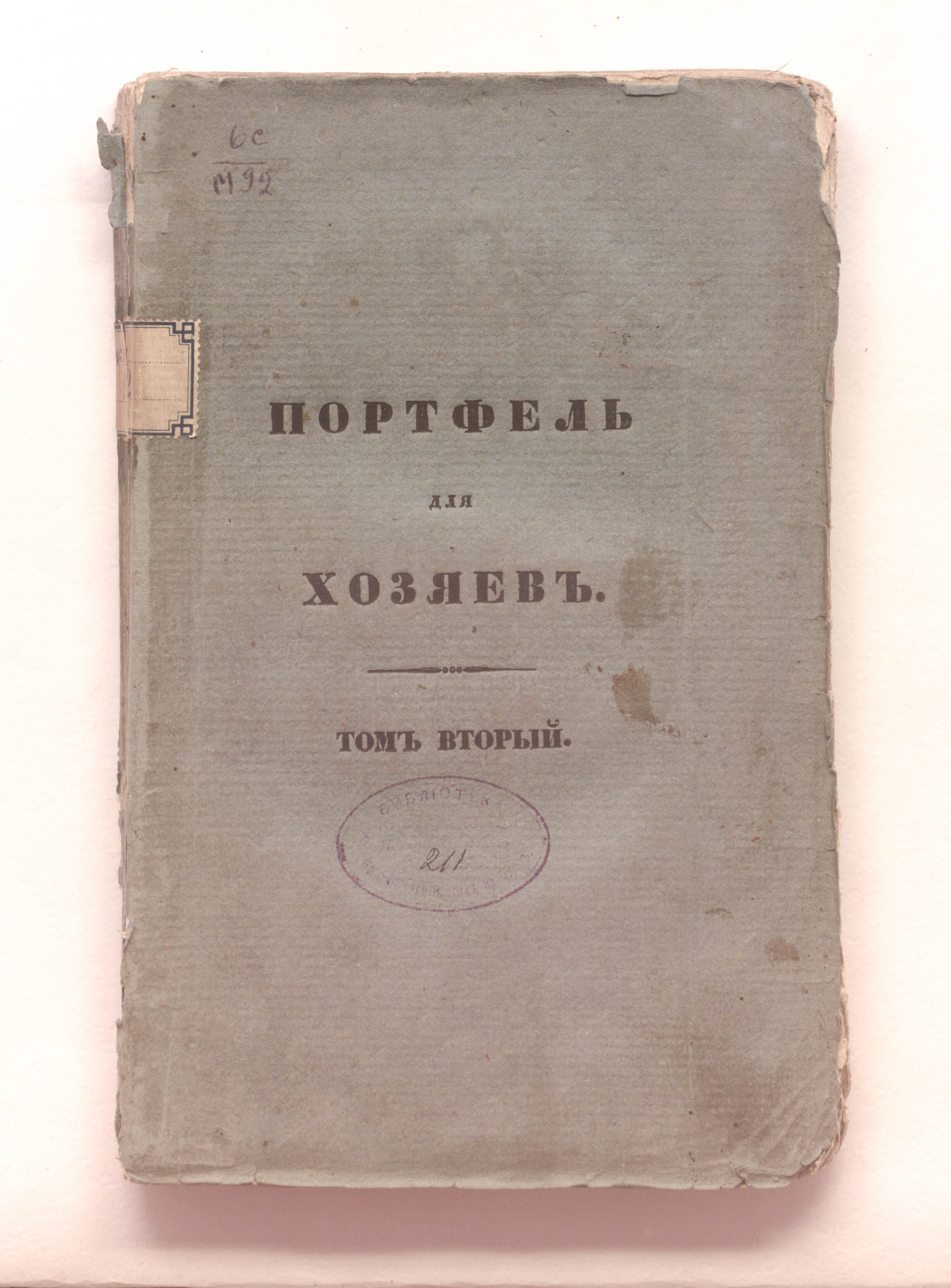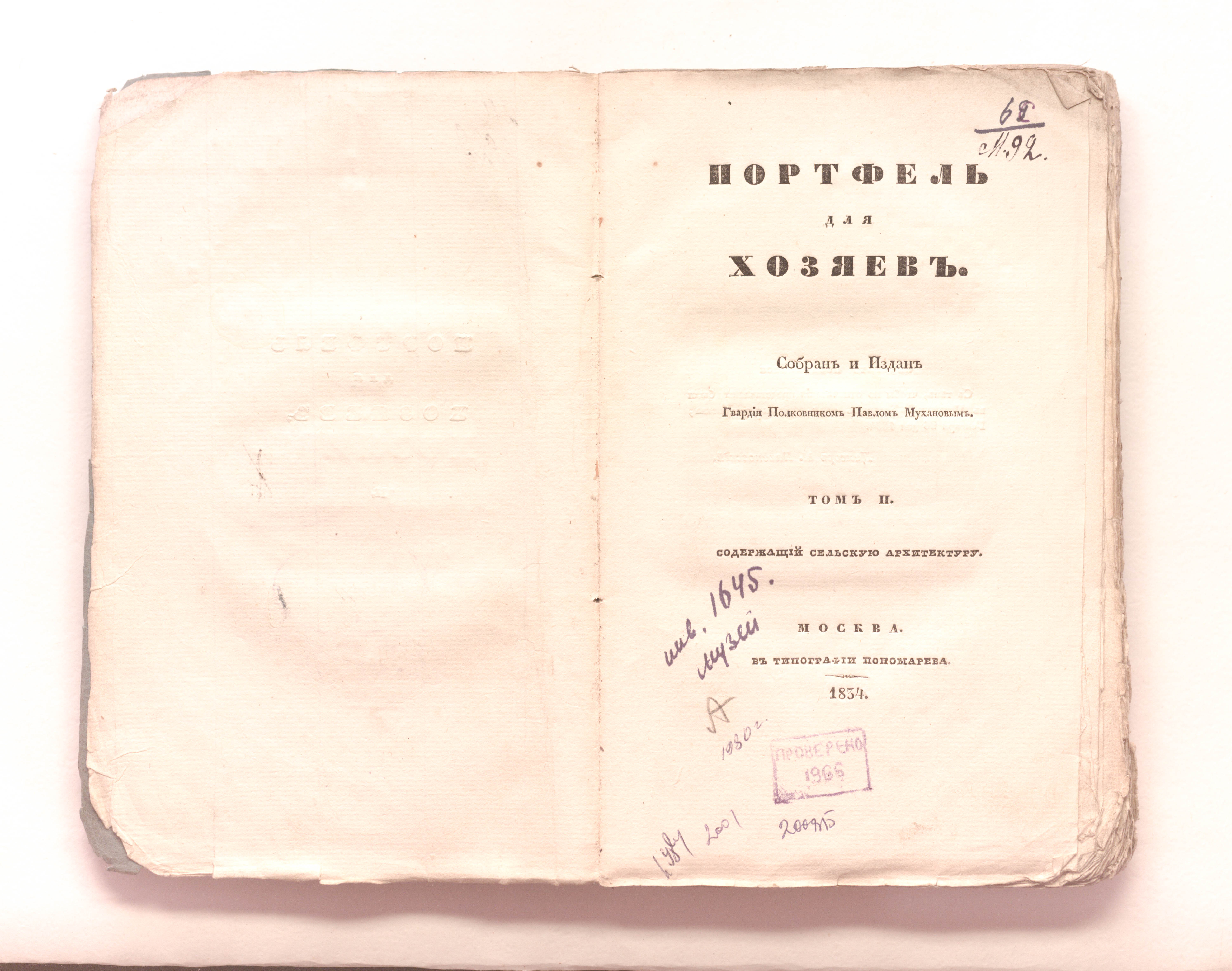 Портфель для хозяев. Т. 2. Содержащий сельскую архитектуру / Собран и издан Гвардии Полковником Павлом Мухановым. — Москва : в тип. Пономарева, 1834. — IX, [2], 213 с. ; 24х15 см.