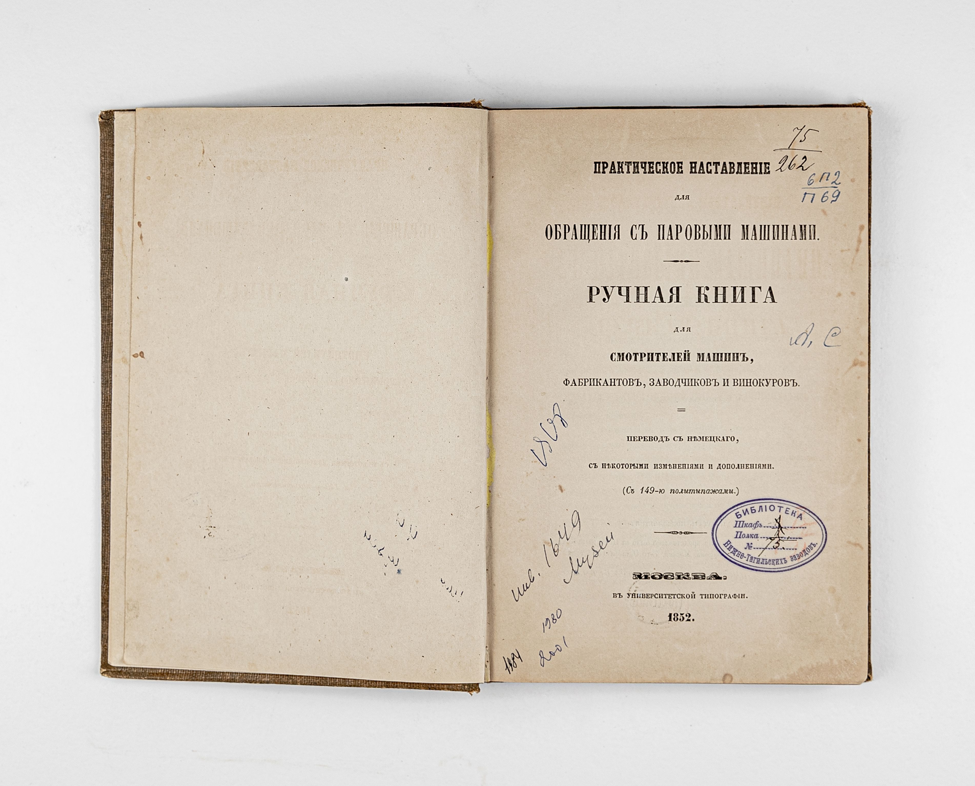 Шолль, Е. Ф. Практическое наставление для обращения с паровыми машинами : Ручная книга для смотрителей машин, фабрикантов, заводчиков и винокуров : Пер. с нем., с некоторыми изм. и доп. : С 149 политипажами / Соч. инж. Шолля. – Москва : Унив. тип., 1852. – 323 с. : ил. ; 24х16 см.
